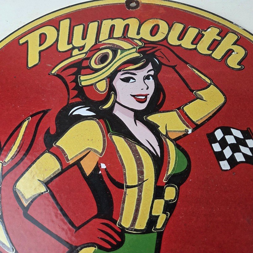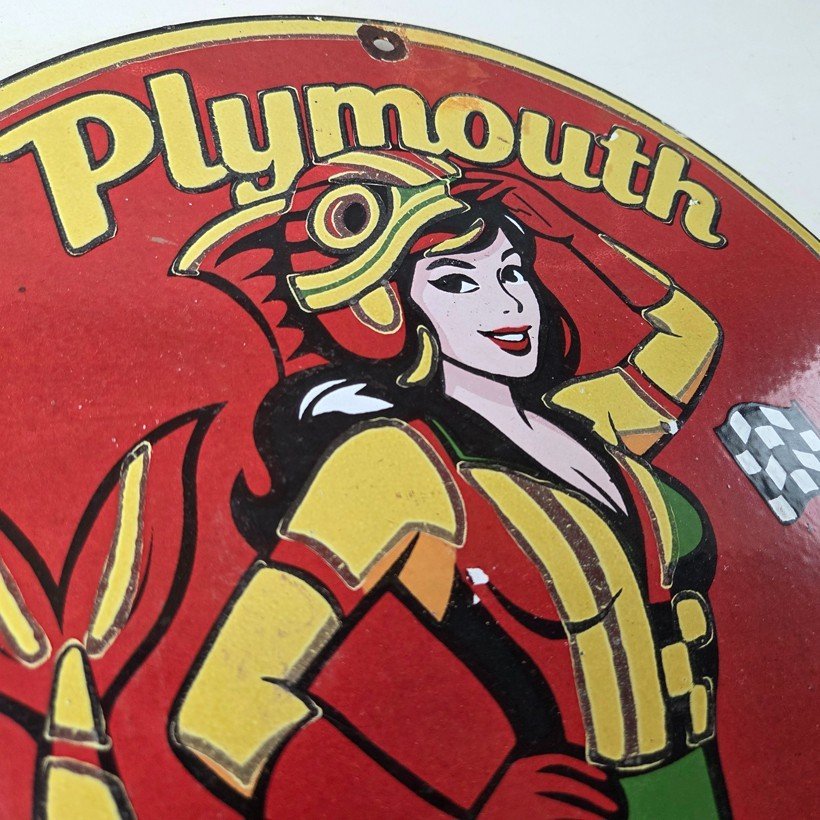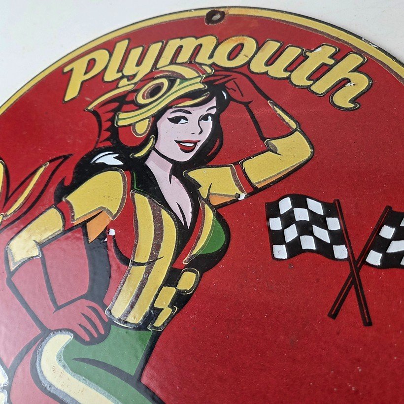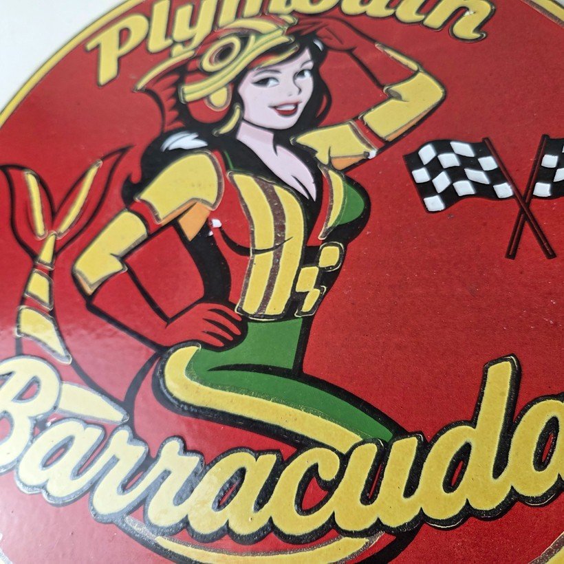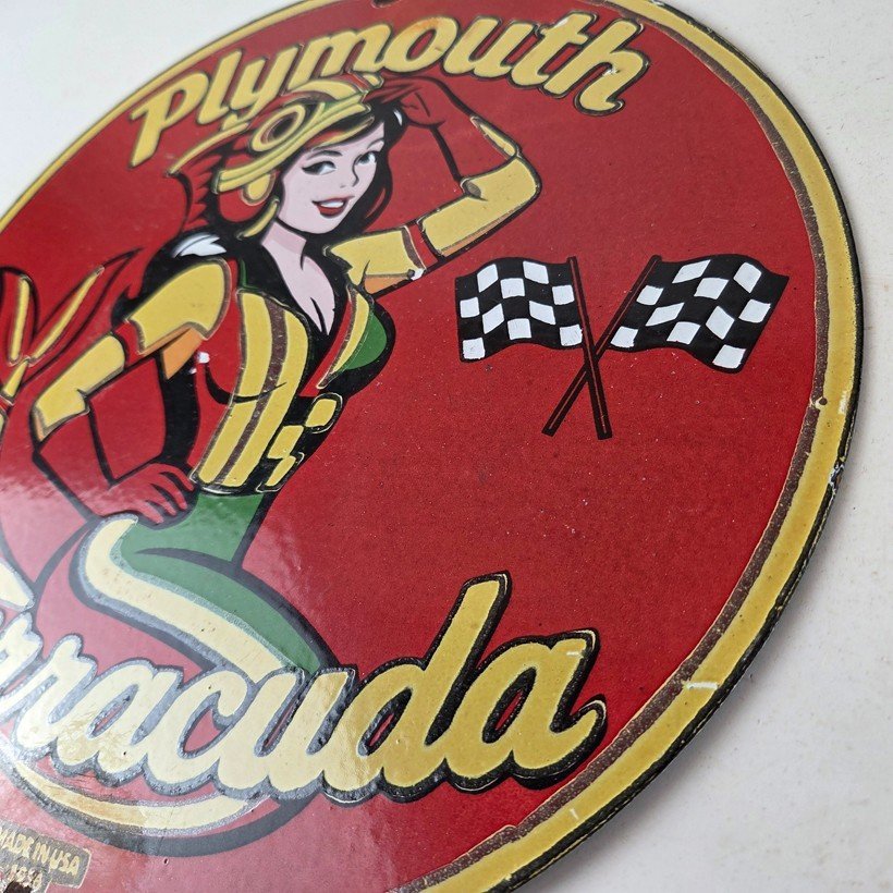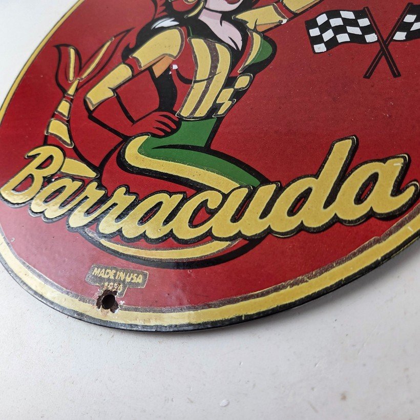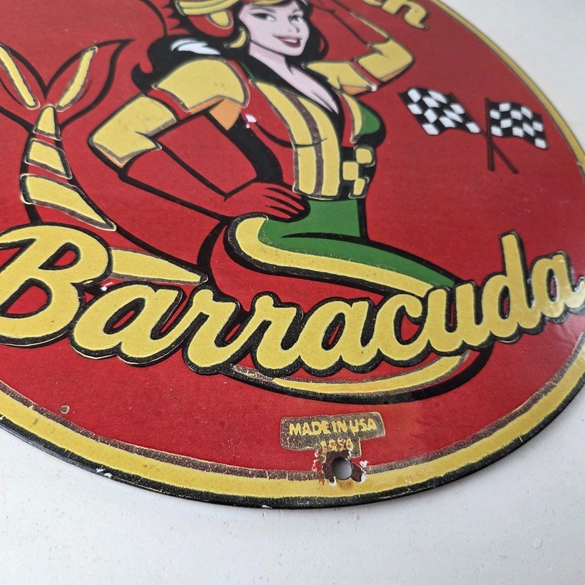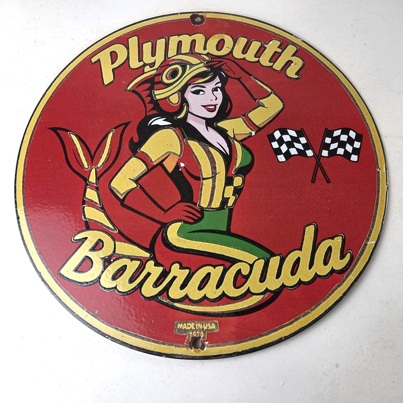 This vintage porcelain sign features the iconic Plymouth Barracuda lettering, making it a must-have for any Plymouth enthusiast. Measuring 12″ in size, it’s perfect for displaying on a wall or as part of a collection. The sign’s colors make it eye-catching and visually appealing. This sign has excellent vibrant colors, porcelain & gloss!