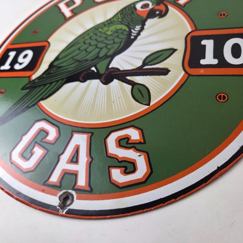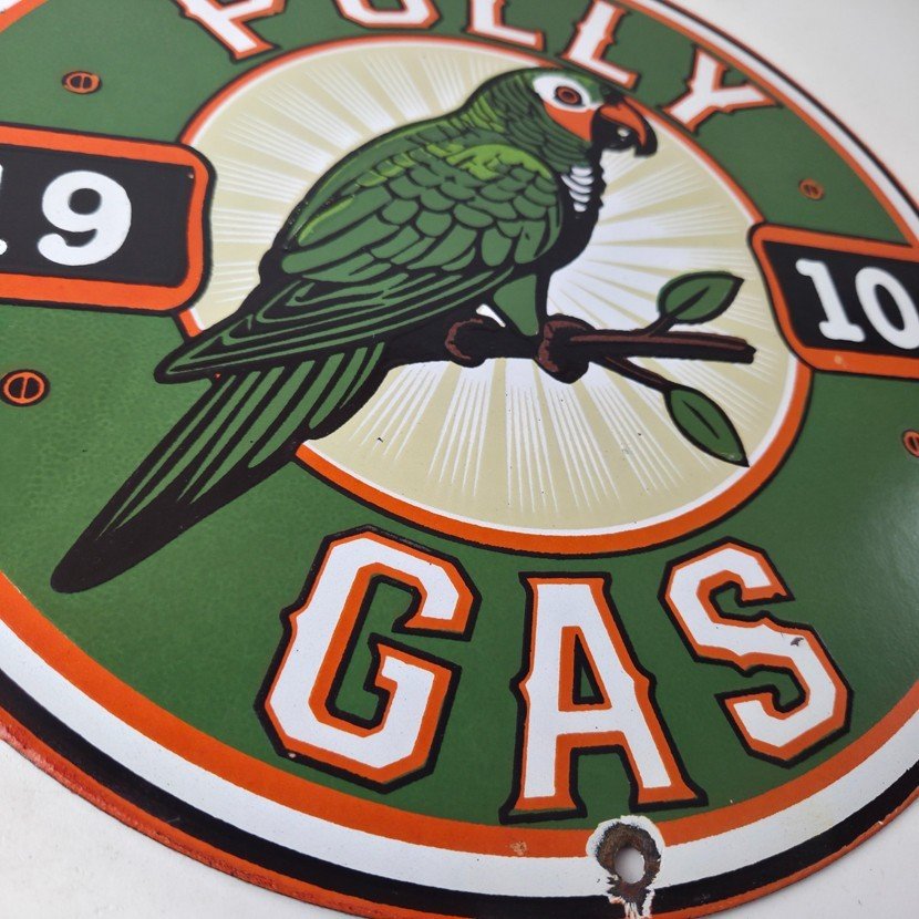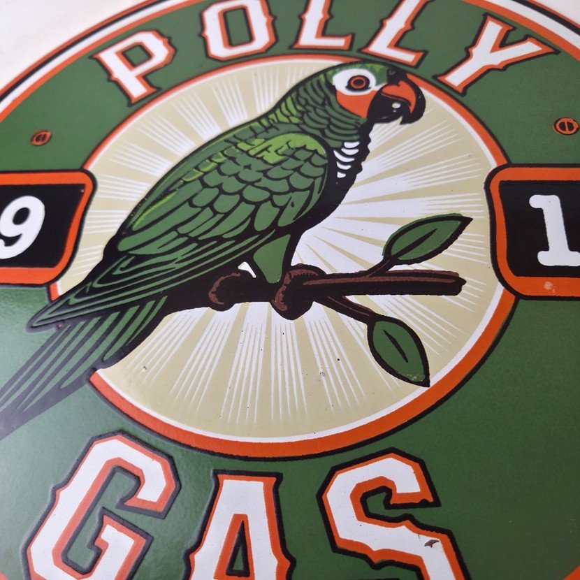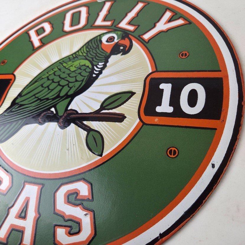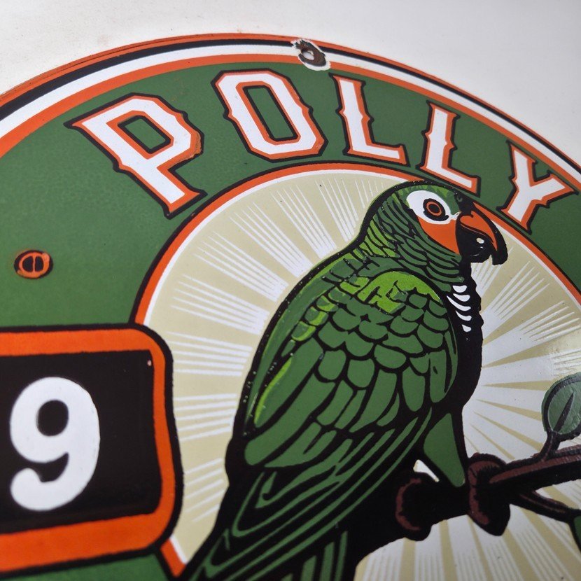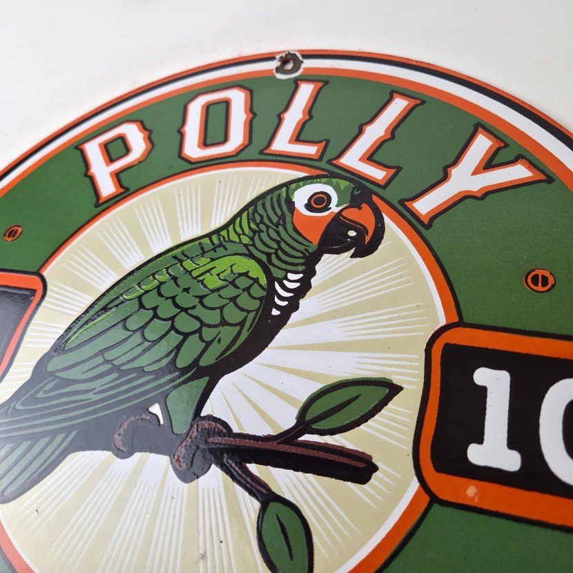 This vintage porcelain sign features Polly the parrot. The sign measures 12 inches and has a colorful design with excellent porcelain. It is a great piece of gas and oil advertising memorabilia for collectors, retro man cave decor or your shop or garage. The sign is in excellent condition and can be combined with other items for shipping at a rate of $5 per additional item.