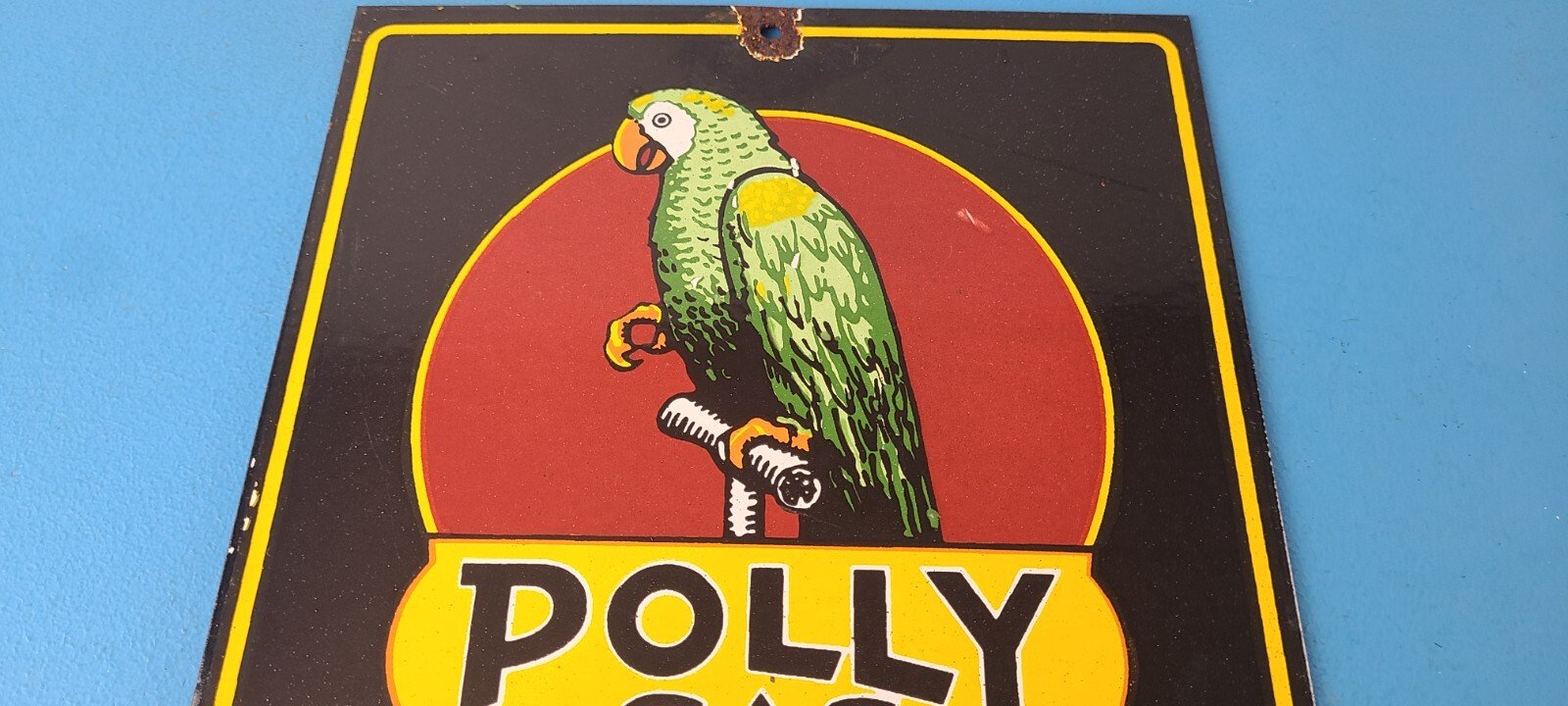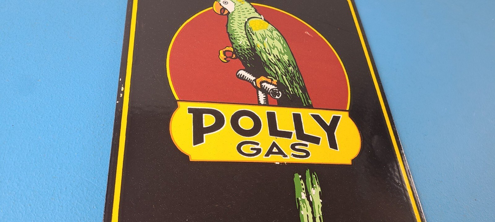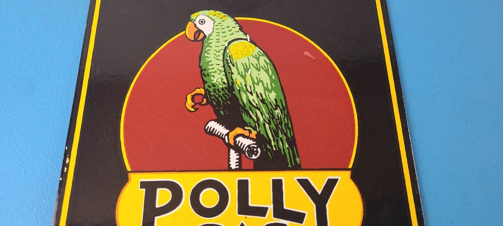 This vintage porcelain sign features Polly the parrot. The sign measures 12 inches and has a colorful design with excellent porcelain. It is a great piece of gas and oil advertising memorabilia for collectors, retro man cave decor or your shop or garage. The sign is in excellent condition and can be combined with other items for shipping at a rate of $5 per additional item.