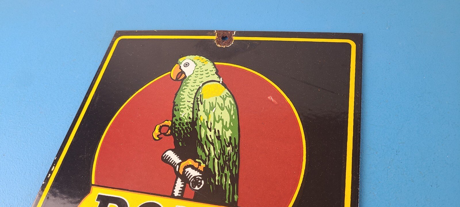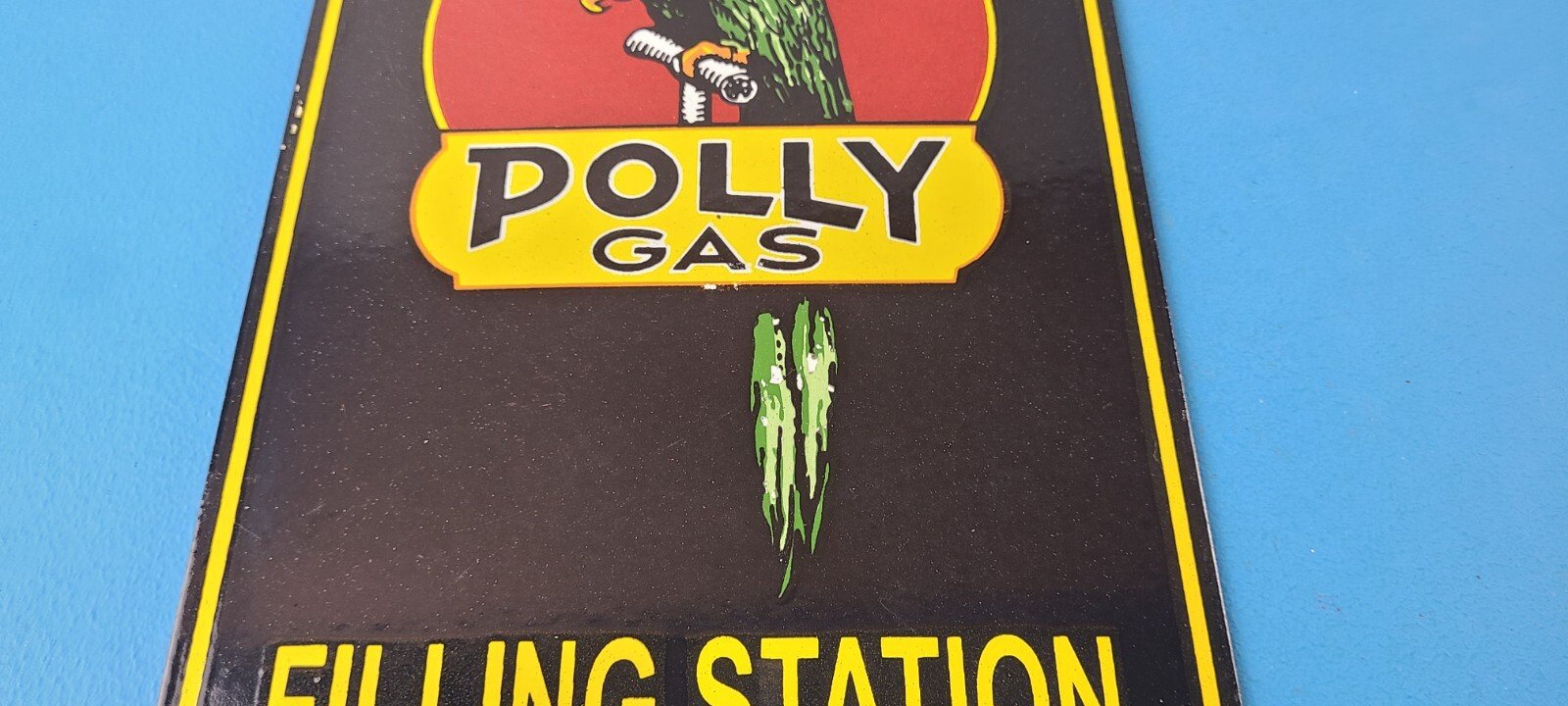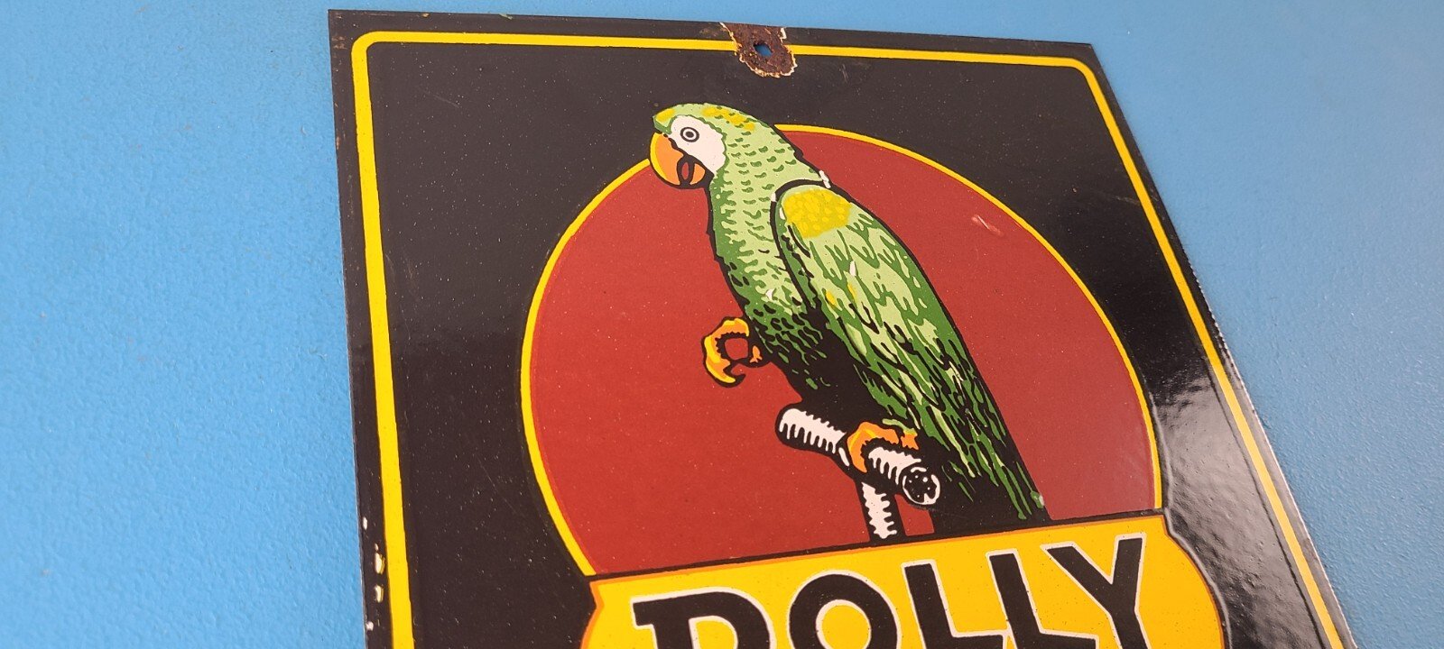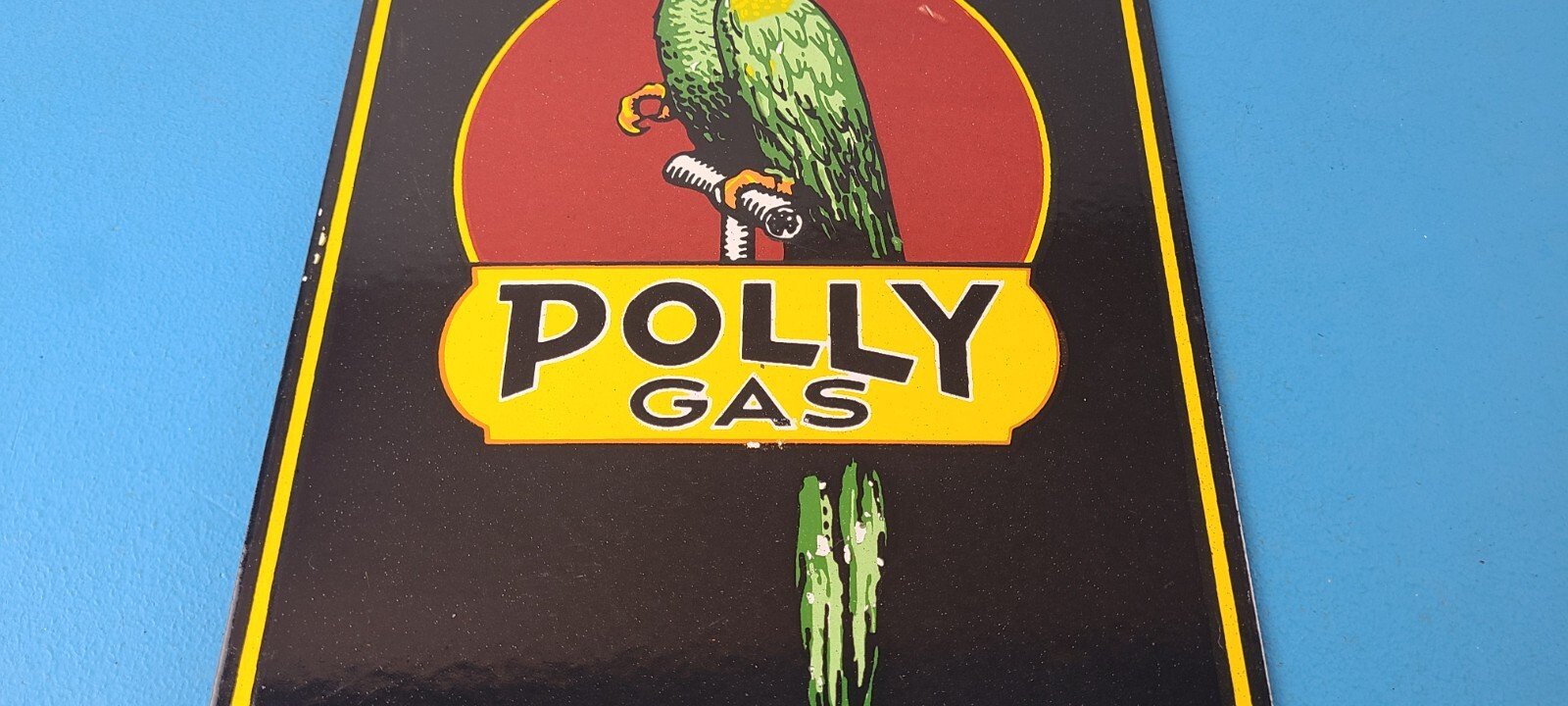 This vintage porcelain sign features Polly the parrot. The sign measures 12 inches and has a colorful design with excellent porcelain. It is a great piece of gas and oil advertising memorabilia for collectors, retro man cave decor or your shop or garage. The sign is in excellent condition and can be combined with other items for shipping at a rate of $5 per additional item.