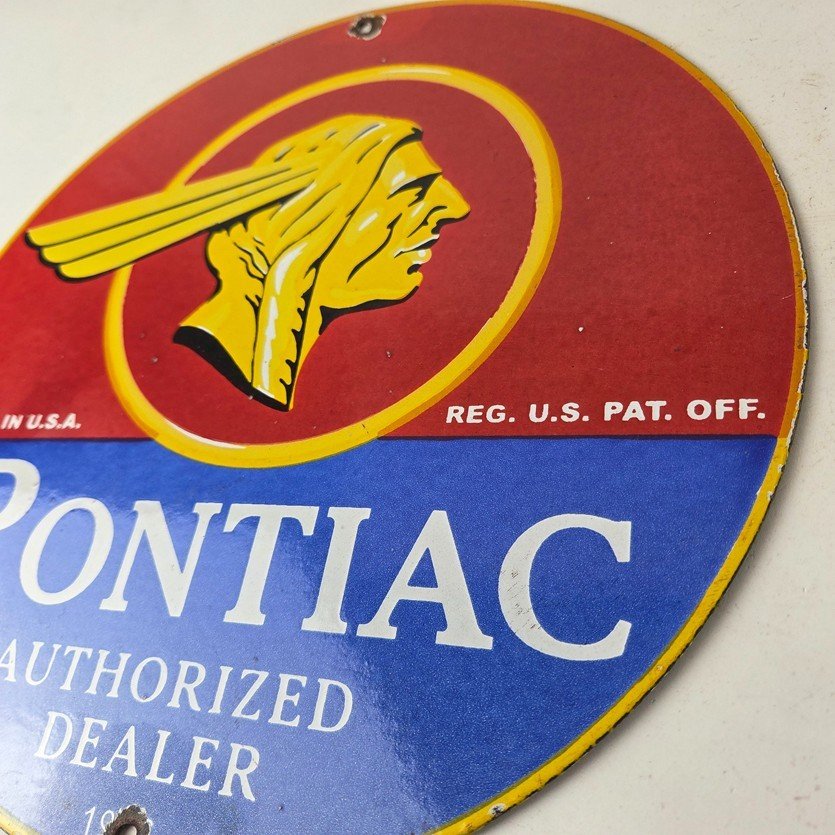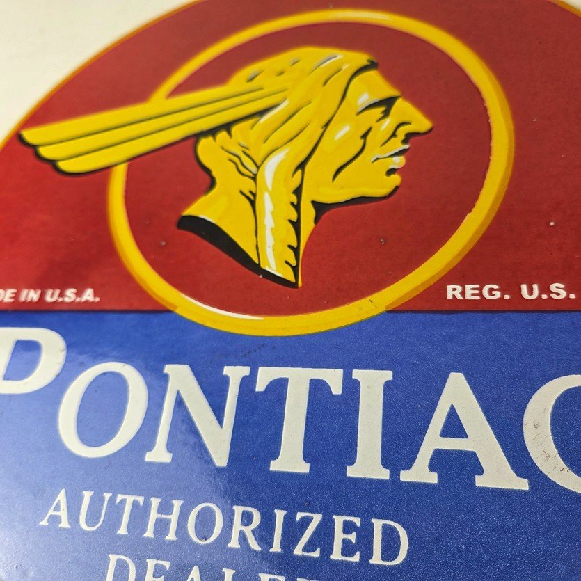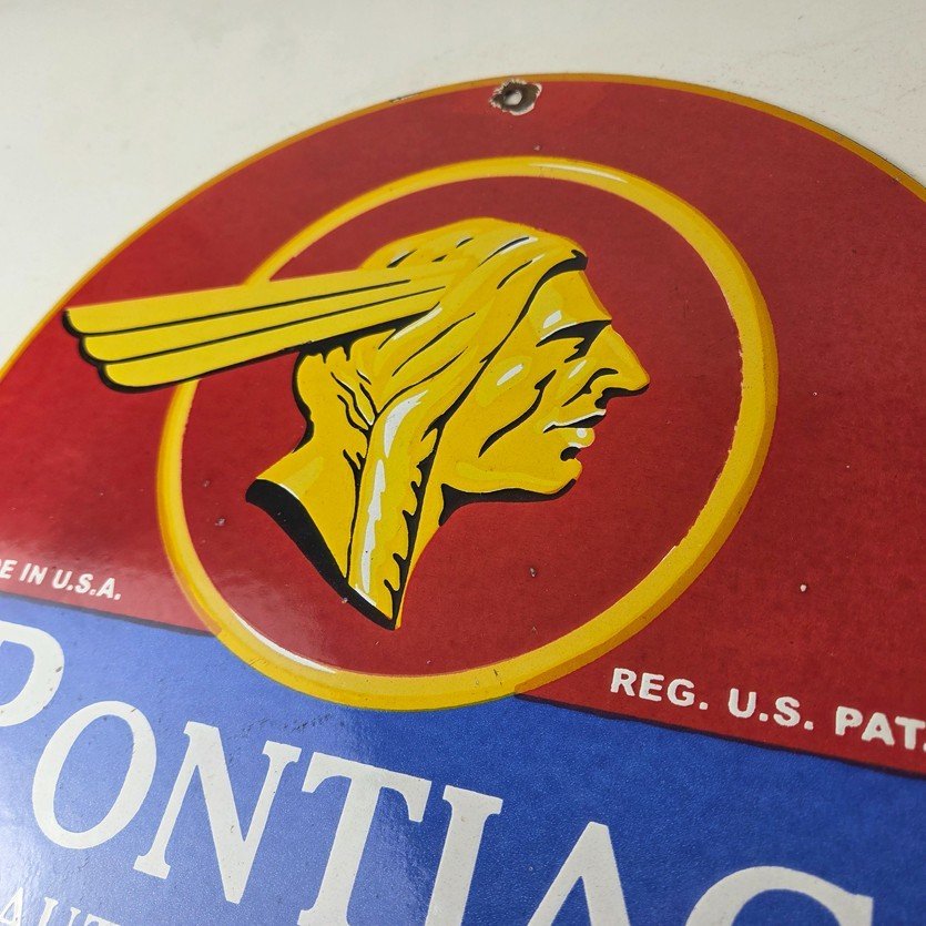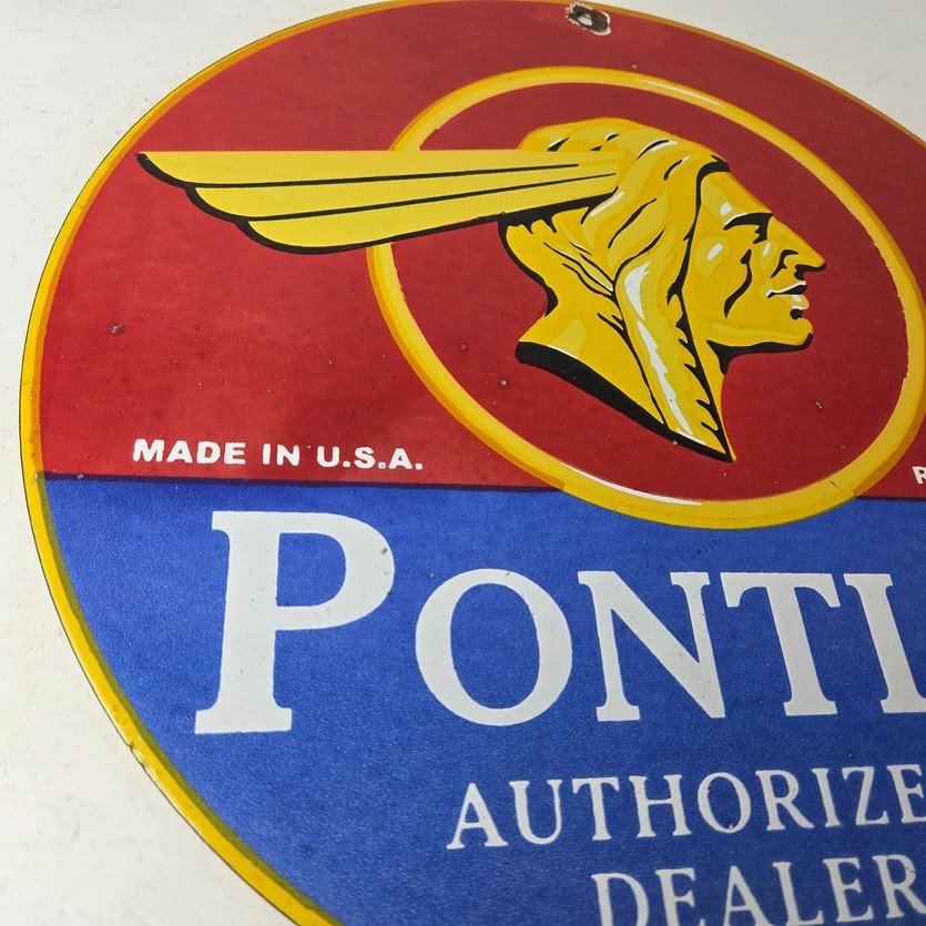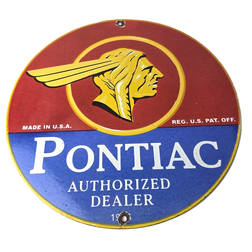 This vintage Pontiac Sales & Service porcelain sign features the large red face with headdress. The colorful 12″ sign has vibrant colors that make it stand out, and its type of advertising will fit nicely with any collection especially a garage shop. The brand is Pontiac, which is the most iconic automobile brand.
