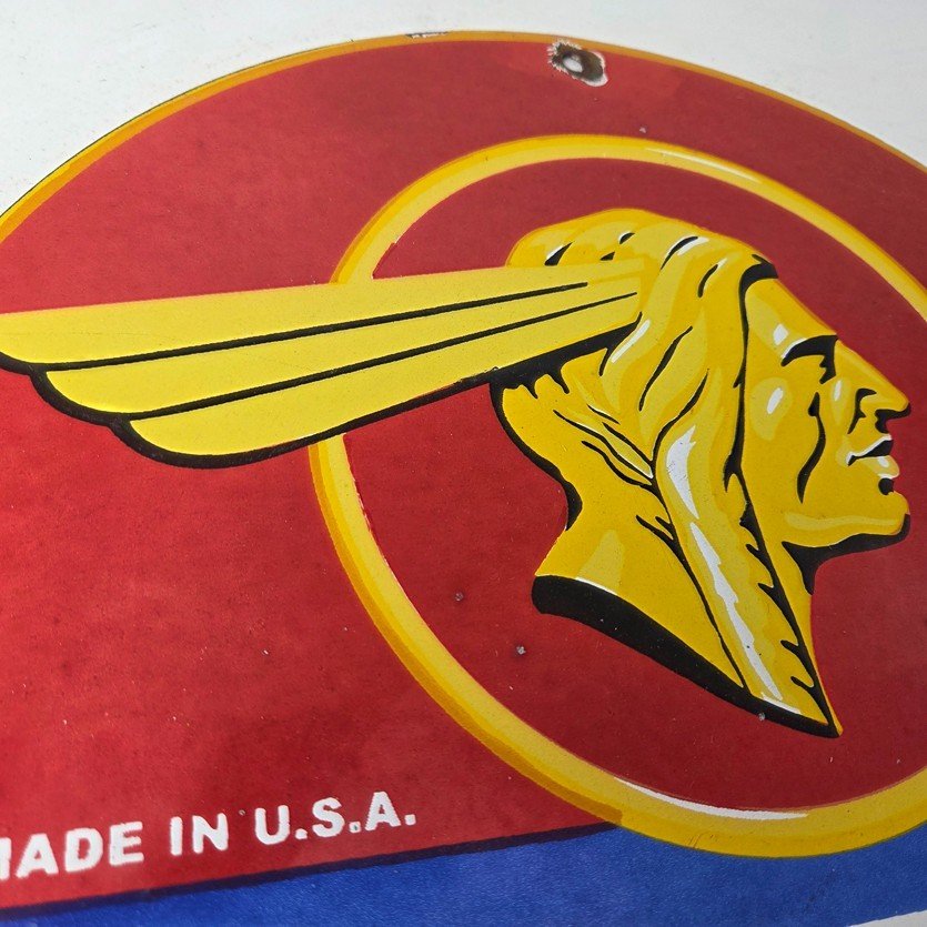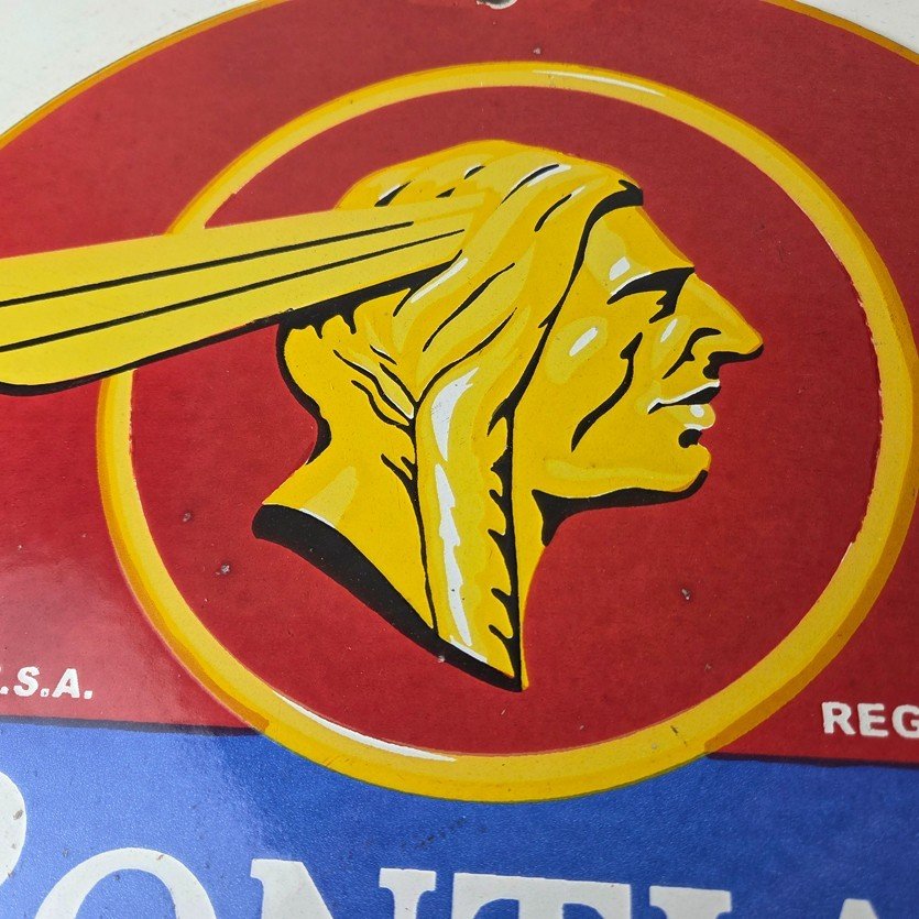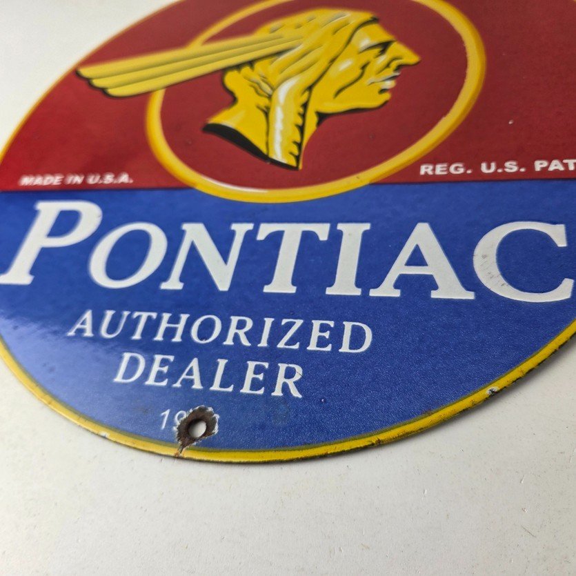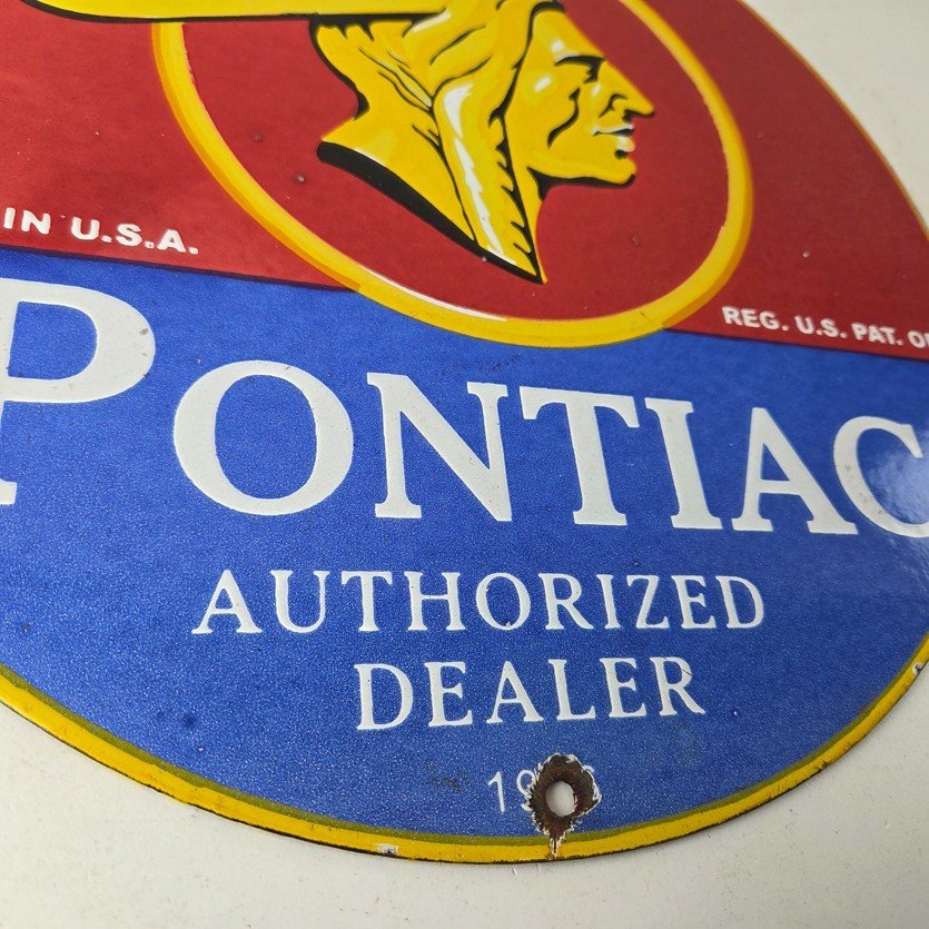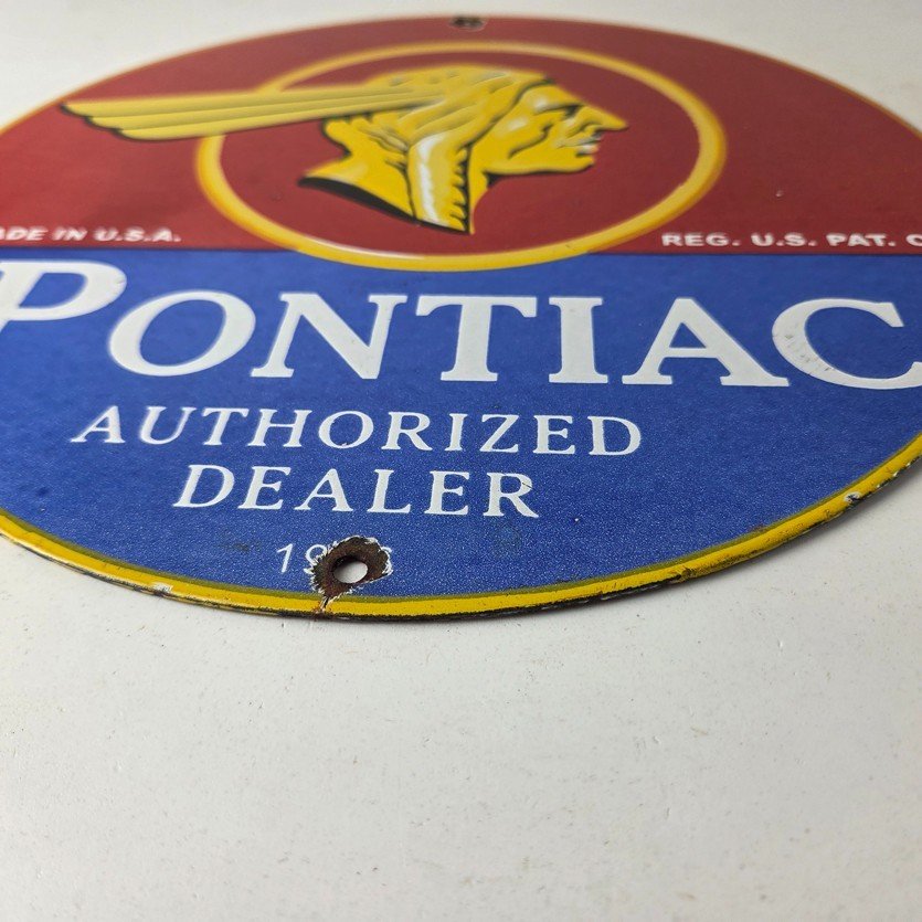 This vintage Pontiac Sales & Service porcelain sign features the large red face with headdress. The colorful 12″ sign has vibrant colors that make it stand out, and its type of advertising will fit nicely with any collection especially a garage shop. The brand is Pontiac, which is the most iconic automobile brand.