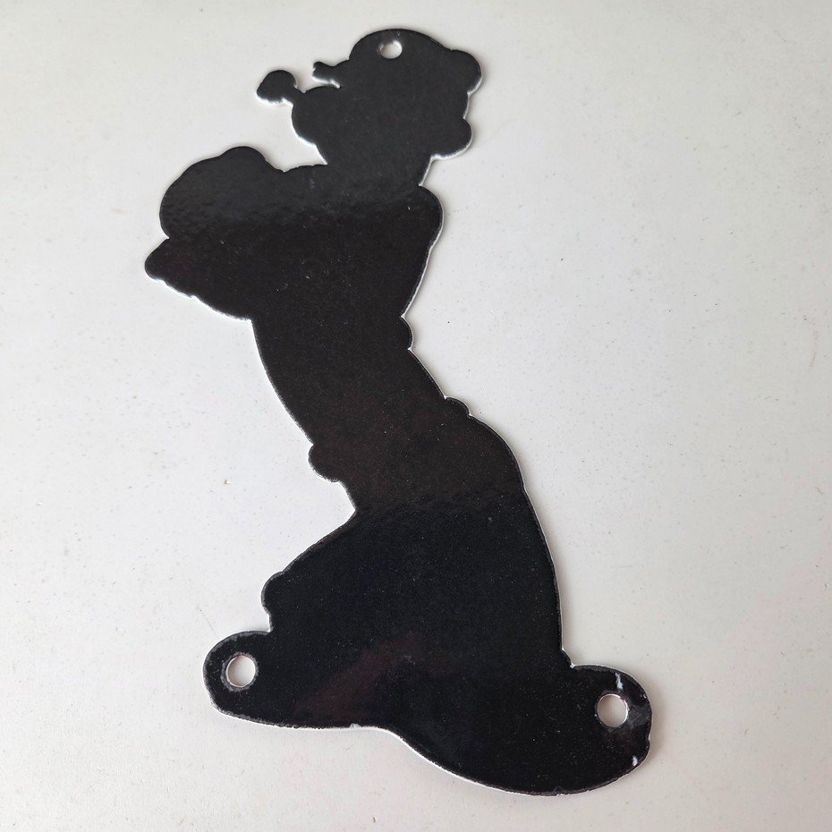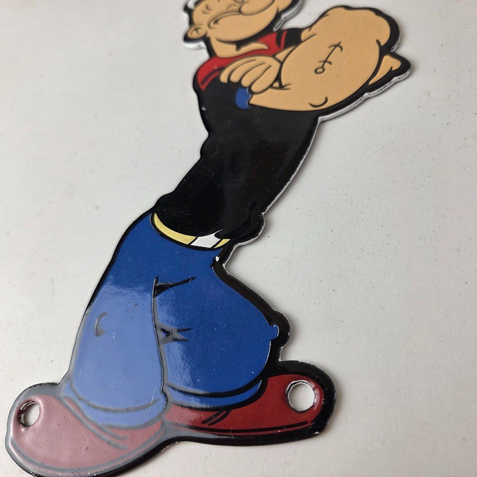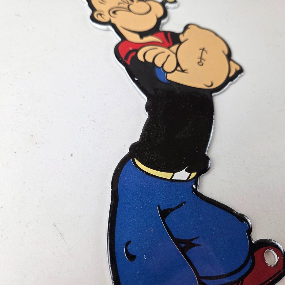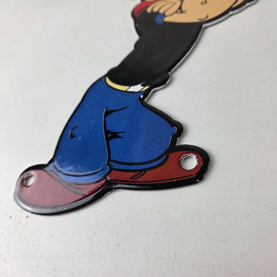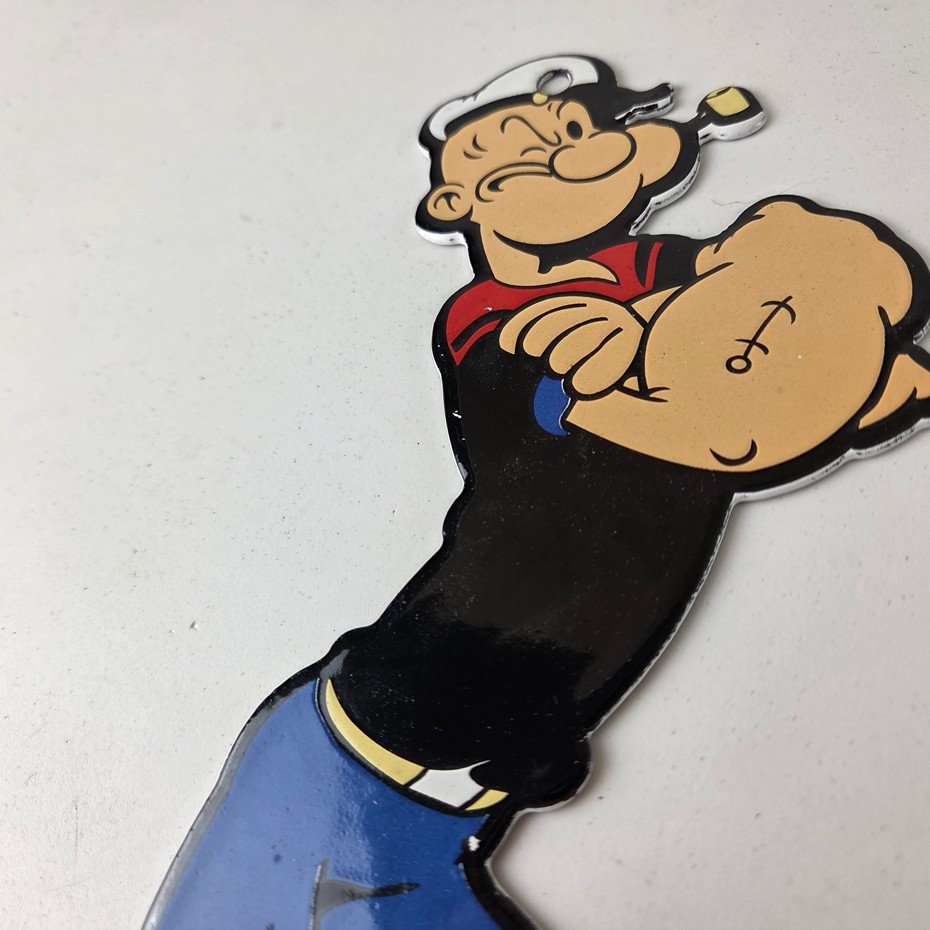 This is a vintage Popeye Porcelain sign measuring 8″ x 4″. This sign is perfect for any soda or gas themed space. Made of porcelain on both sides, this sign features Popeye as the main character. This sign is perfect for collectors of all kinds, whether you’re a fan of Popeye or just love the vintage aesthetic. Display it in your home bar, game room, man cave, or garage.