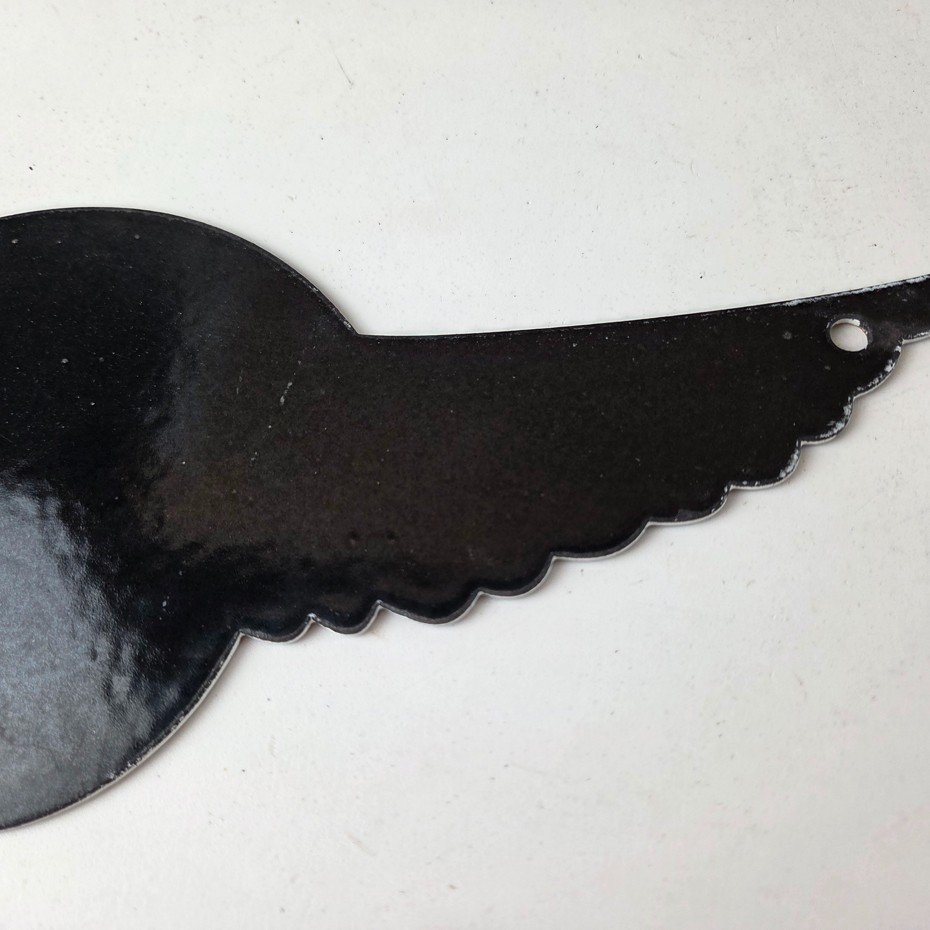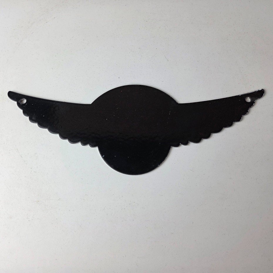 This vintage porcelain sign featuring the Curtiss Propeller brand with lettering at the top that says Well Keepem Flying. The sign boasts a beautiful graphic of the Chicken wings, with excellent porcelain and colors. The sign is in great condition and would make a wonderful addition to any collection or display.