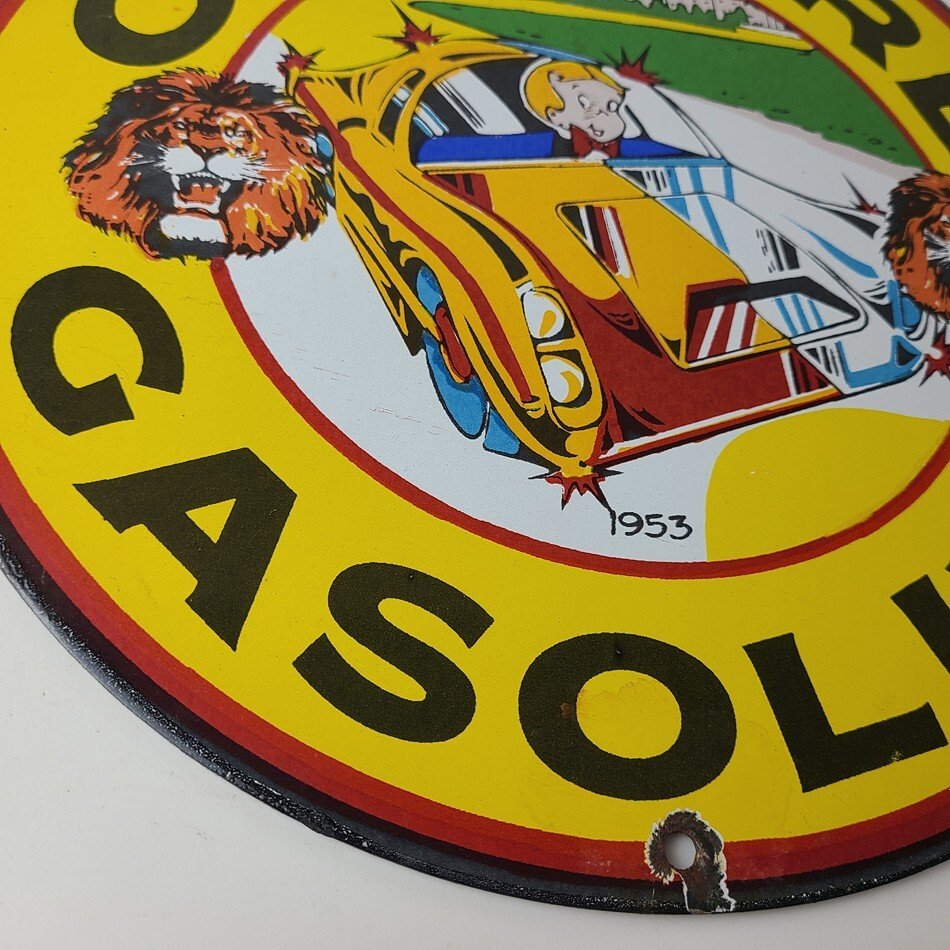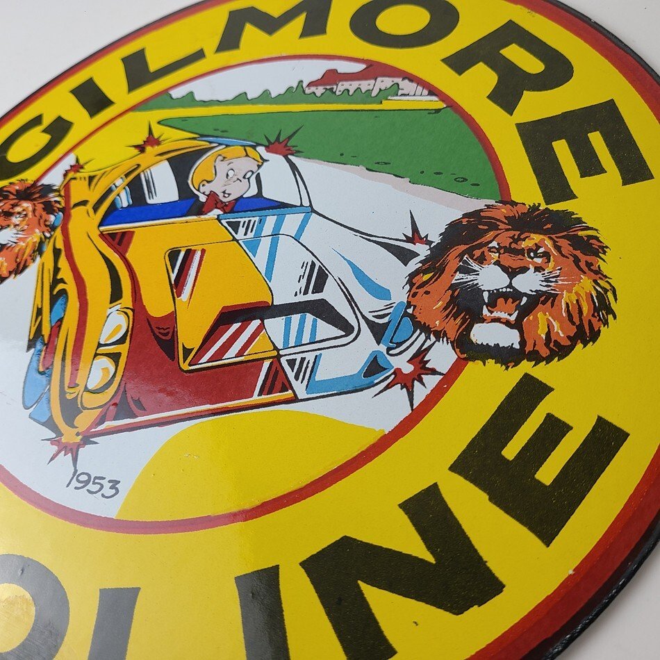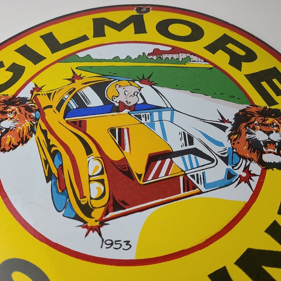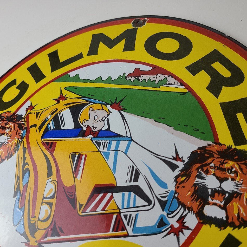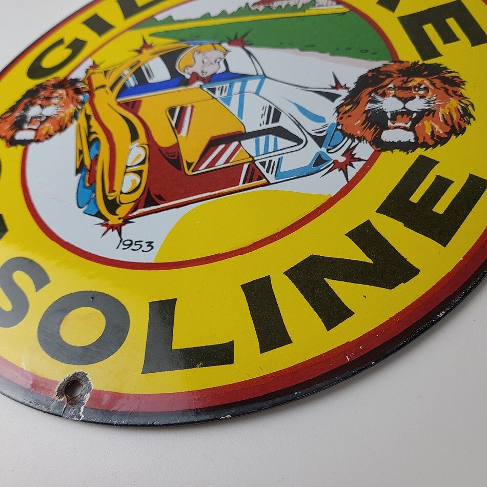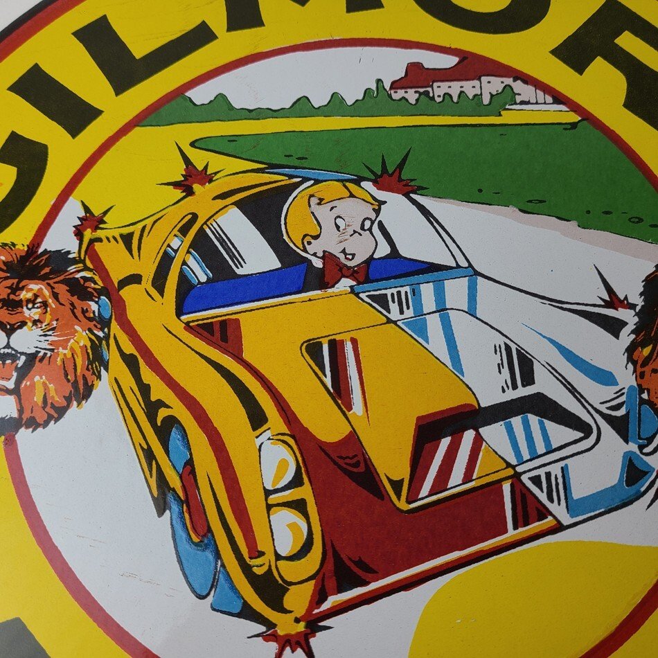 This vintage porcelain sign features the iconic Richie Rich character advertising Gilmore Gasoline. The sign’s vibrant colors make it a great addition to any collection of gas and oil memorabilia. Measuring 12 inches, this sign is in excellent condition and would make a great addition to any collector’s display. The sign’s durable porcelain construction ensures its longevity and will be a focal point of any room.