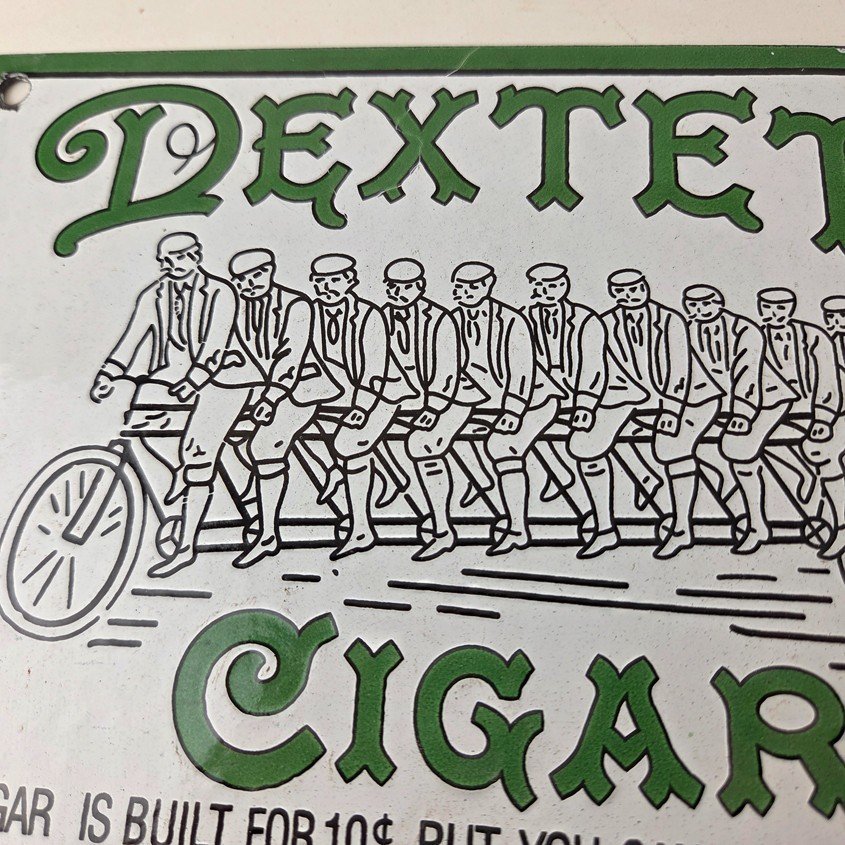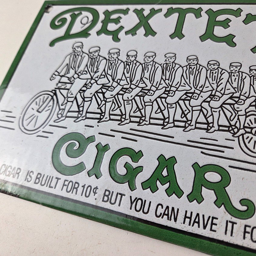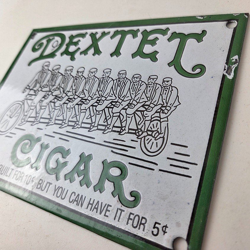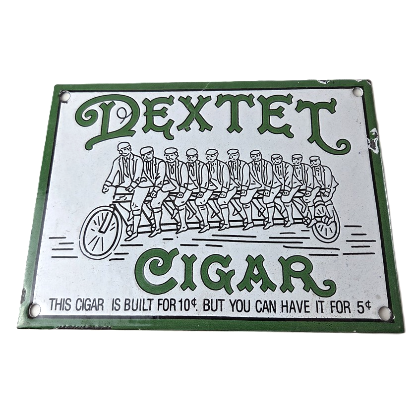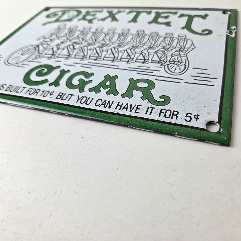 This vintage Dextel Cigars porcelain sign is perfect for collectors of tobacco, gas and oil themed merchandise and memorabilia. Measuring 8″ x 6″ with a green color and built with high-quality porcelain, this sign will surely catch the attention of anyone who sees it. The brand slogan states that the cigar is built for 10 cents, but you can have it for 5 cents, making it a unique and interesting piece to add to your collection. Especially seeing a graphic of 10 people on a tandem bicycle.