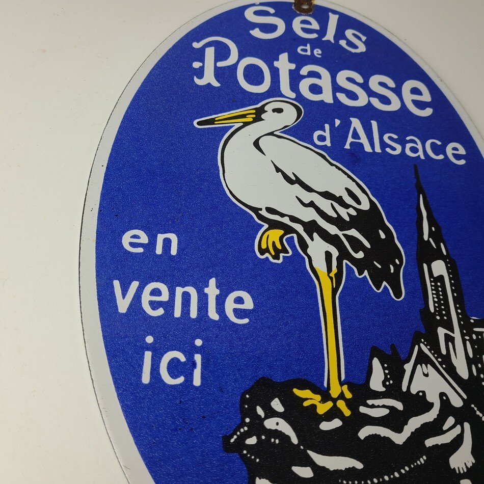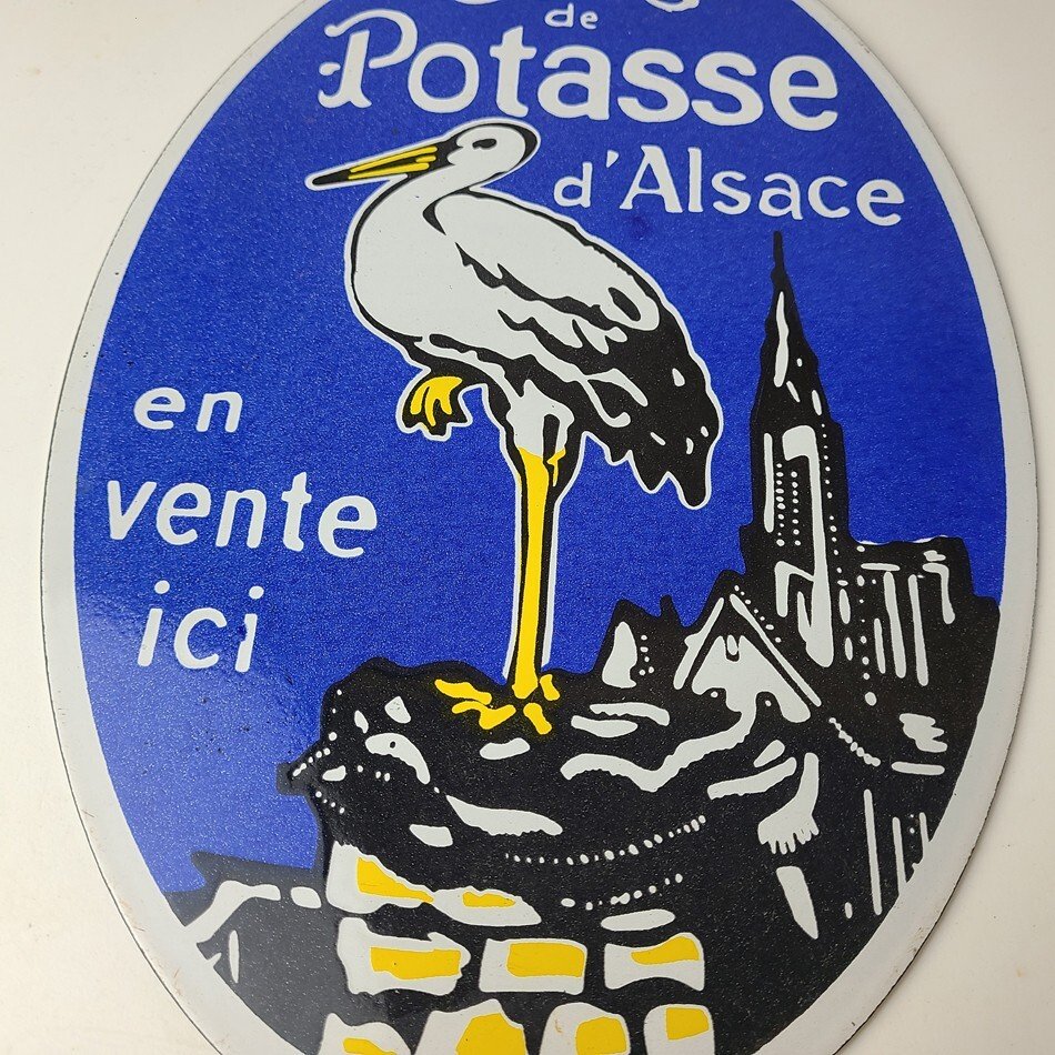 This vintage Potasse Porcelain sign features the iconic brand and is perfect for collectors of gas and oil advertising memorabilia. The sign measures 12″ by 8″ and features a vibrant blue and yellow color scheme with bold lettering.