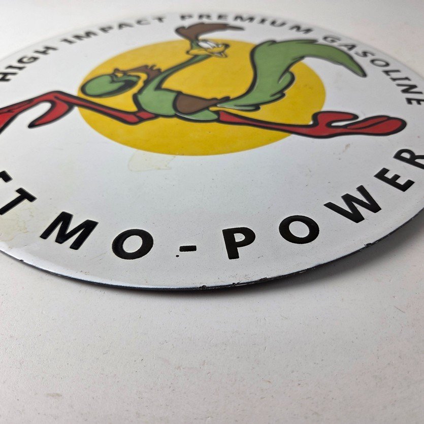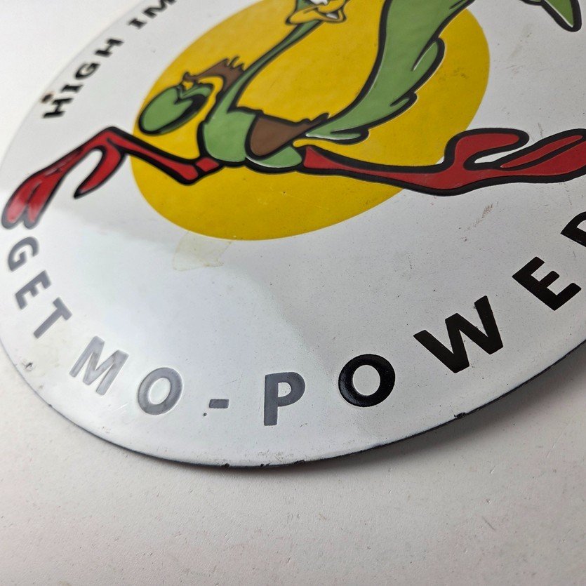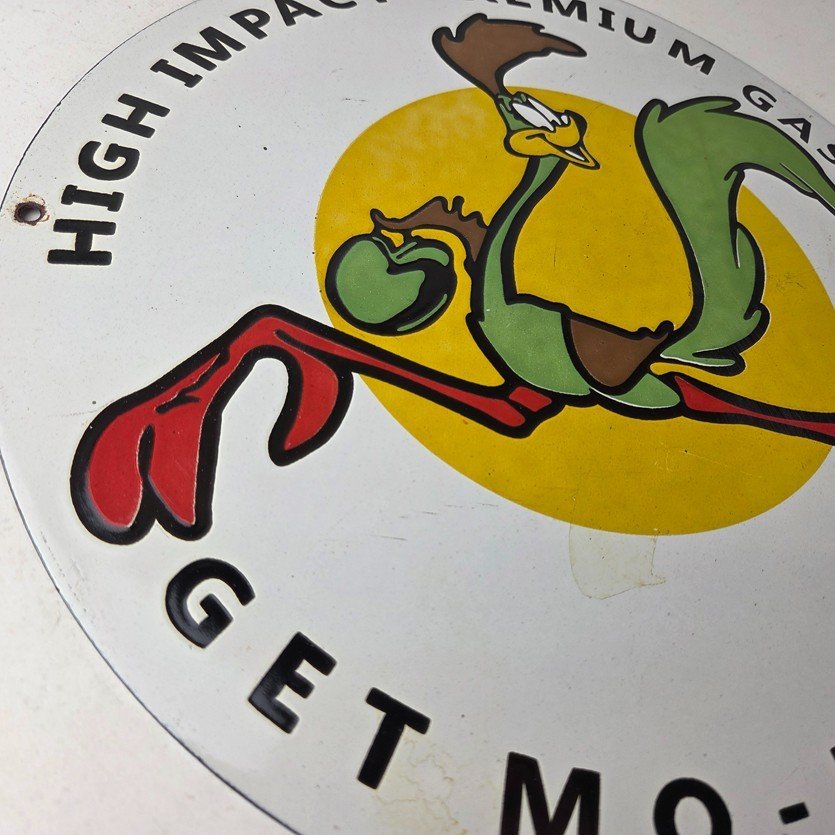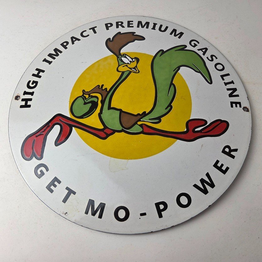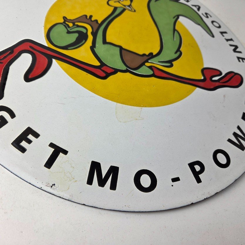 This vintage Premium Gasoline porcelain sign features the iconic Get Mo Power brand and a Mopar Road Runner in the center. The sign has large lettering around the outside.