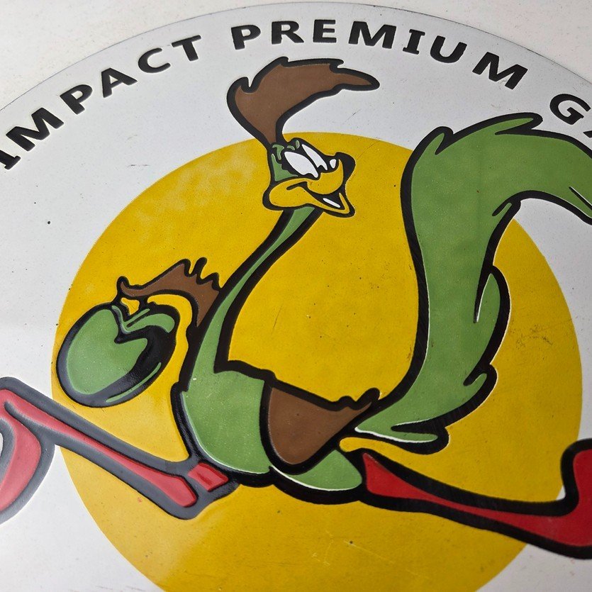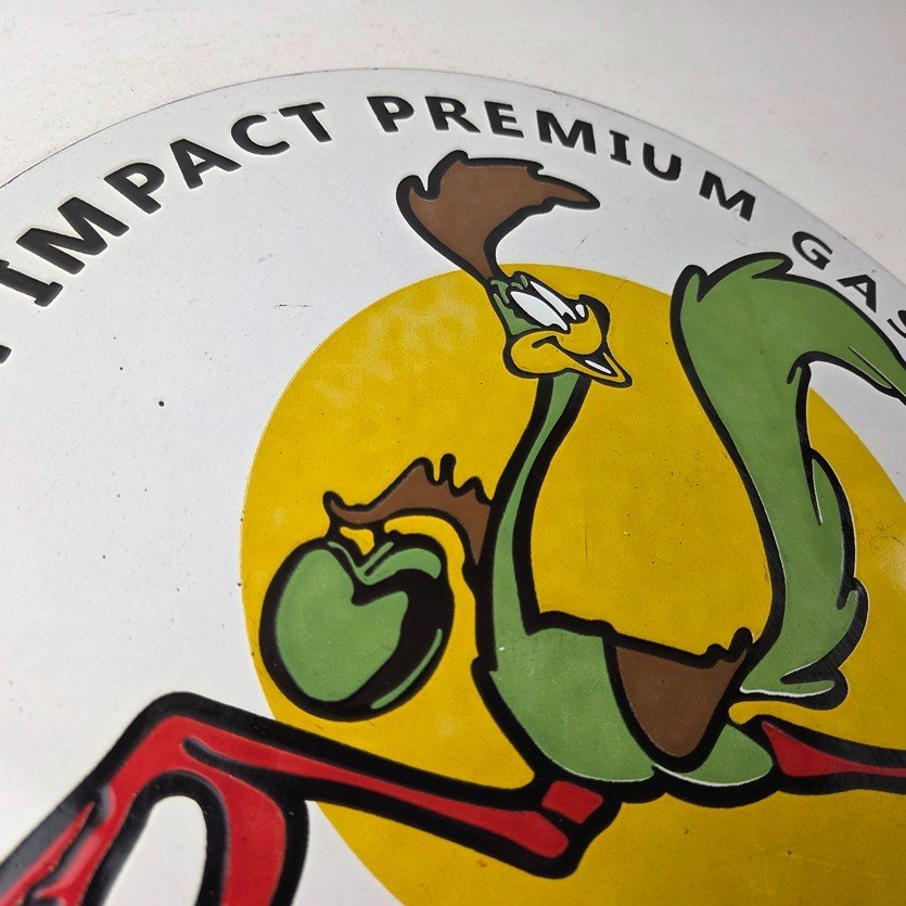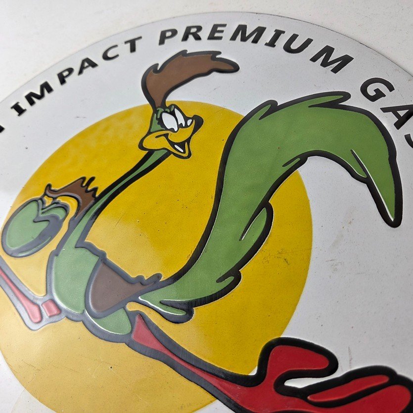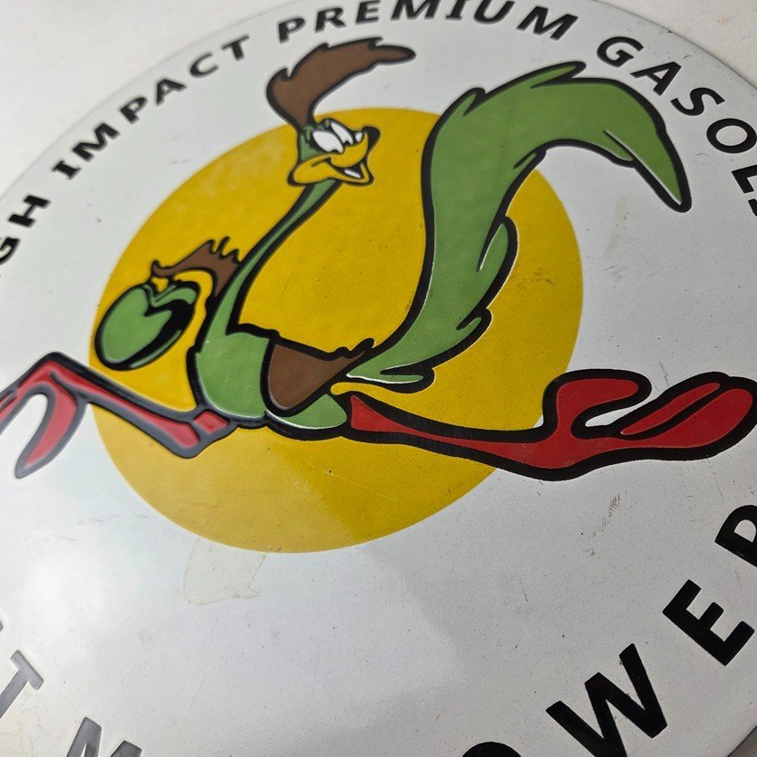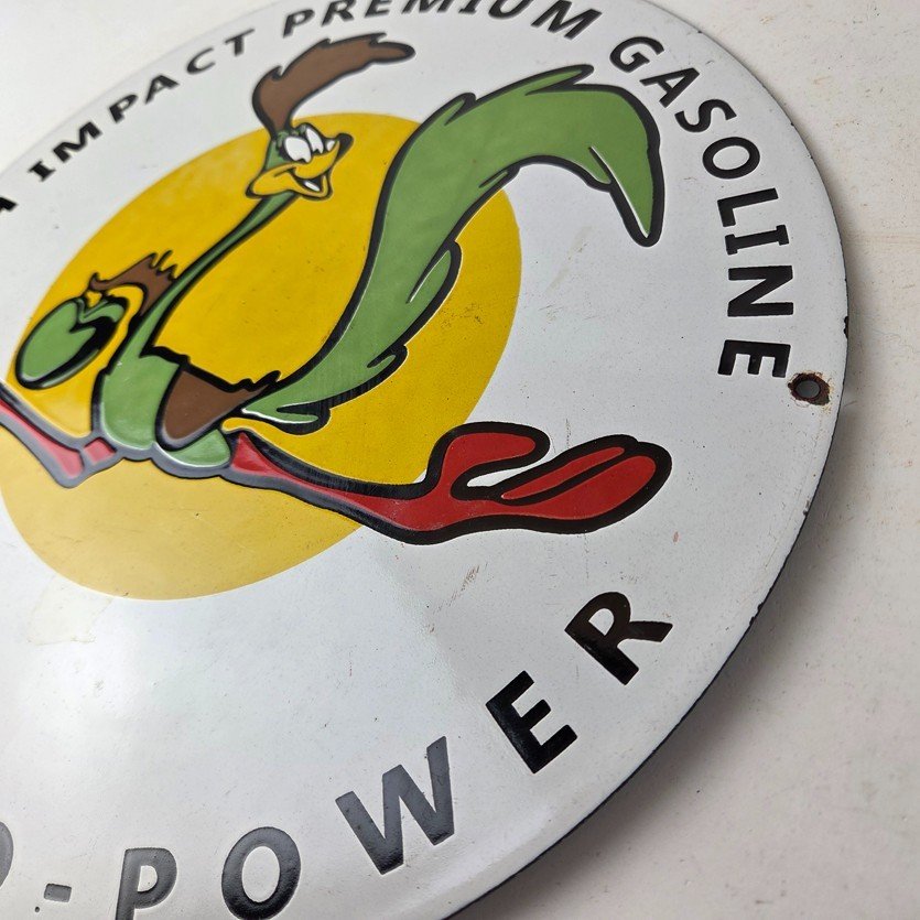 This vintage Premium Gasoline porcelain sign features the iconic Get Mo Power brand and a Mopar Road Runner in the center. The sign has large lettering around the outside.