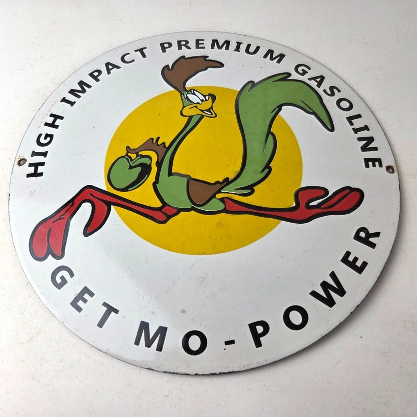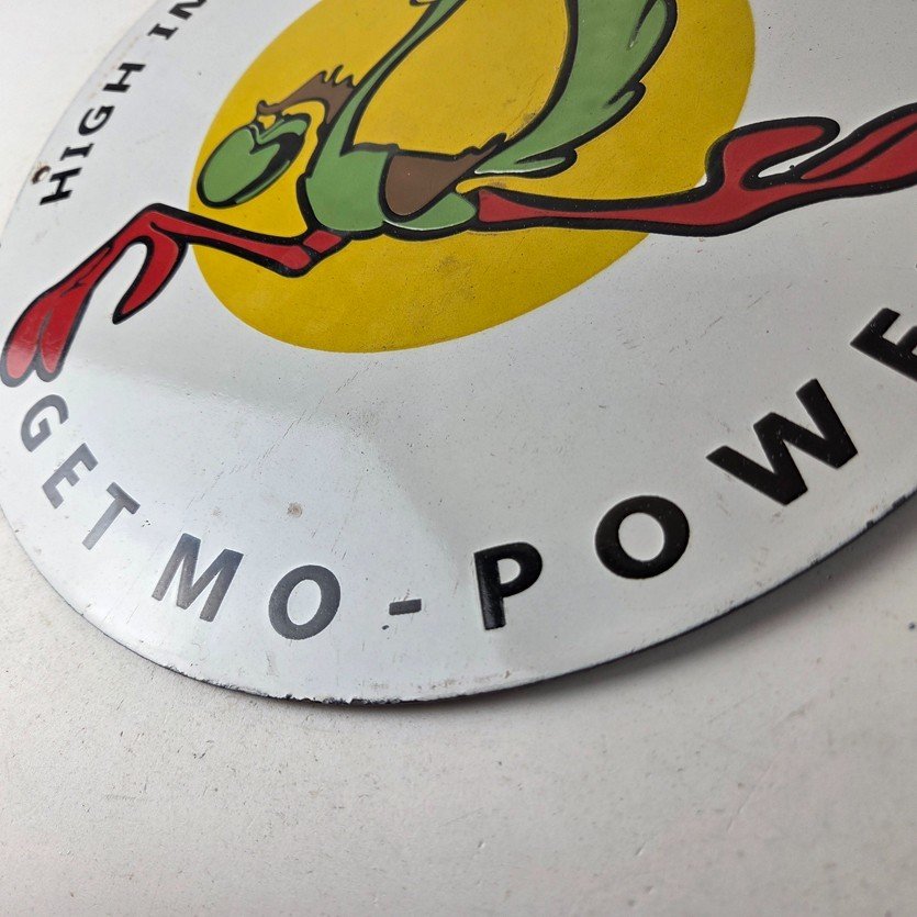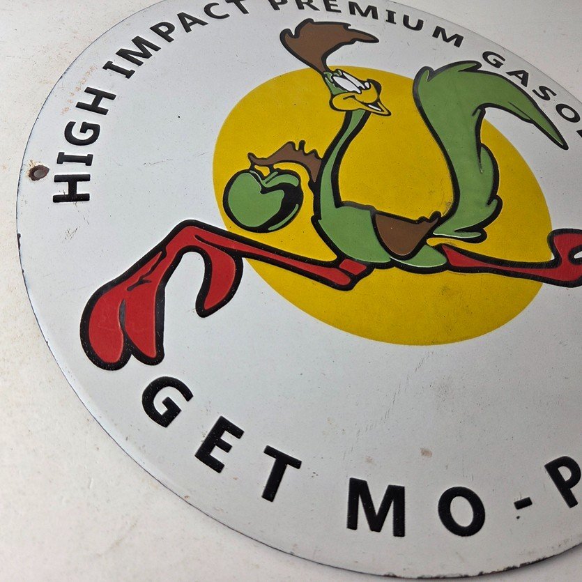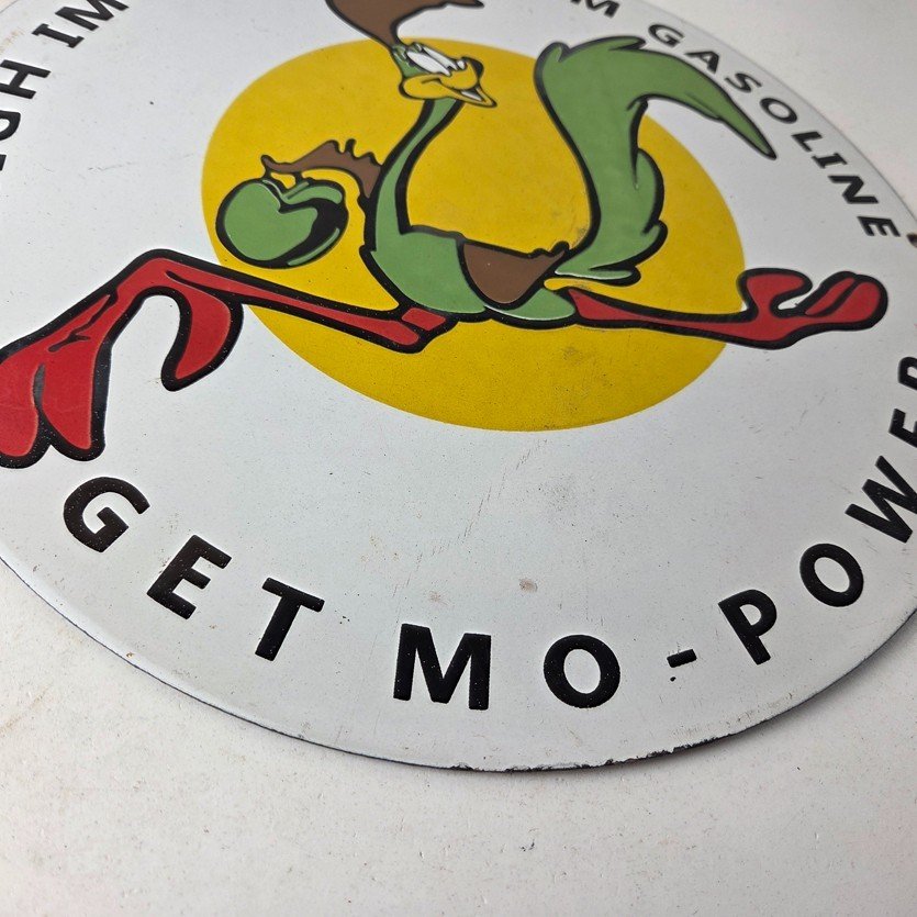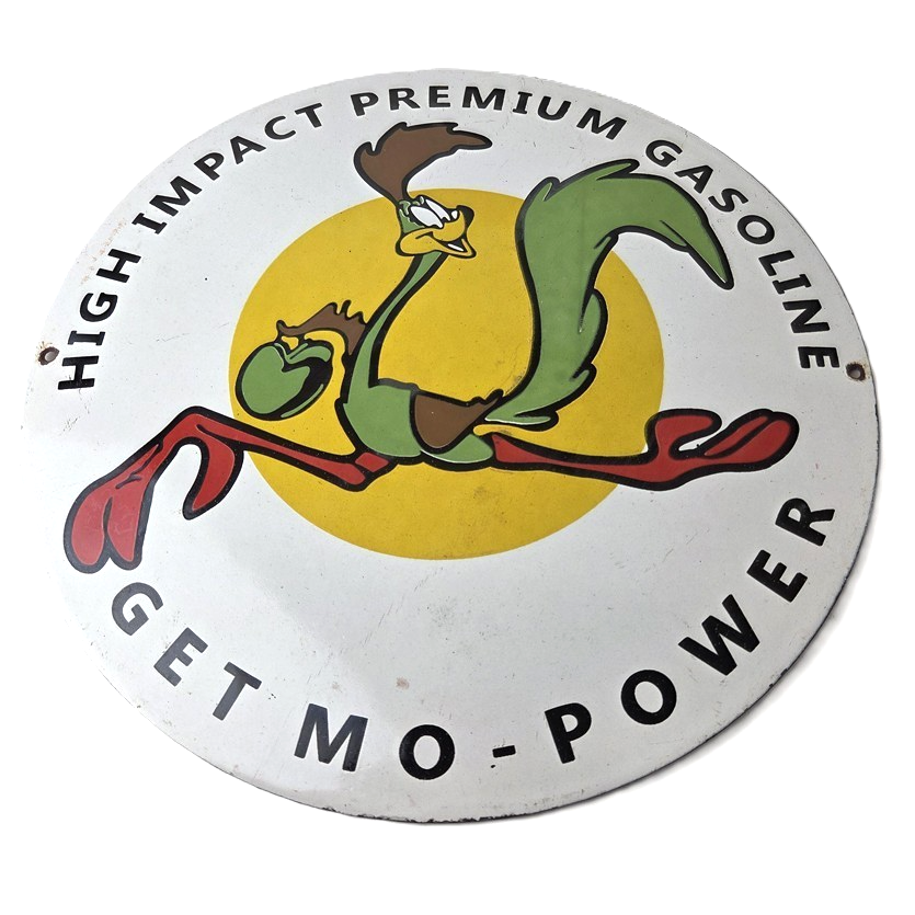 This vintage Premium Gasoline porcelain sign features the iconic Get Mo Power brand and a Mopar Road Runner in the center. The sign has large lettering around the outside.