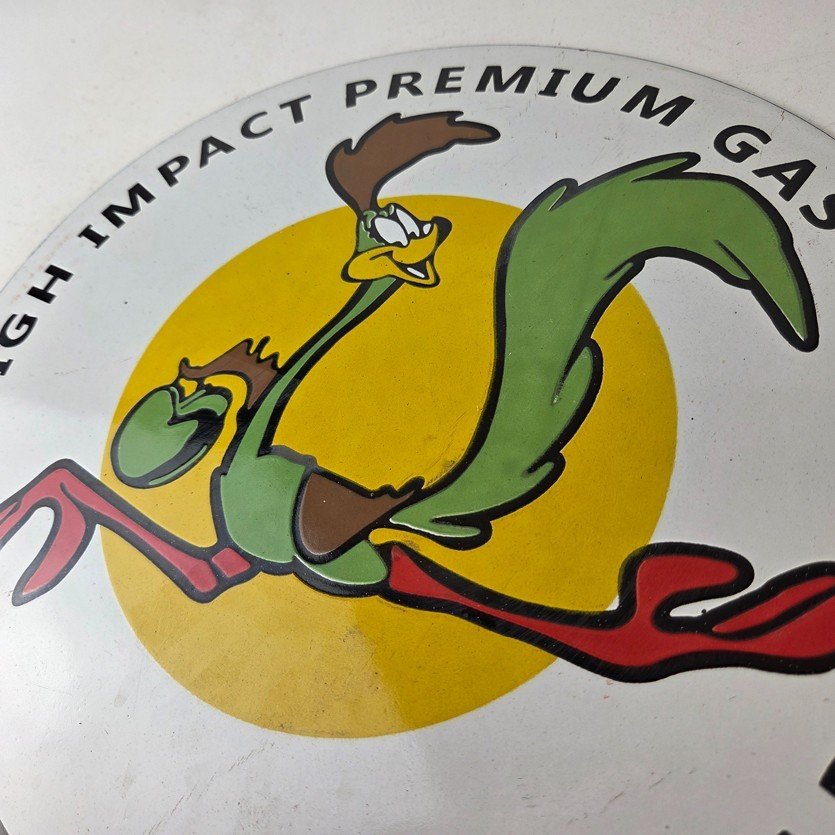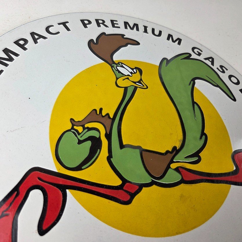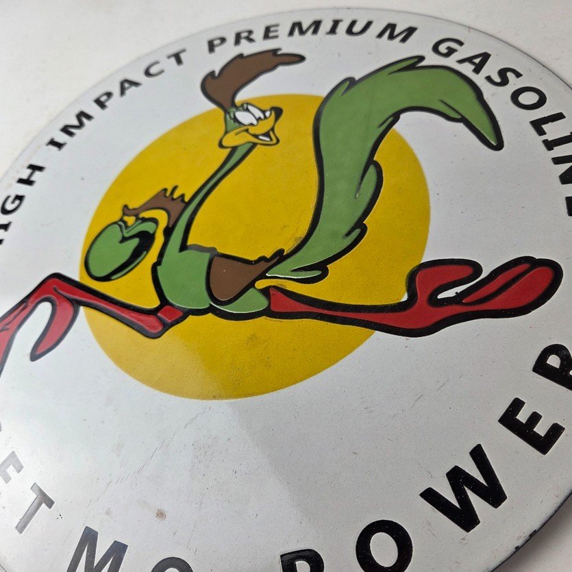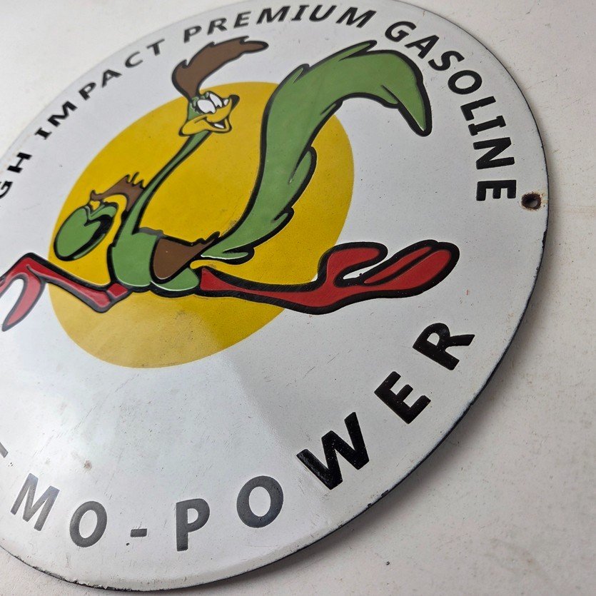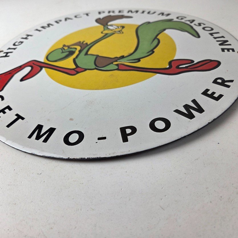 This vintage Premium Gasoline porcelain sign features the iconic Get Mo Power brand and a Mopar Road Runner in the center. The sign has large lettering around the outside.