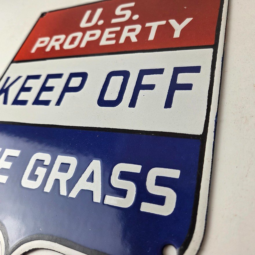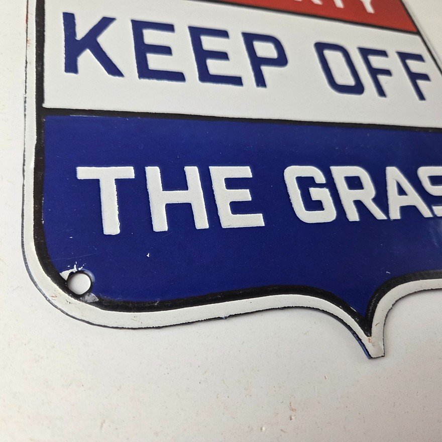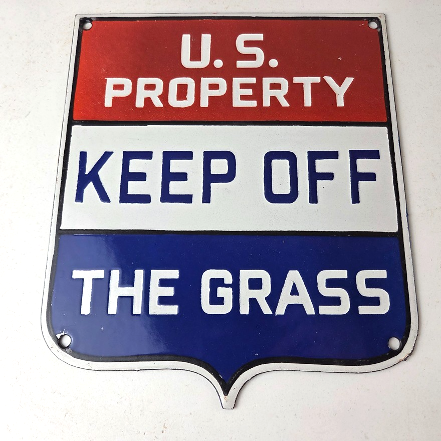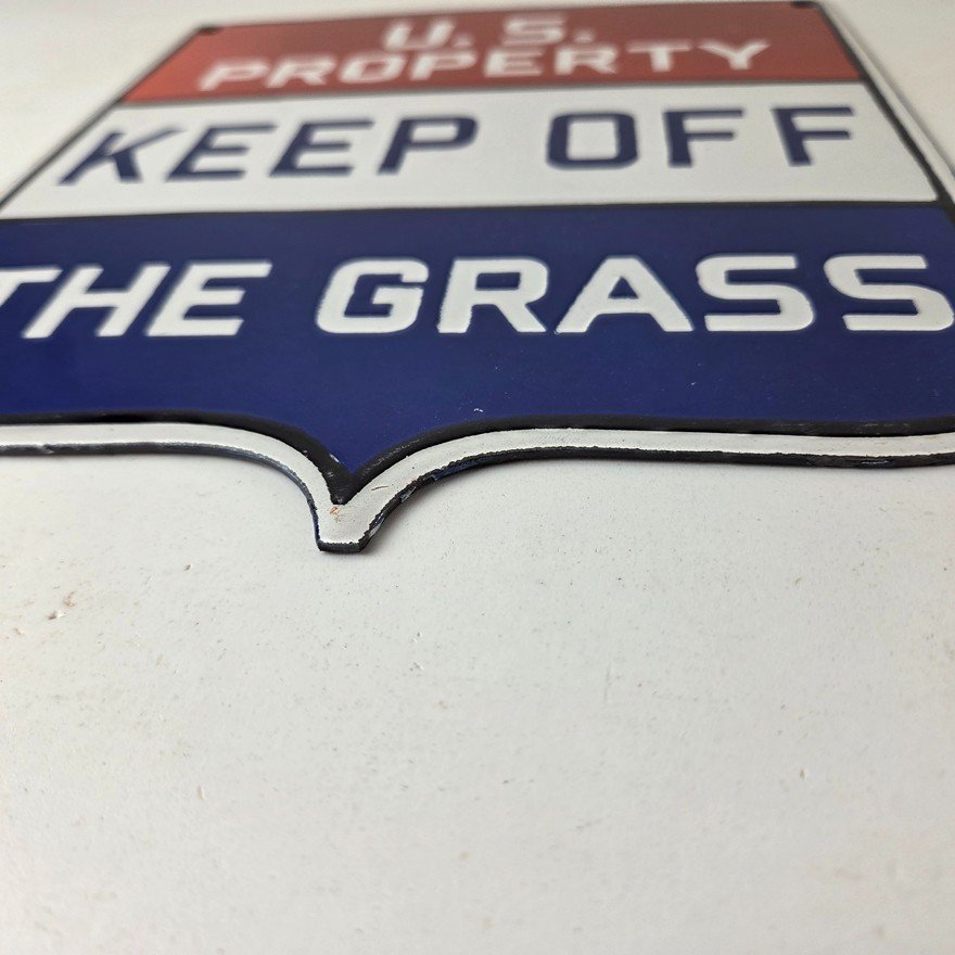 This vintage U.S. Property Keep Off the Grass porcelain sign features the iconic Red White & Blue shield shape. This sign has excellent color and porcelain. The sign measures 10 inches by 8 1/2 inches.