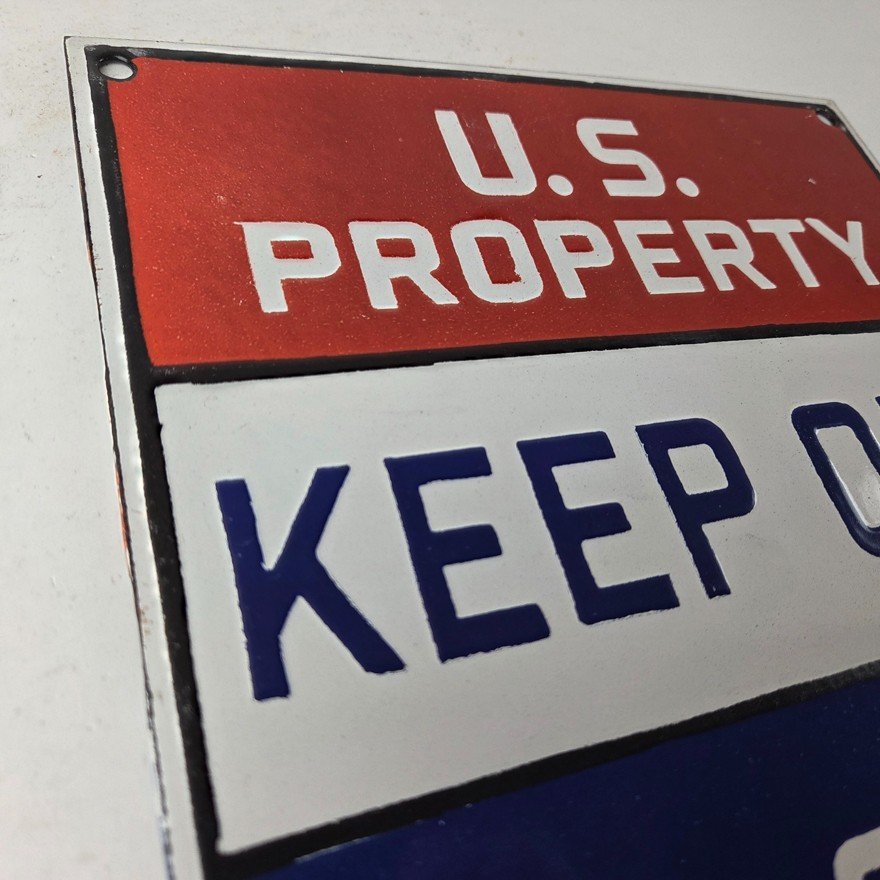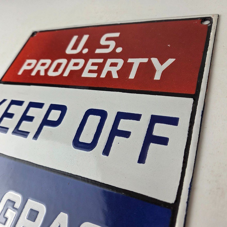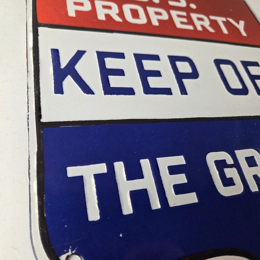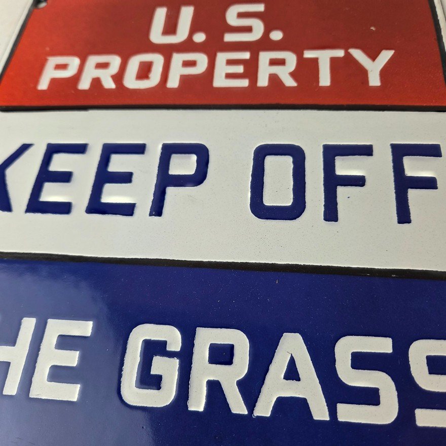 This vintage U.S. Property Keep Off the Grass porcelain sign features the iconic Red White & Blue shield shape. This sign has excellent color and porcelain. The sign measures 10 inches by 8 1/2 inches.