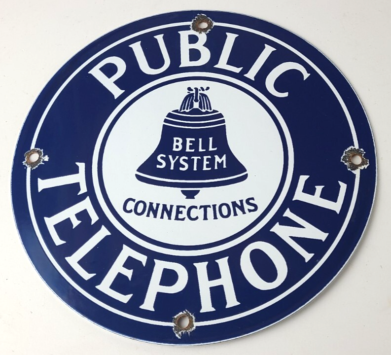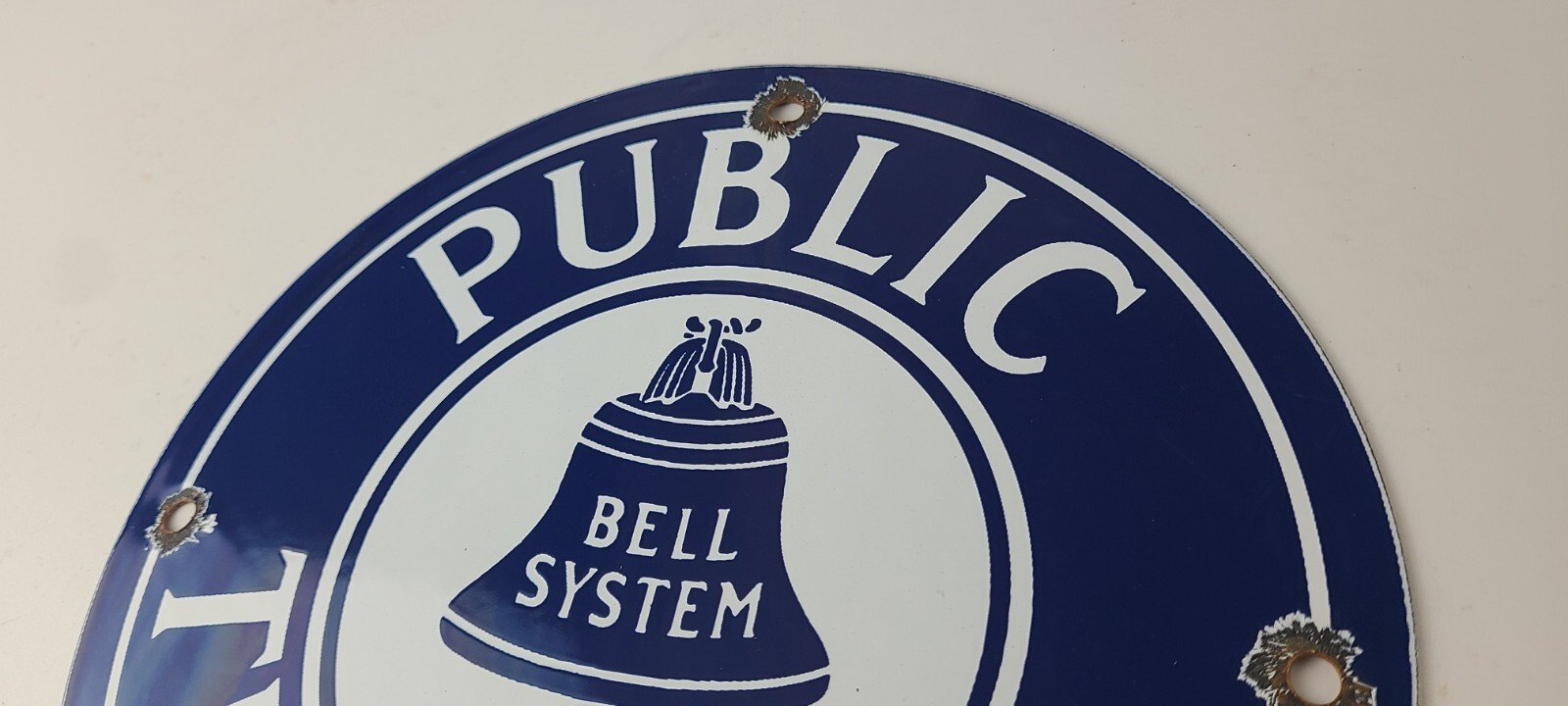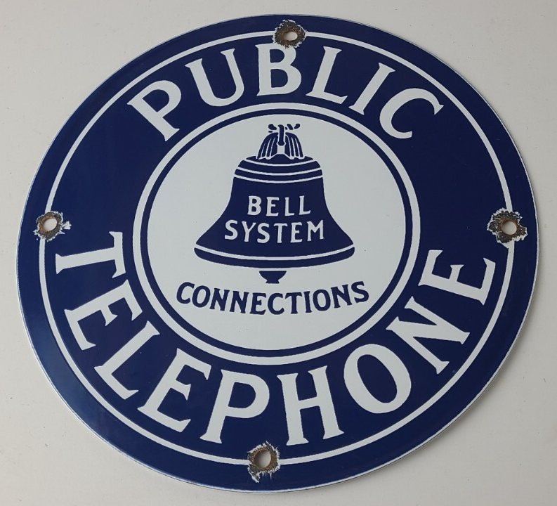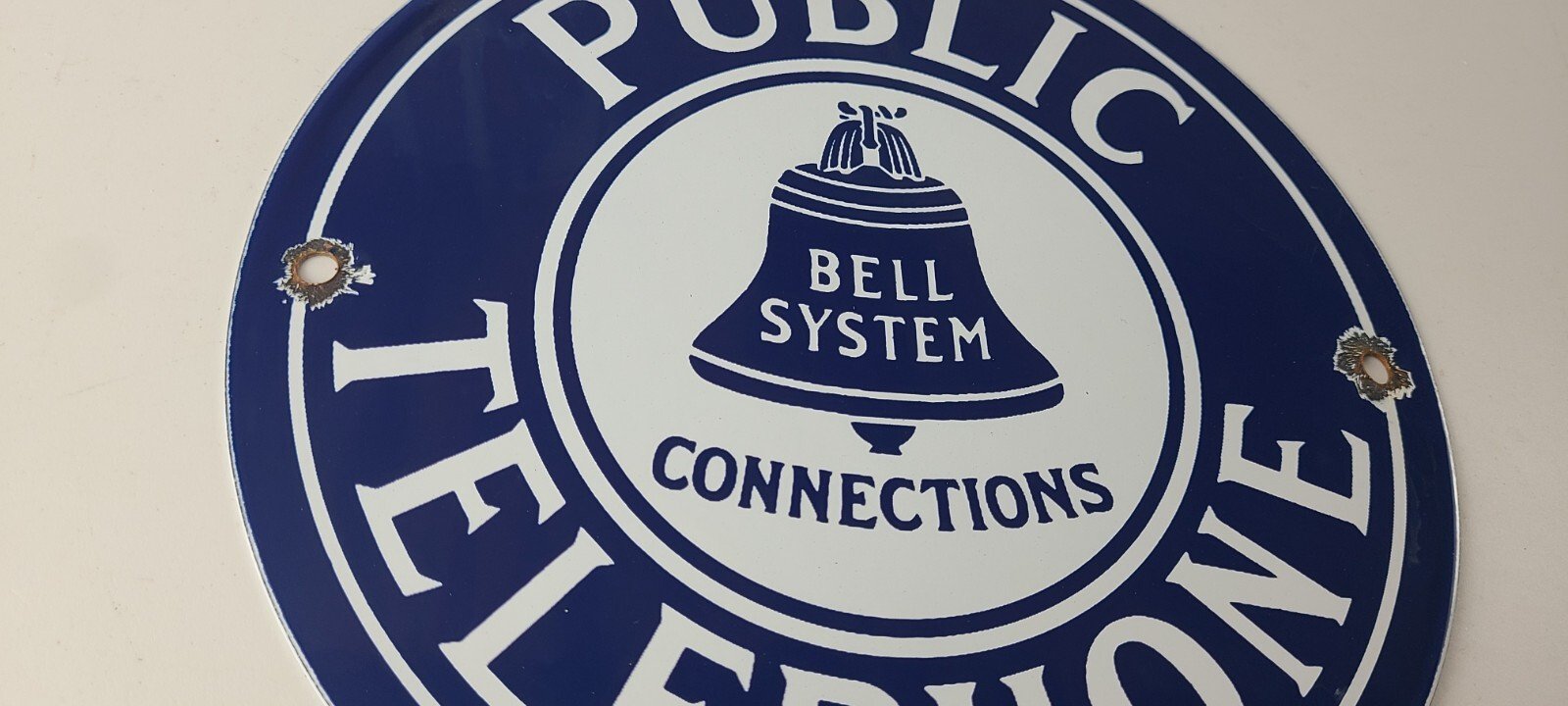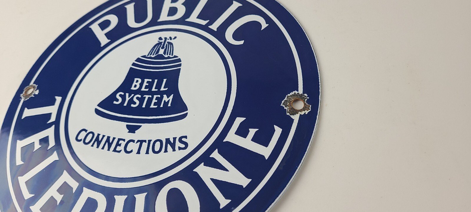 This vintage porcelain sign features a striking blue color with the words “Public Telephones” and “Bell Systems Connections” prominently displayed. Measuring at 8 3/4 inches in size, this sign is a great addition to any collection of gas and oil memorabilia. The sign is also ideal for those who enjoy vintage advertising and collectibles. Made in the United States, this sign will enhance your man-cave, collection, speakeasy, shop, or garage.