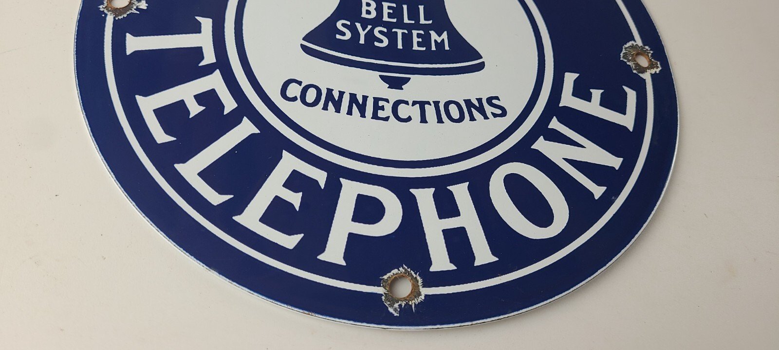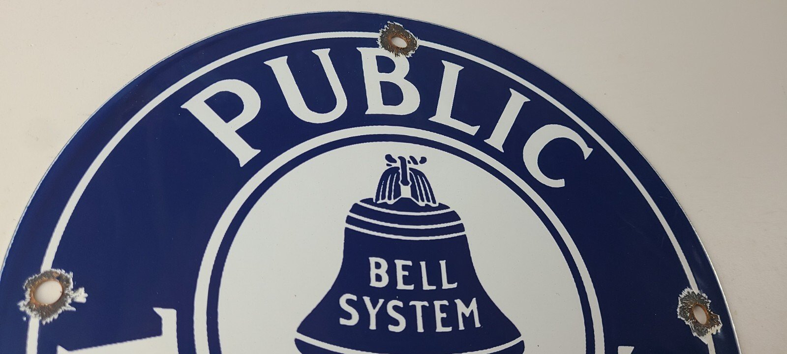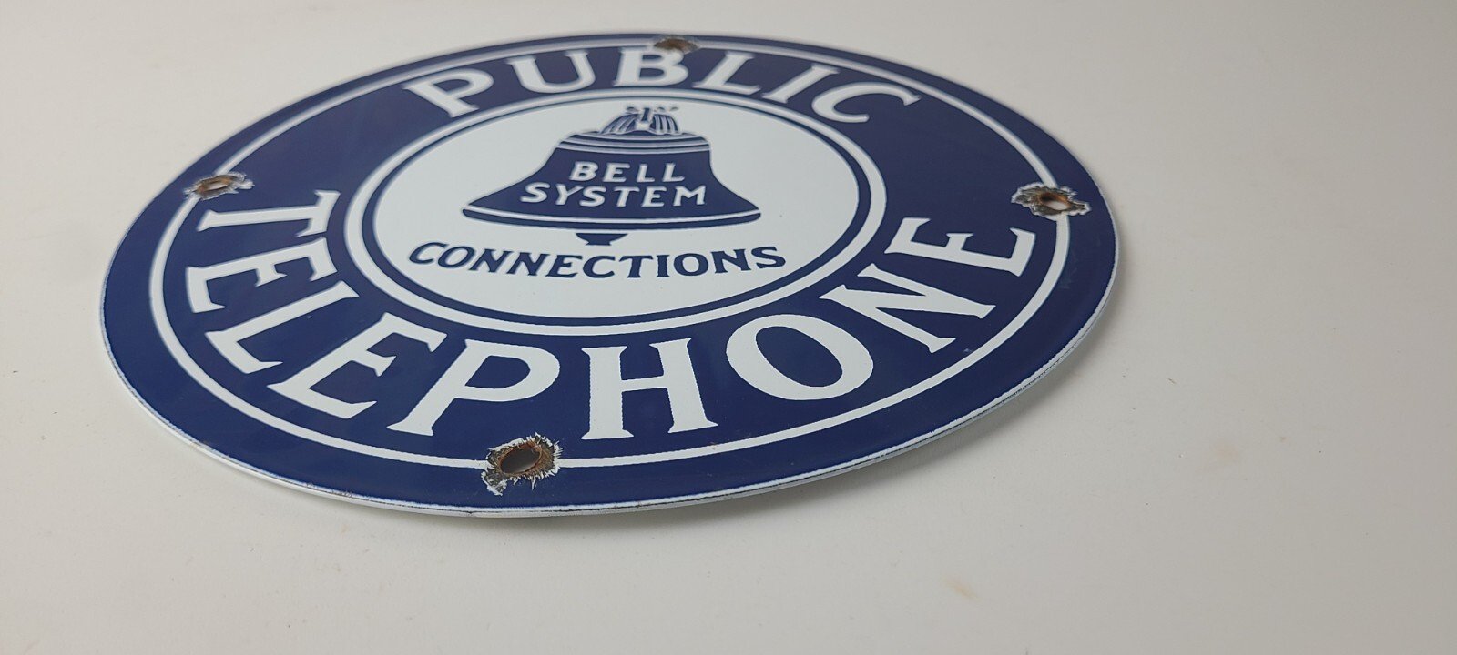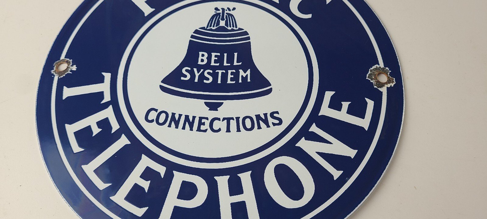 This vintage porcelain sign features a striking blue color with the words “Public Telephones” and “Bell Systems Connections” prominently displayed. Measuring at 8 3/4 inches in size, this sign is a great addition to any collection of gas and oil memorabilia. The sign is also ideal for those who enjoy vintage advertising and collectibles. Made in the United States, this sign will enhance your man-cave, collection, speakeasy, shop, or garage.