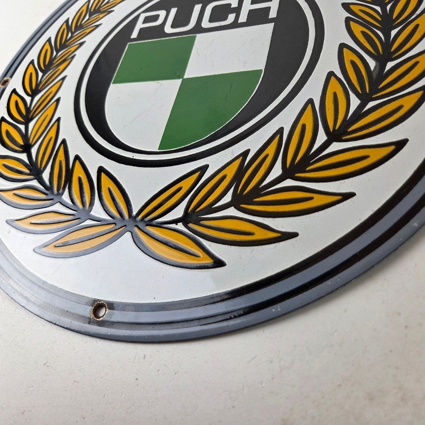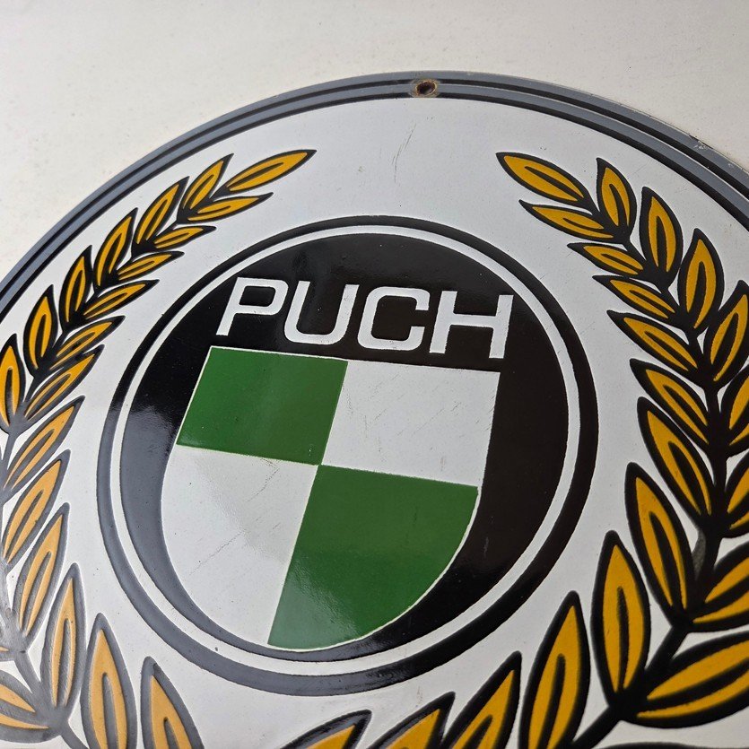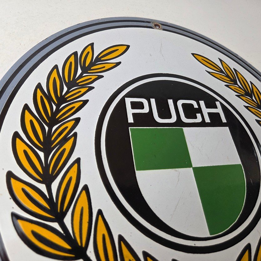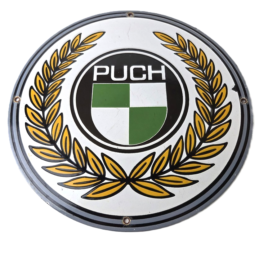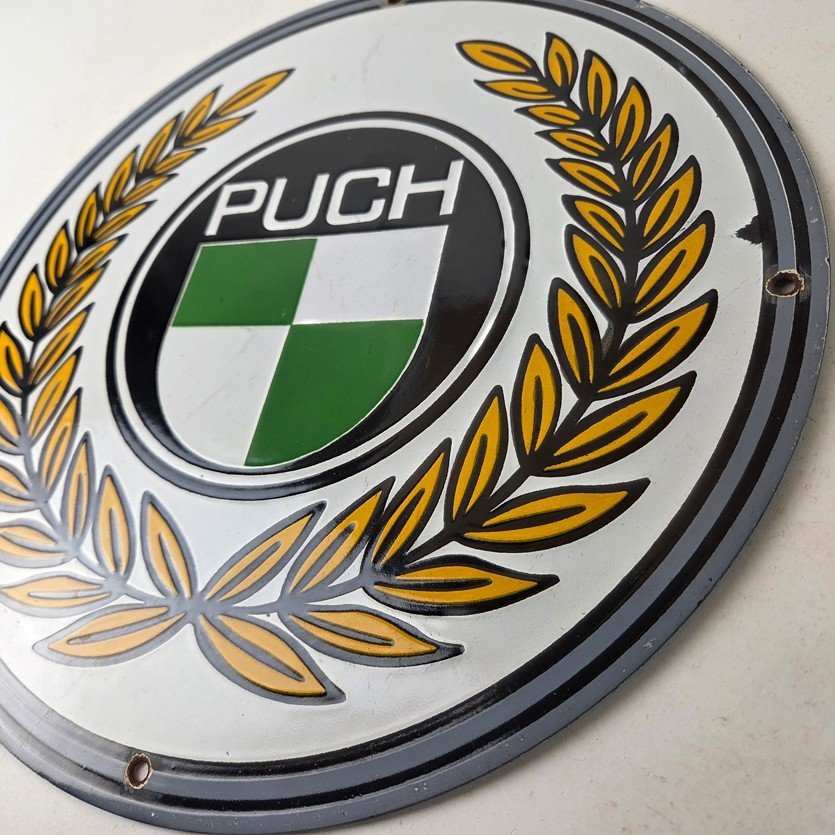 This vintage Puch Mopeds porcelain sign features Puch shield in the center, advertising with the bright vibrant colors. The sign measures 12″ in size and has porcelain on both sides.
