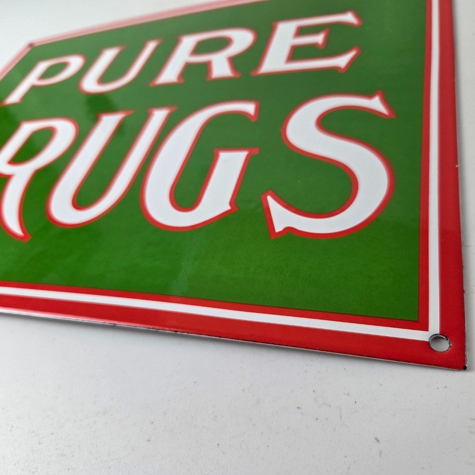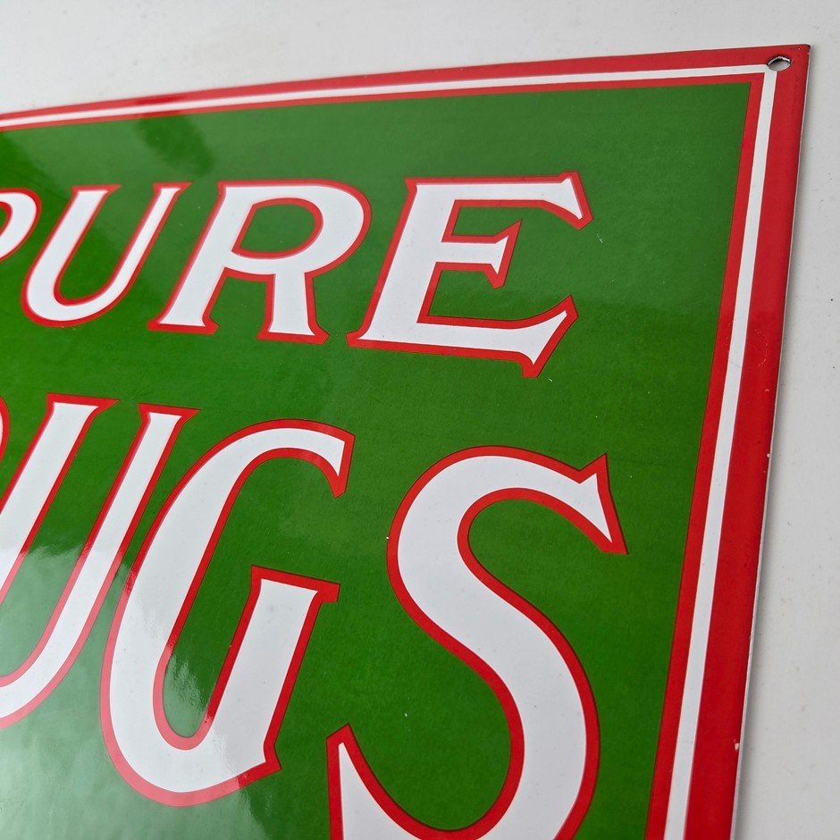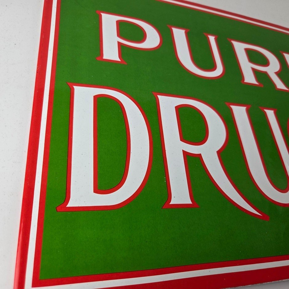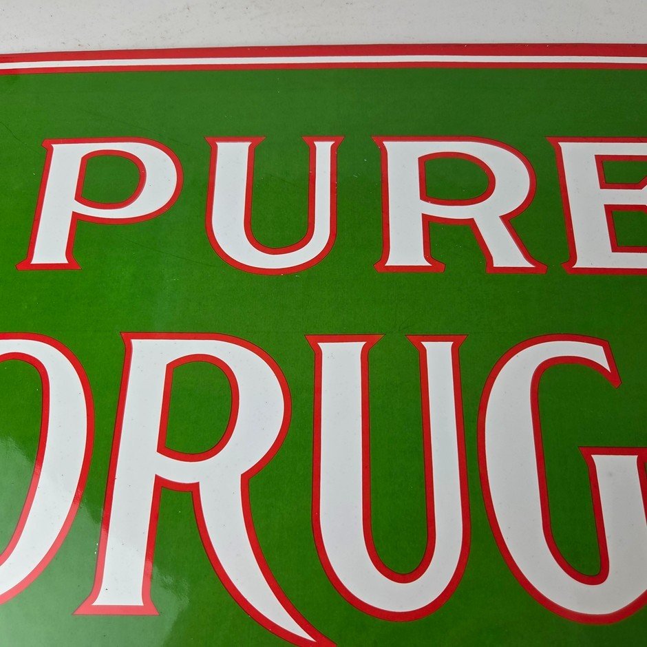This vintage porcelain sign is a great addition to any Gas & Oil themed collection, mancave, shop, bar, or garage. Measuring 15″ x 11 3/8″ and featuring the iconic brand Pure Drugs Pharmacy, it is a perfect piece of memorabilia for fans of the brand. The sign is predominantly green and red in color. Shipped fast, it is a great opportunity to add to your collection.