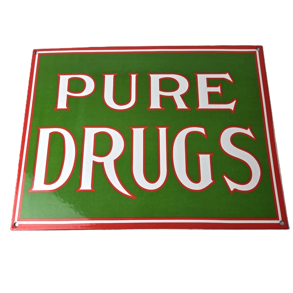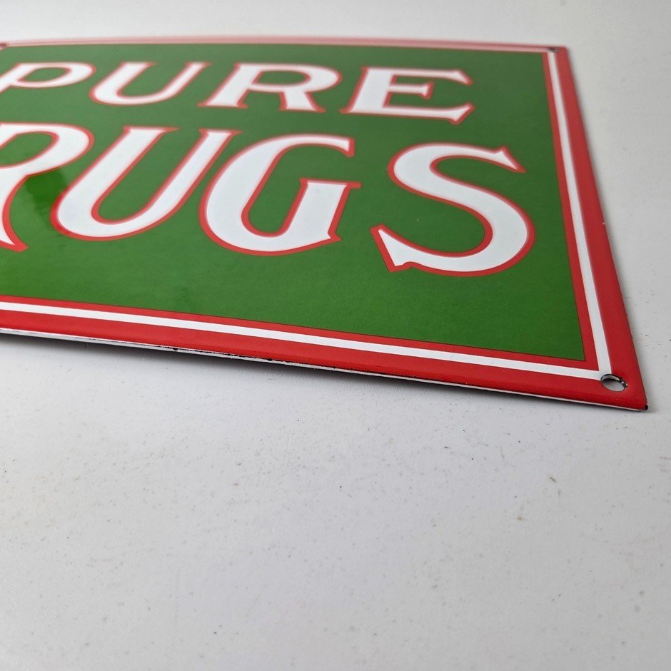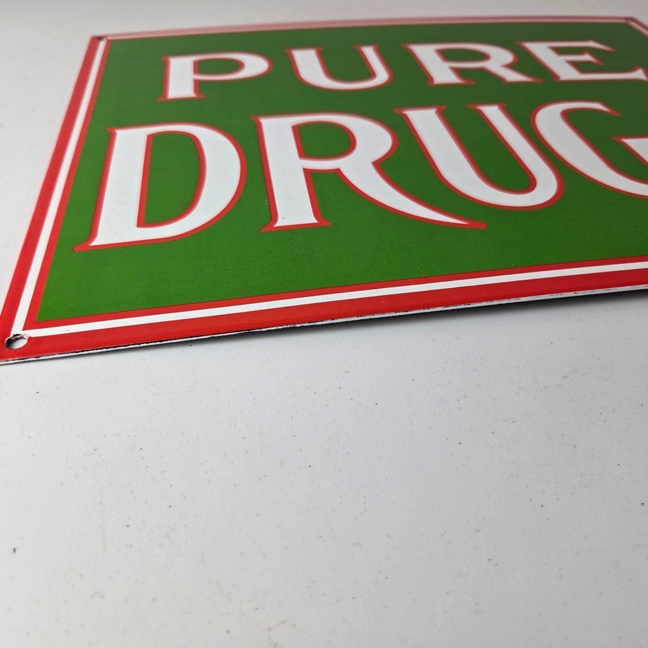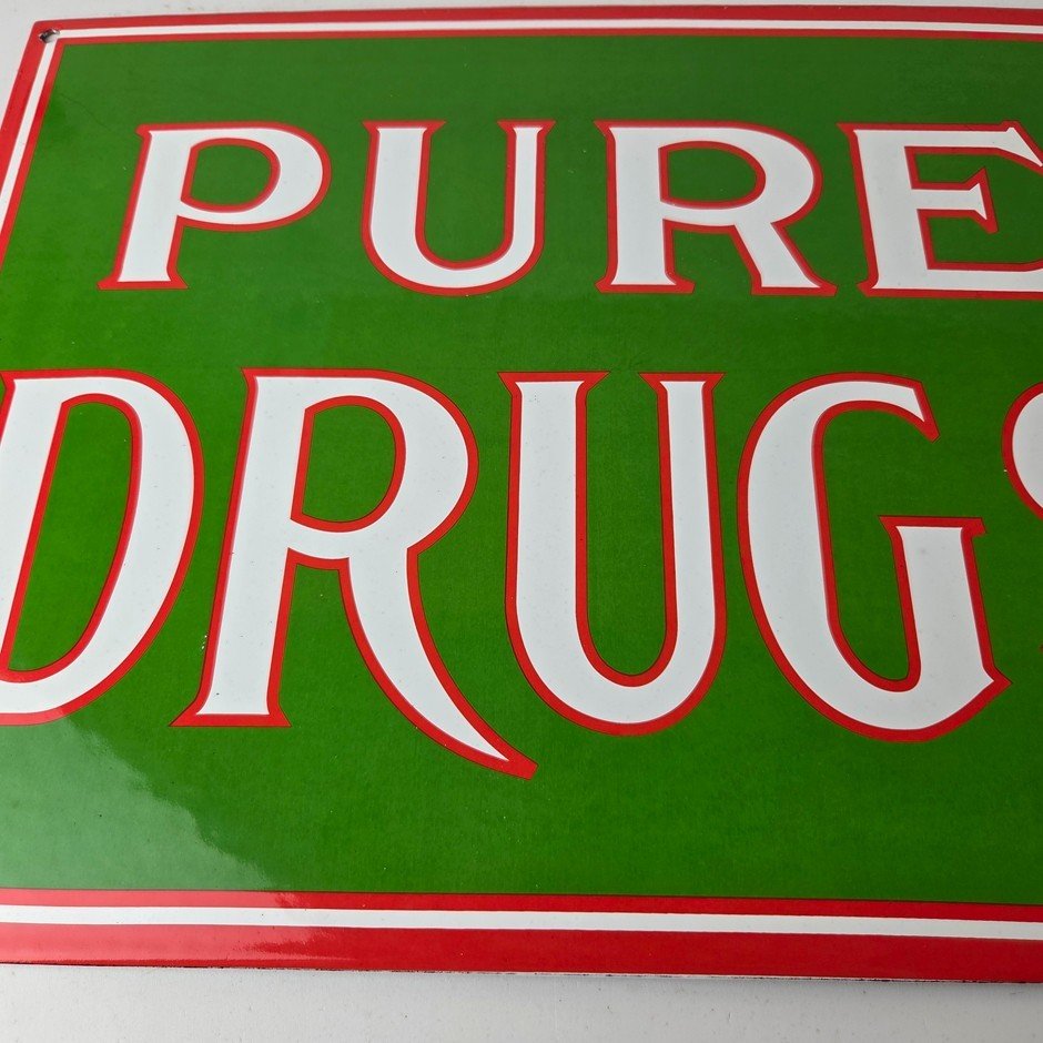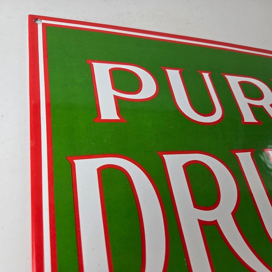 This vintage porcelain sign is a great addition to any Gas & Oil themed collection, mancave, shop, bar, or garage. Measuring 15″ x 11 3/8″ and featuring the iconic brand Pure Drugs Pharmacy, it is a perfect piece of memorabilia for fans of the brand. The sign is predominantly green and red in color. Shipped fast, it is a great opportunity to add to your collection.