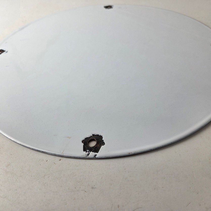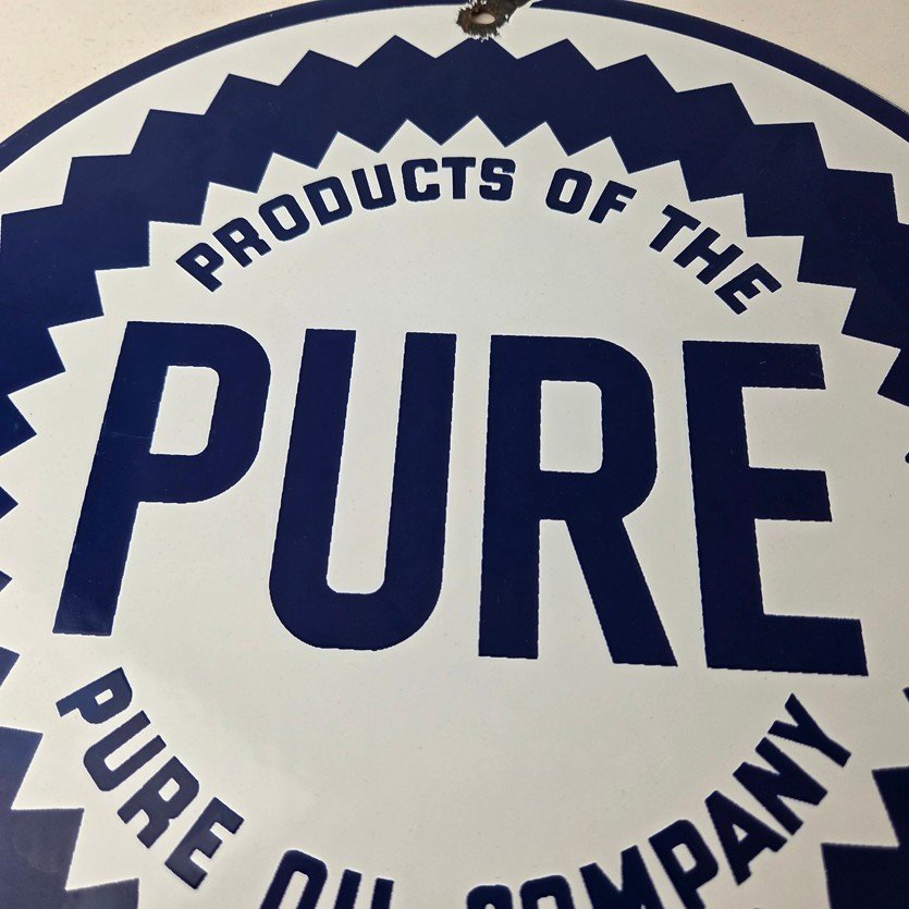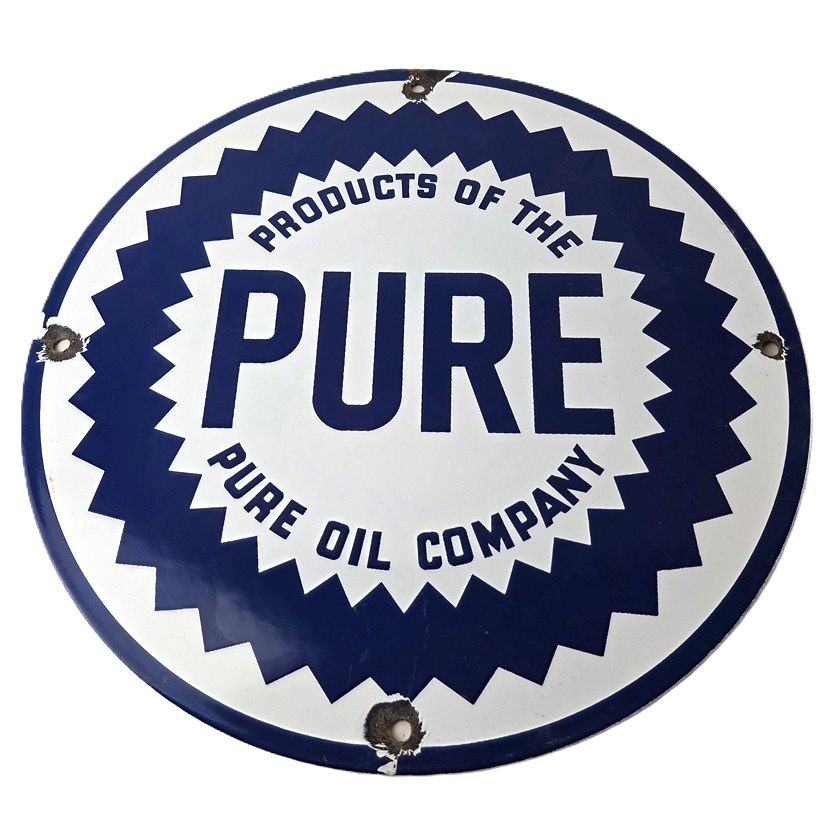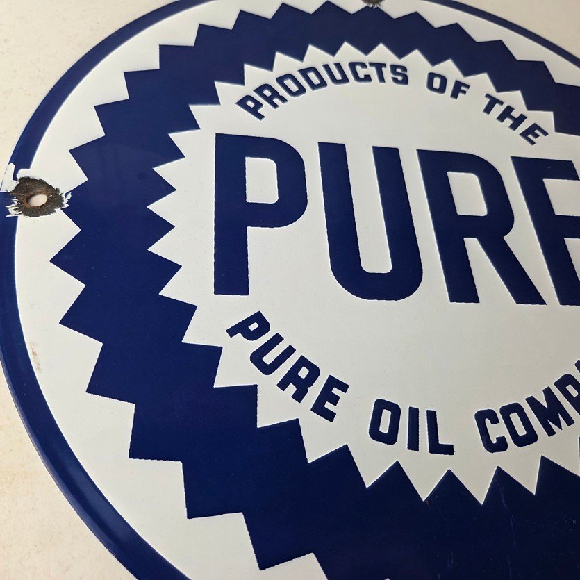 This vintage Pure Oil Co porcelain sign features the iconic logo of the Pure Gasoline. This sign has excellent large lettering and porcelain. The sign measures 11 3/4 inches across.