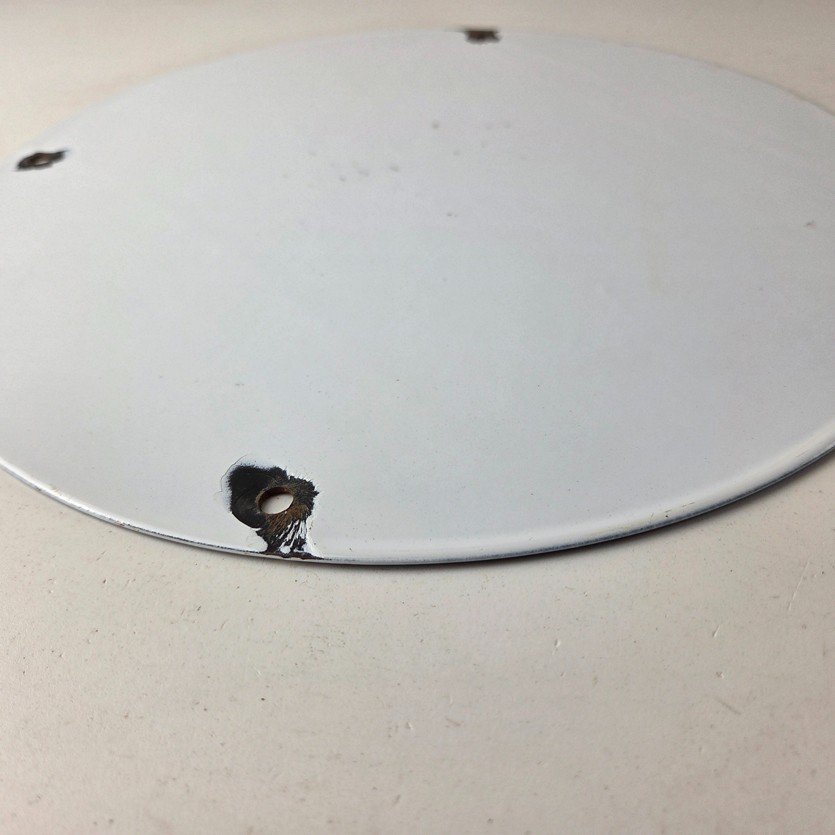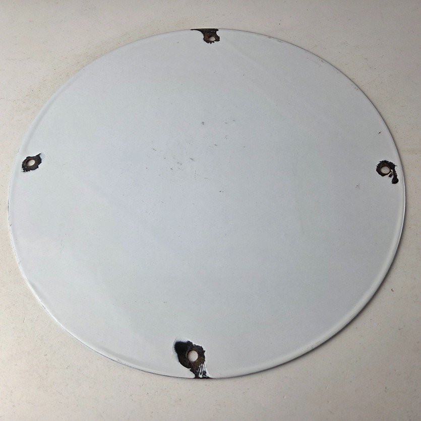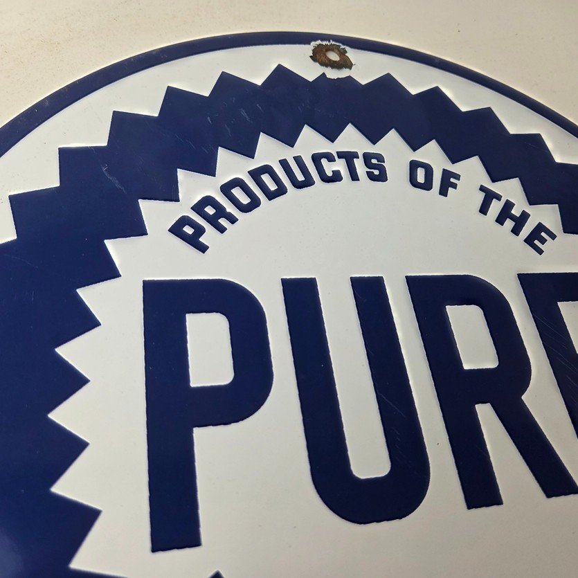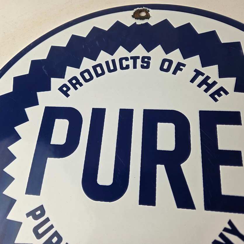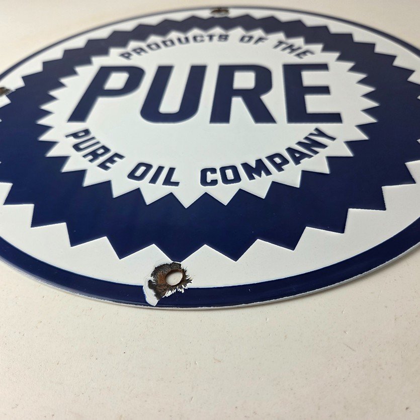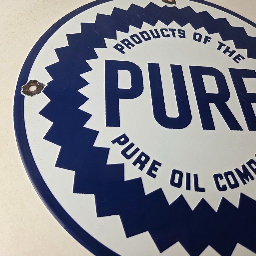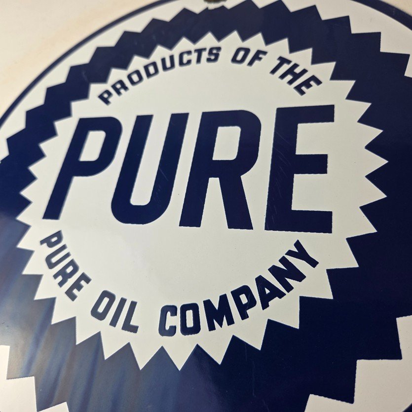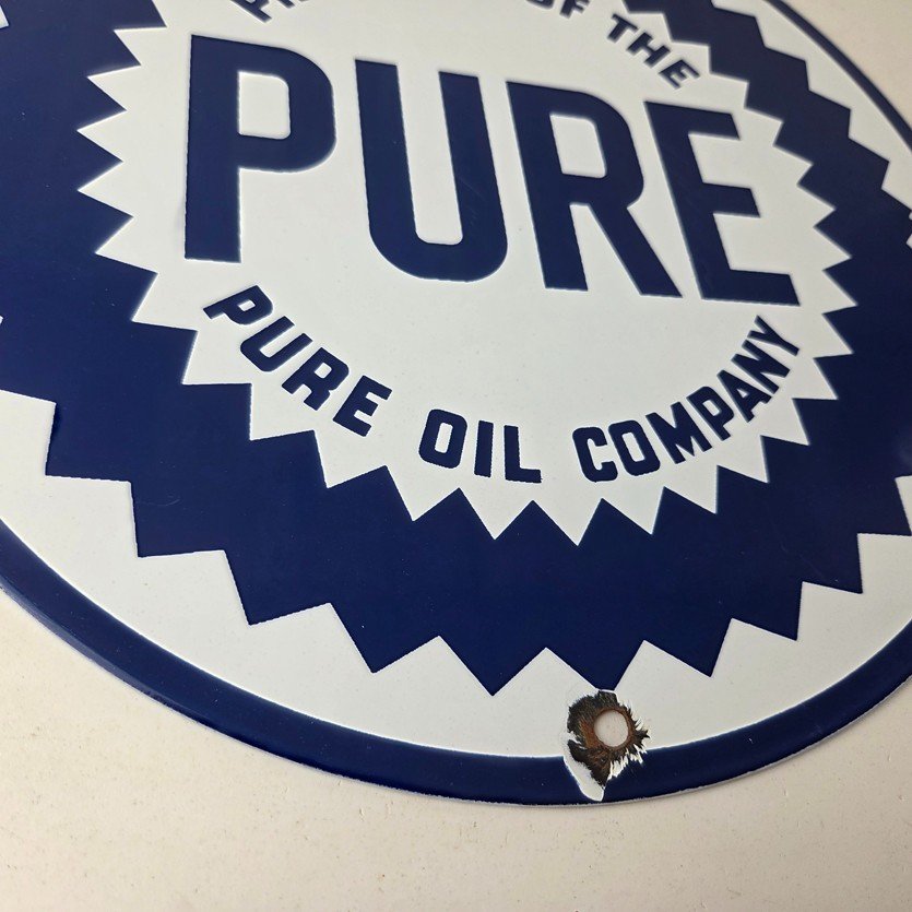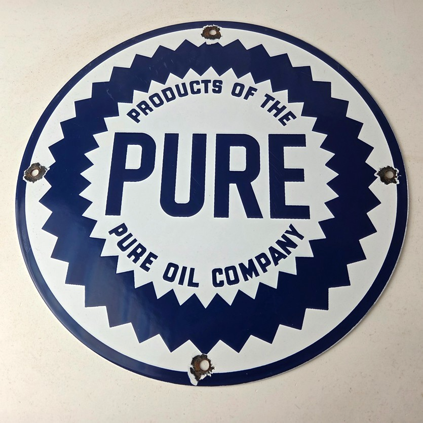This vintage Pure Oil Co porcelain sign features the iconic logo of the Pure Gasoline. This sign has excellent large lettering and porcelain. The sign measures 11 3/4 inches across.