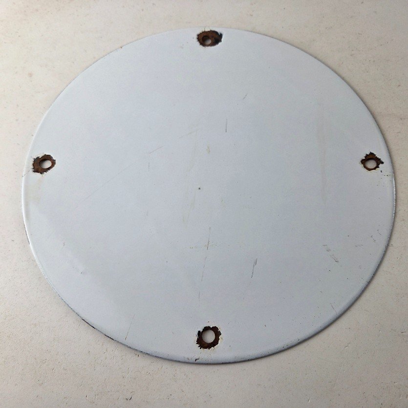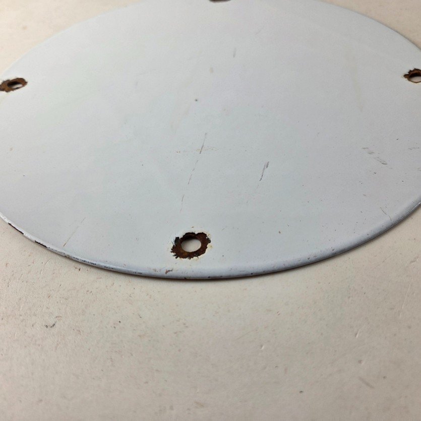 Made of porcelain enamel on steel with patina and wear: rust spotting around the mounting holes, minor edge chips, light surface scratches, and minimal discoloration. This is a porcelain enamel advertising sign in excellent condition, exactly as shown in the photos.