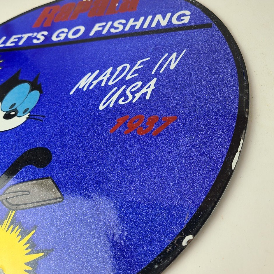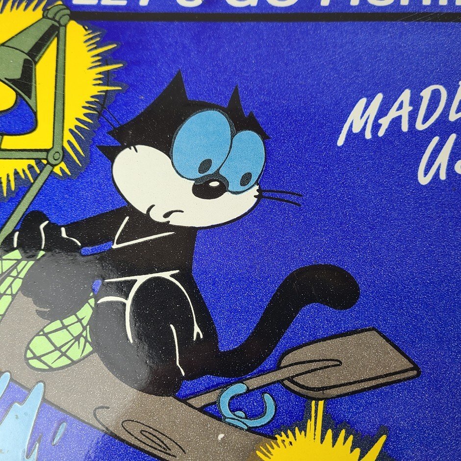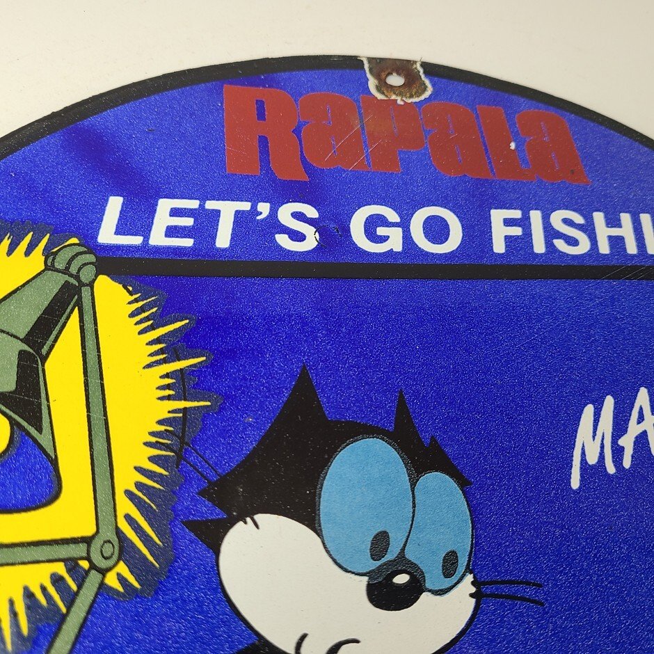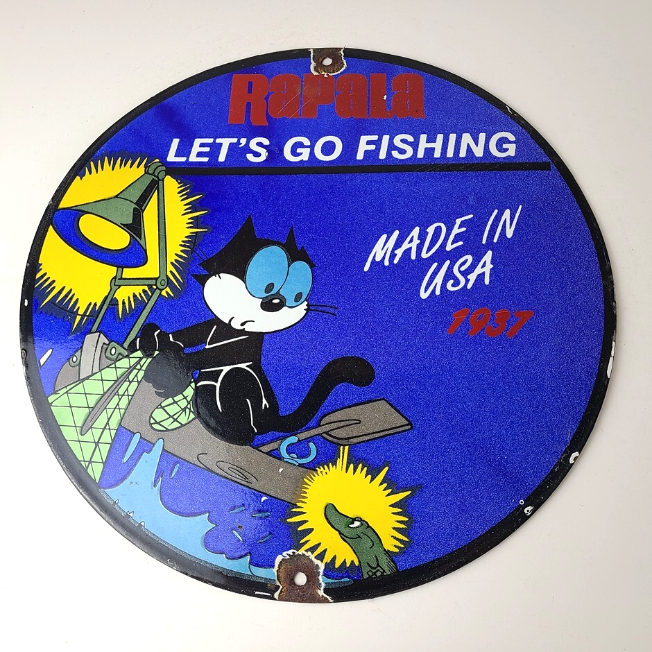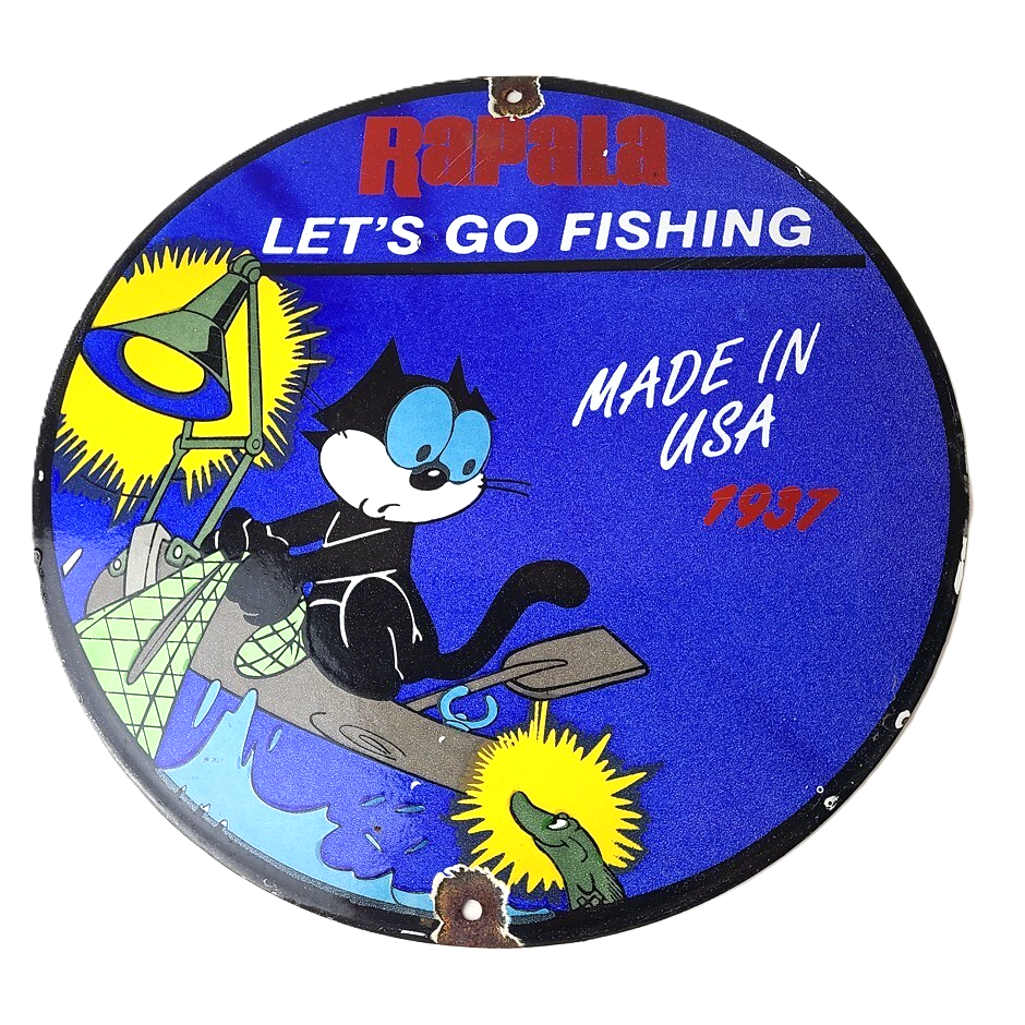 This vintage Rapala porcelain fishing lures sign measures 12″ across. With its vibrant colors it will add a touch of nostalgia to any space. The sign features a graphic of Felix the Cat and the electric eel., along with the slogan, “Rapala- Let’s Go Fishing.” The brand is Rapala, this unique piece of merchandise and memorabilia is a great addition to any collection. Perfect for your man cave, Icehouse, Bar, Shop, Garage or shed!
