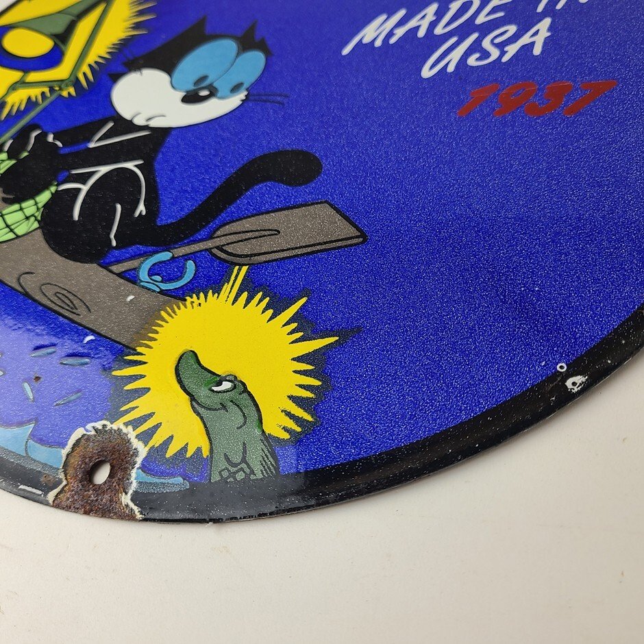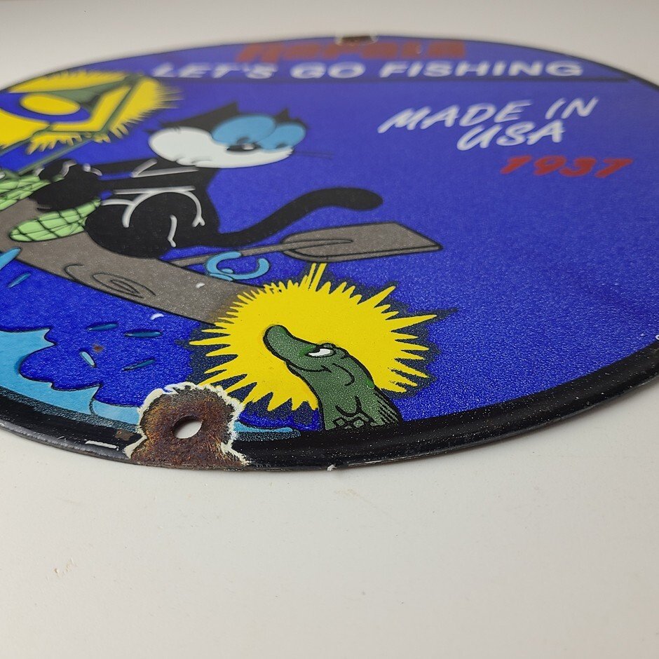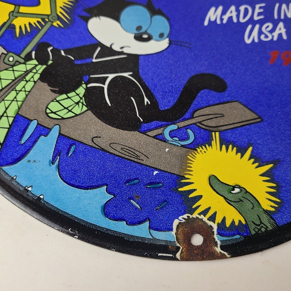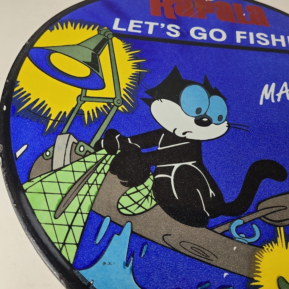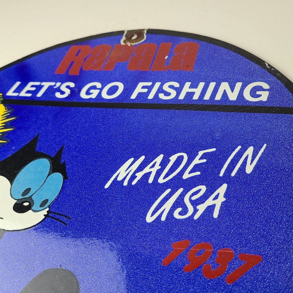 This vintage Rapala porcelain fishing lures sign measures 12″ across. With its vibrant colors it will add a touch of nostalgia to any space. The sign features a graphic of Felix the Cat and the electric eel., along with the slogan, “Rapala- Let’s Go Fishing.” The brand is Rapala, this unique piece of merchandise and memorabilia is a great addition to any collection. Perfect for your man cave, Icehouse, Bar, Shop, Garage or shed!