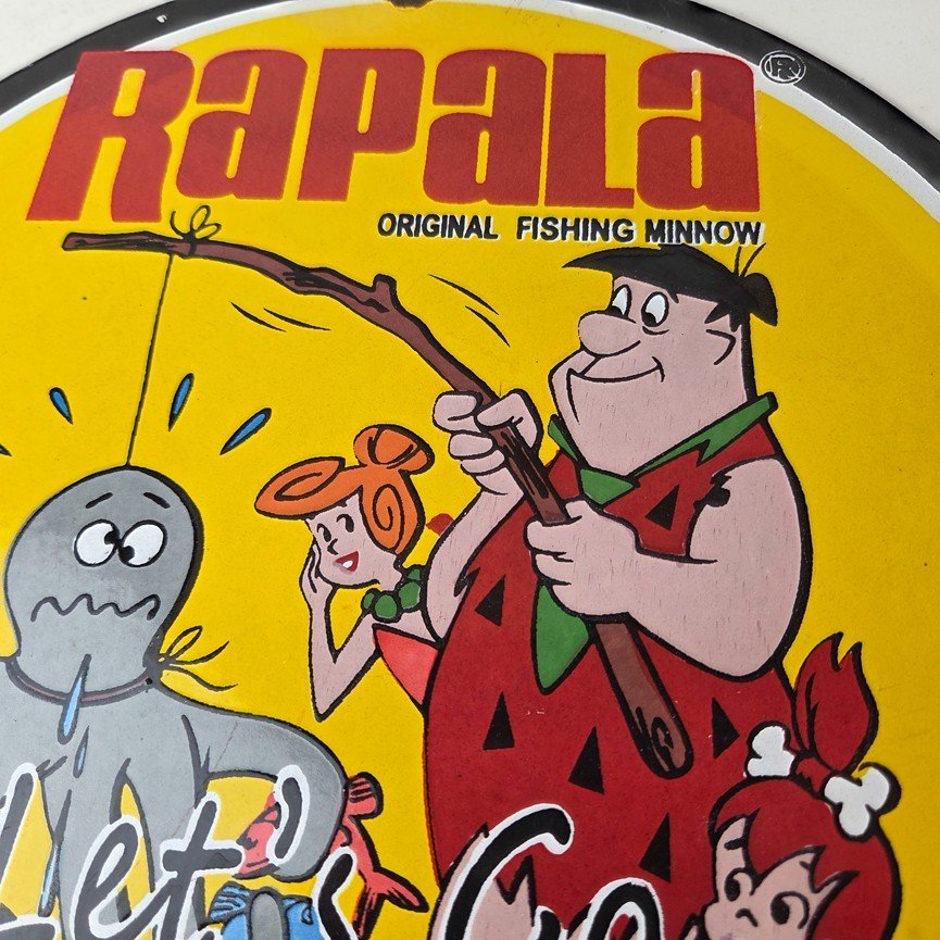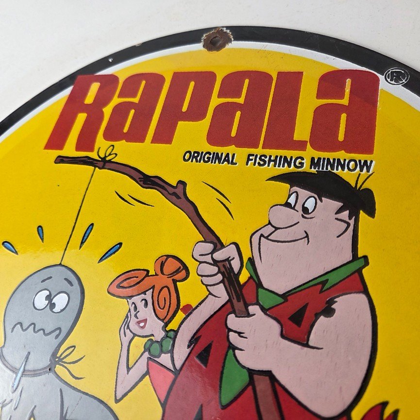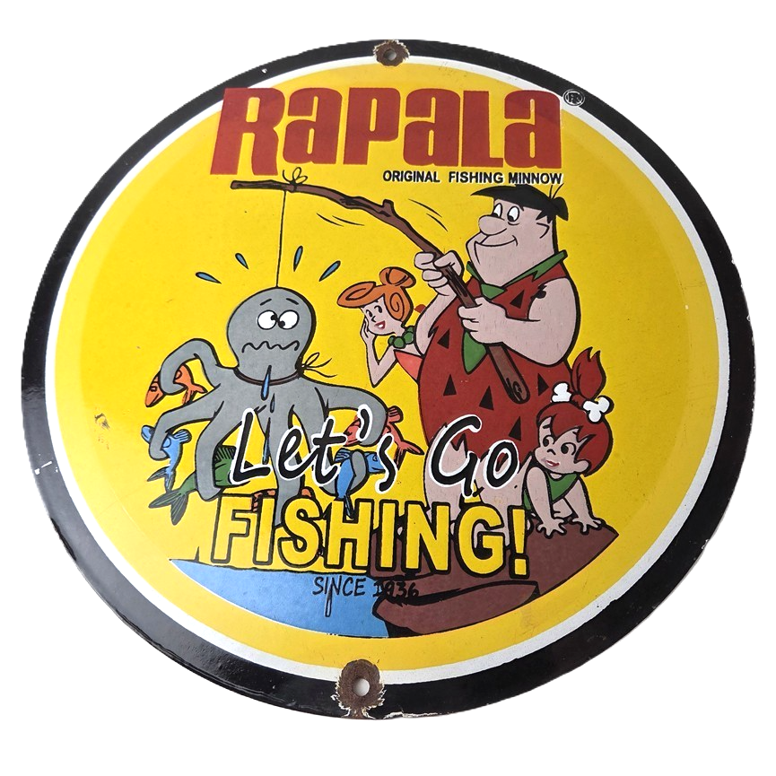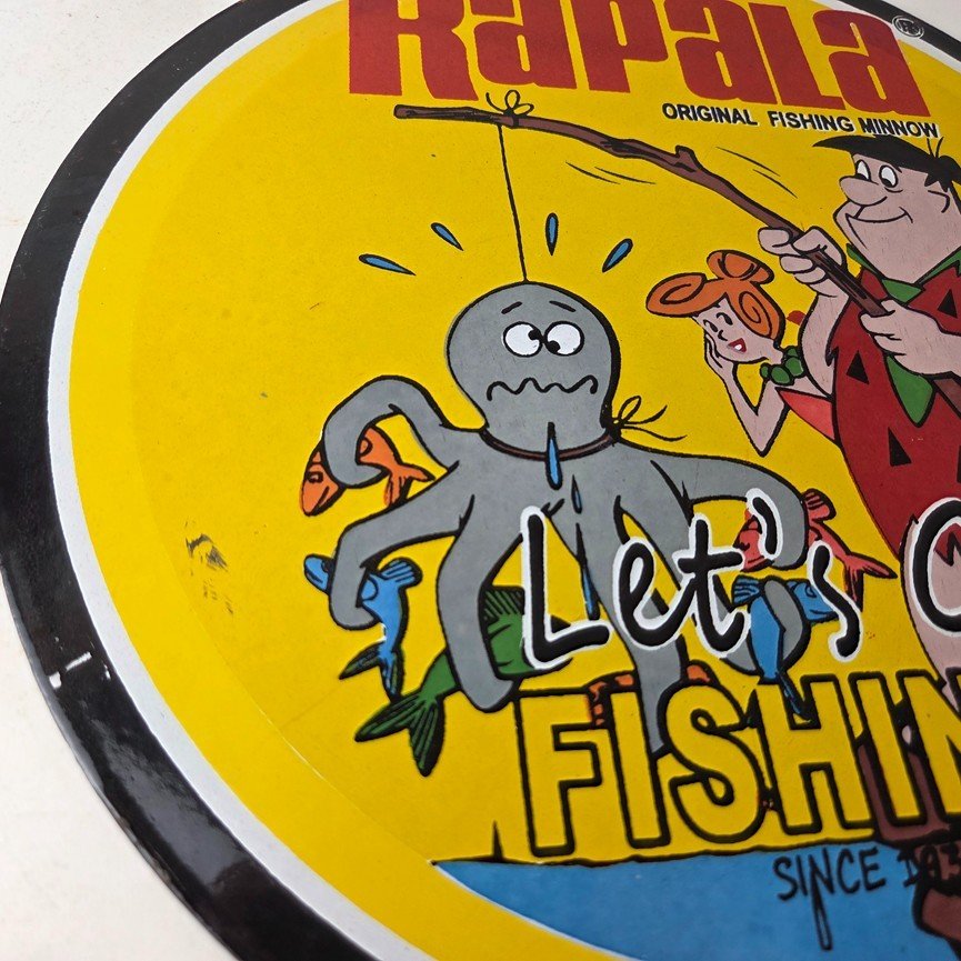This vintage Rapala porcelain fishing lures sign measures 12″ across. With its vibrant colors it will add a touch of nostalgia to any space. The sign features a graphic of Barney from the Flintstones. The brand is Rapala, this unique piece of merchandise and memorabilia is a great addition to any collection. Perfect for your man cave, shed pub, Bar, Shop, Garage or shed!
