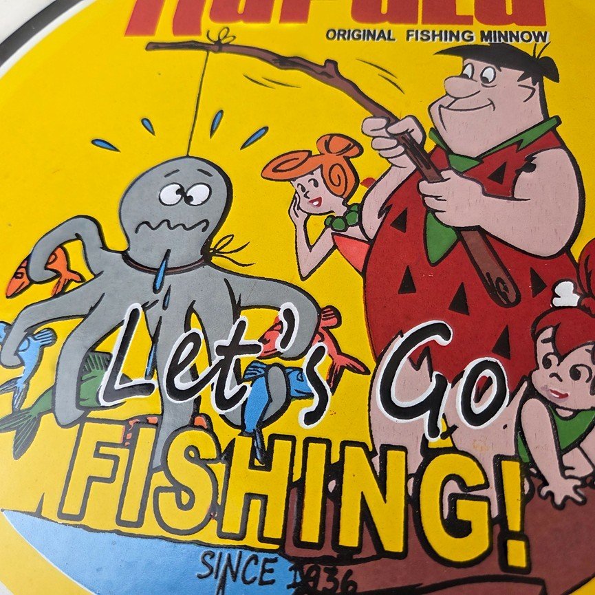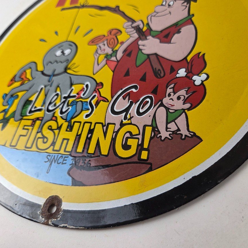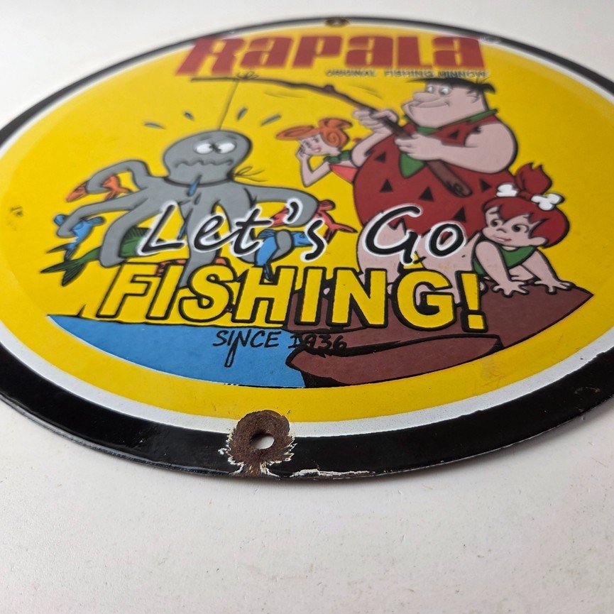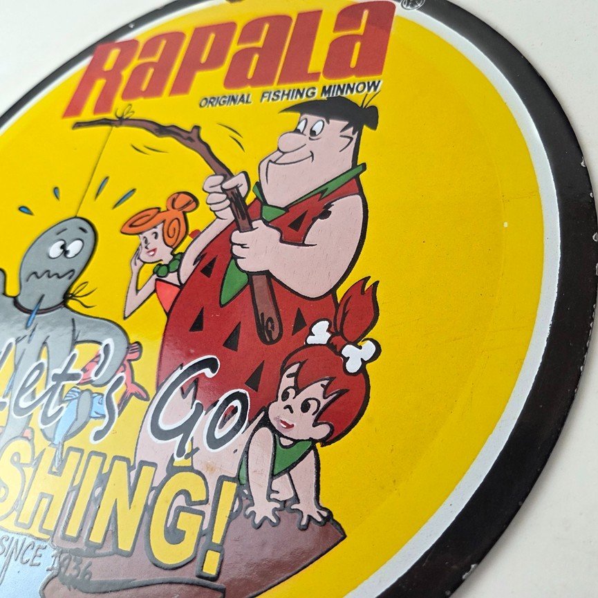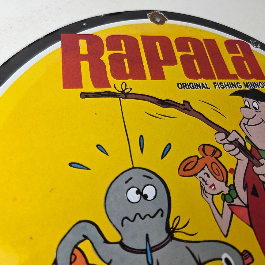 This vintage Rapala porcelain fishing lures sign measures 12″ across. With its vibrant colors it will add a touch of nostalgia to any space. The sign features a graphic of Barney from the Flintstones. The brand is Rapala, this unique piece of merchandise and memorabilia is a great addition to any collection. Perfect for your man cave, shed pub, Bar, Shop, Garage or shed!