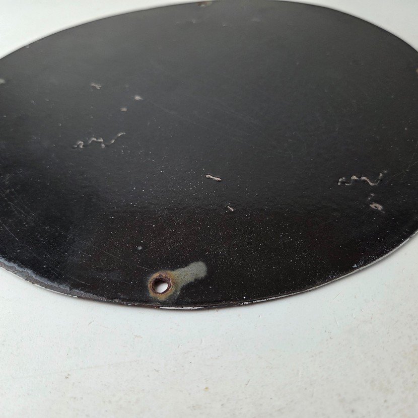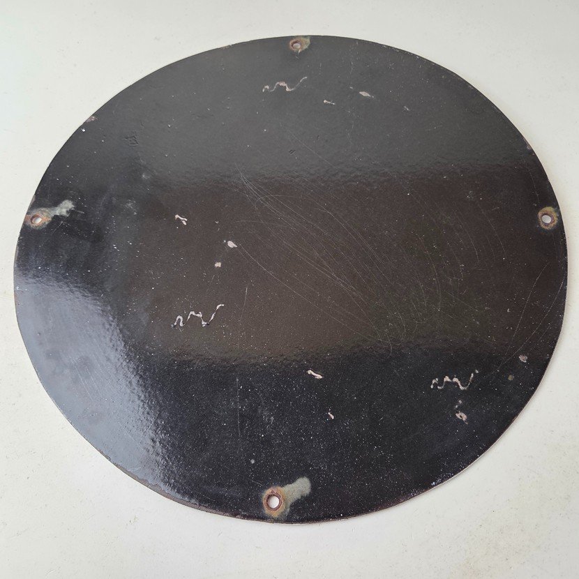 Made of porcelain enamel on steel with patina and wear: rust spotting around the mounting holes, minor edge chips, light surface scratches, and minimal discoloration. This is a porcelain enamel advertising sign in excellent condition, exactly as shown in the photos.