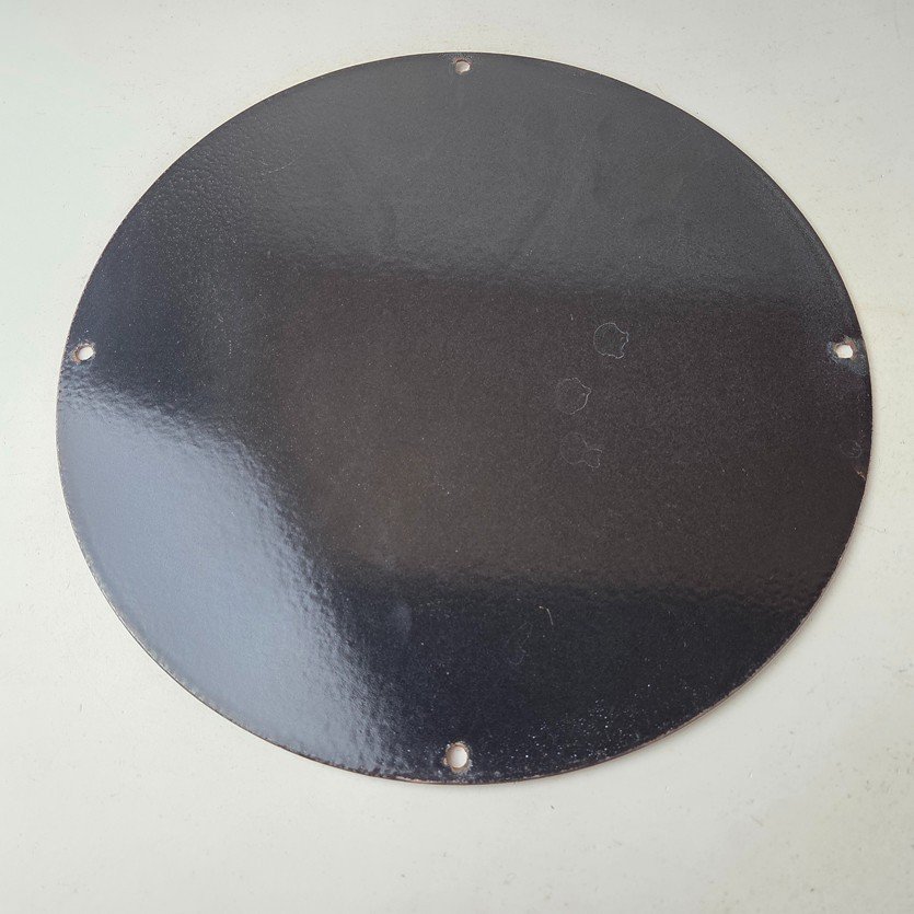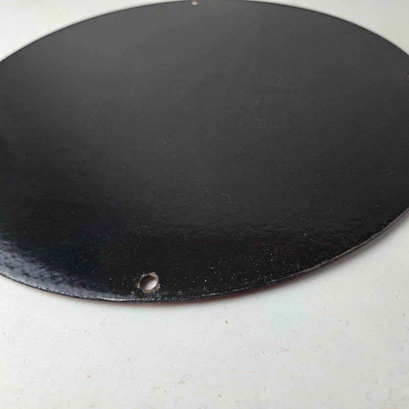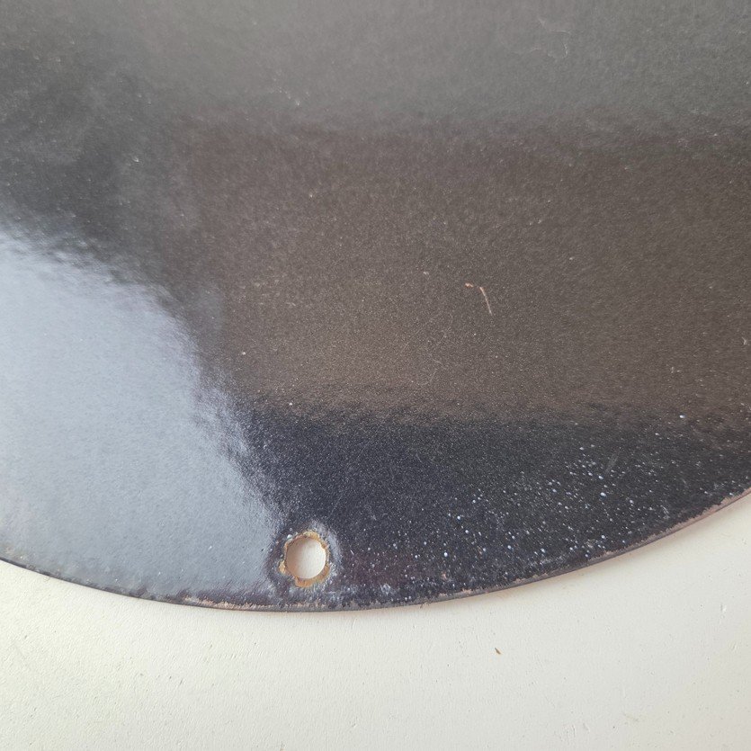 Made of porcelain enamel on steel with patina and wear: rust spotting around the mounting holes, minor edge chips, light surface scratches, and minimal discoloration. This is a porcelain enamel advertising sign in excellent condition, exactly as shown in the photos.