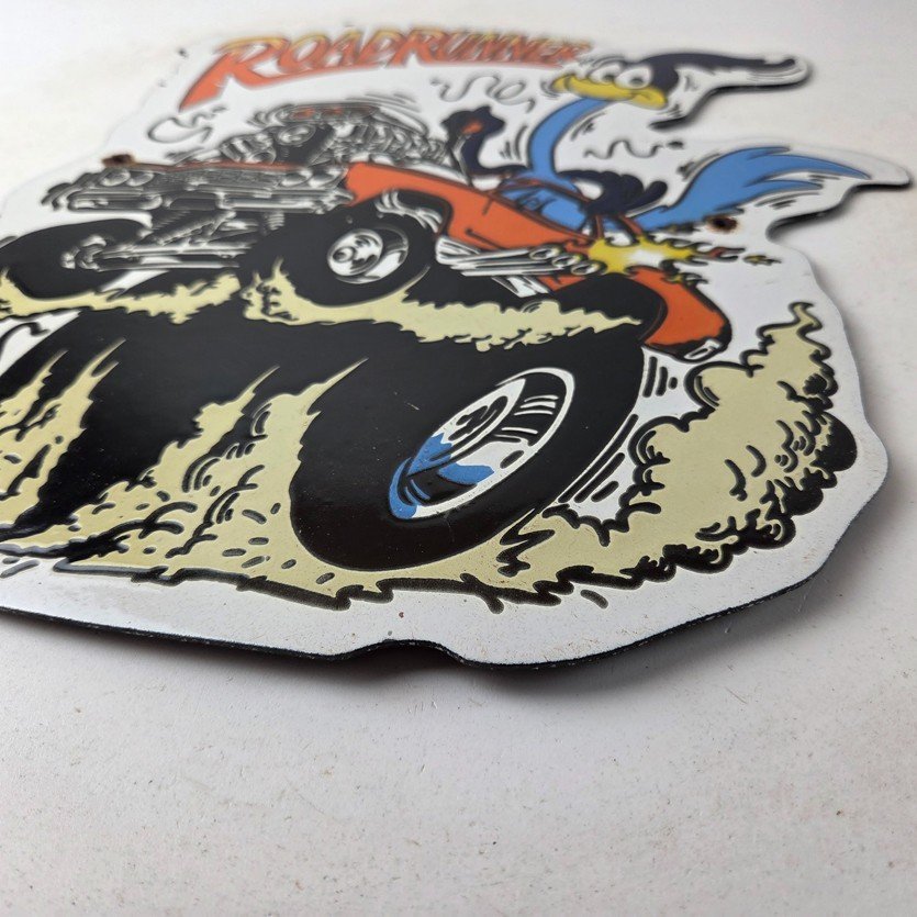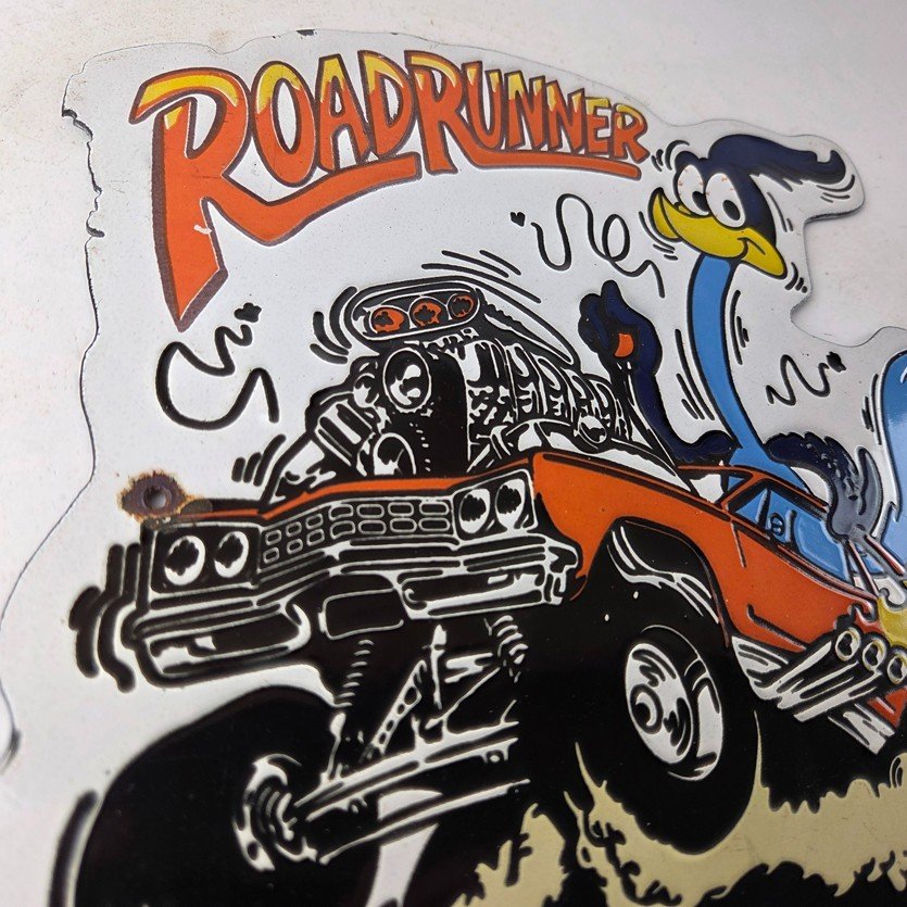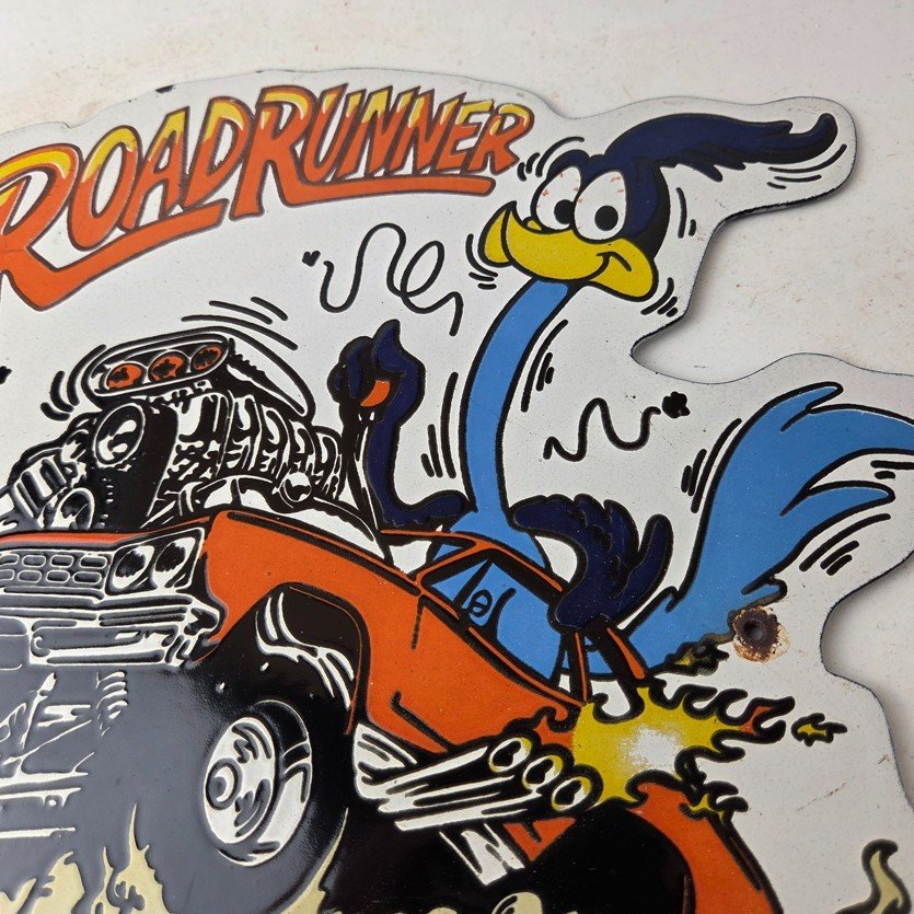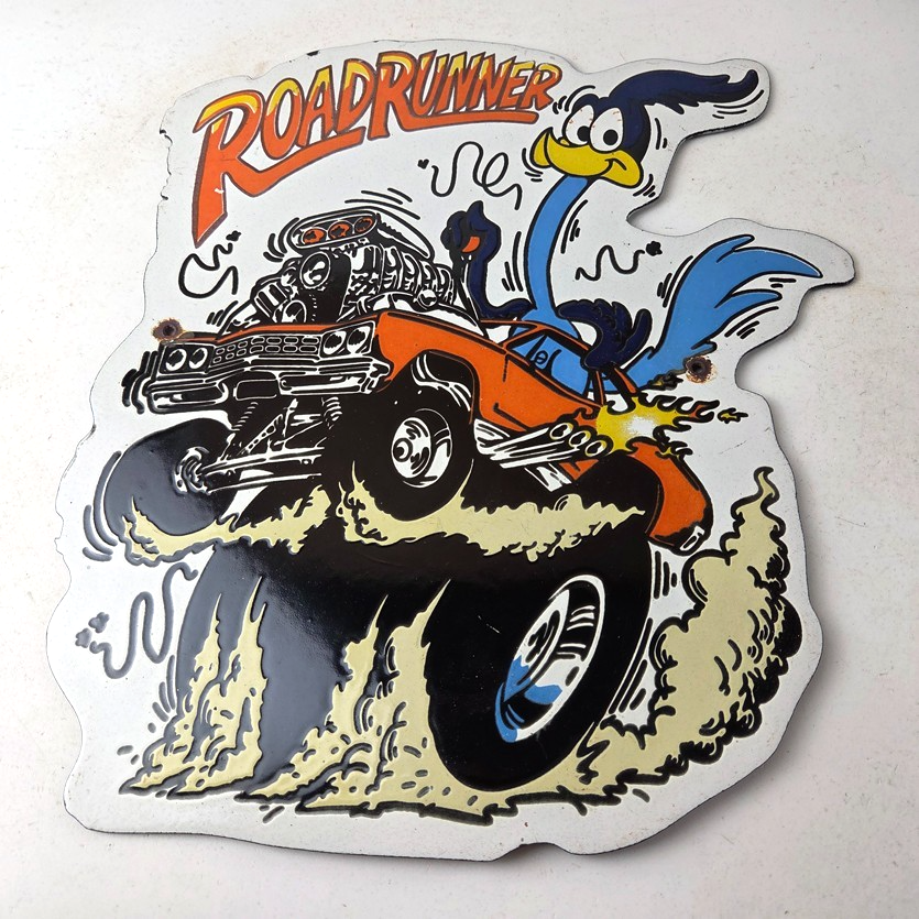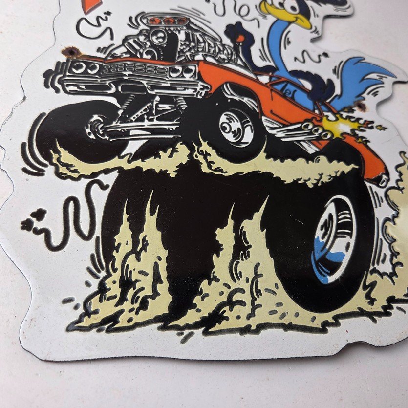 This vintage porcelain sign features the iconic Rat Fink character Road Runner. The sign is perfect for hot rod enthusiasts and collectors of gas and oil memorabilia. This pump plate wall sign showcases the Plymouth Road Runner edition. It is a unique piece of advertising that would make a great addition to any collection or display.