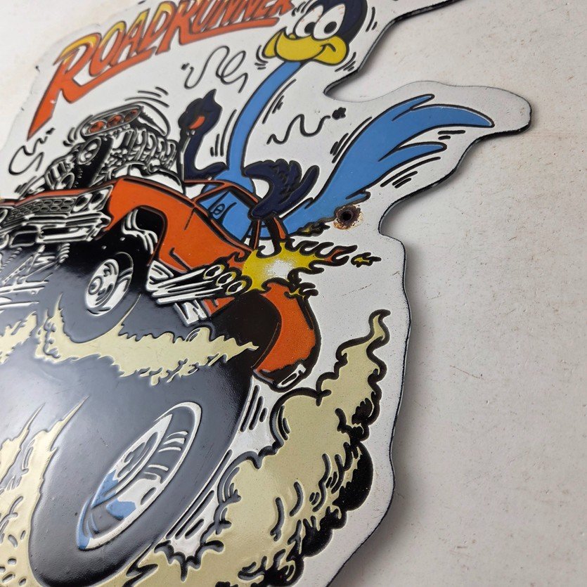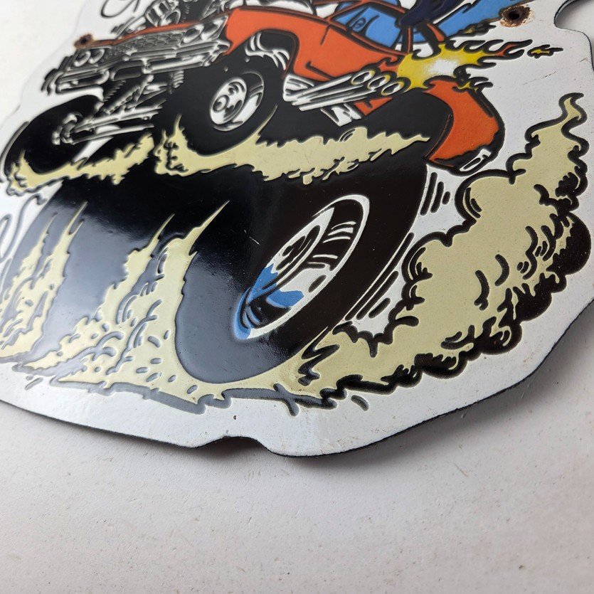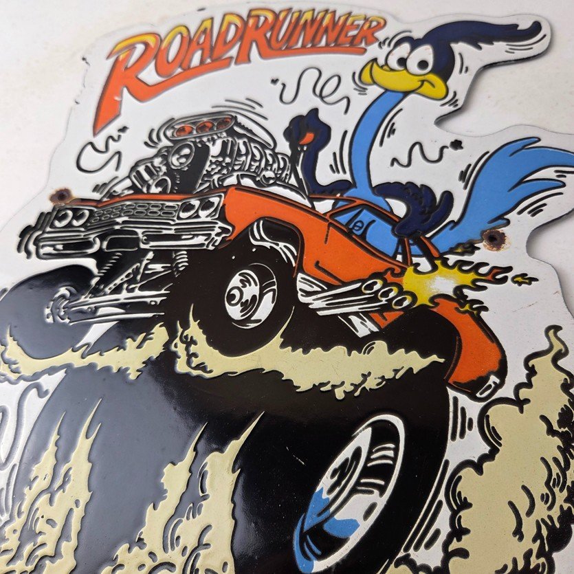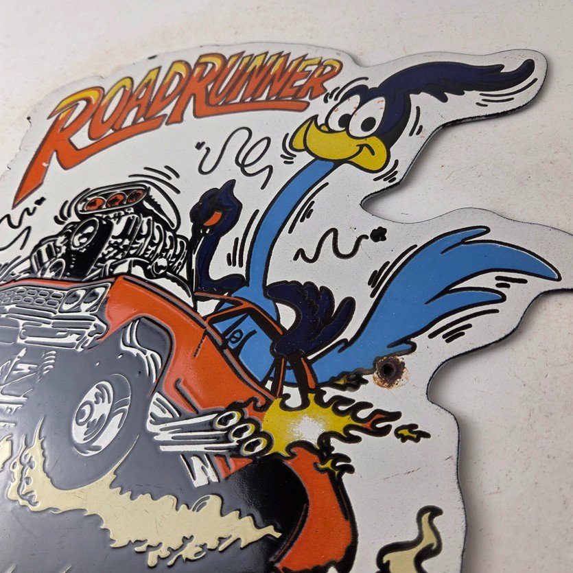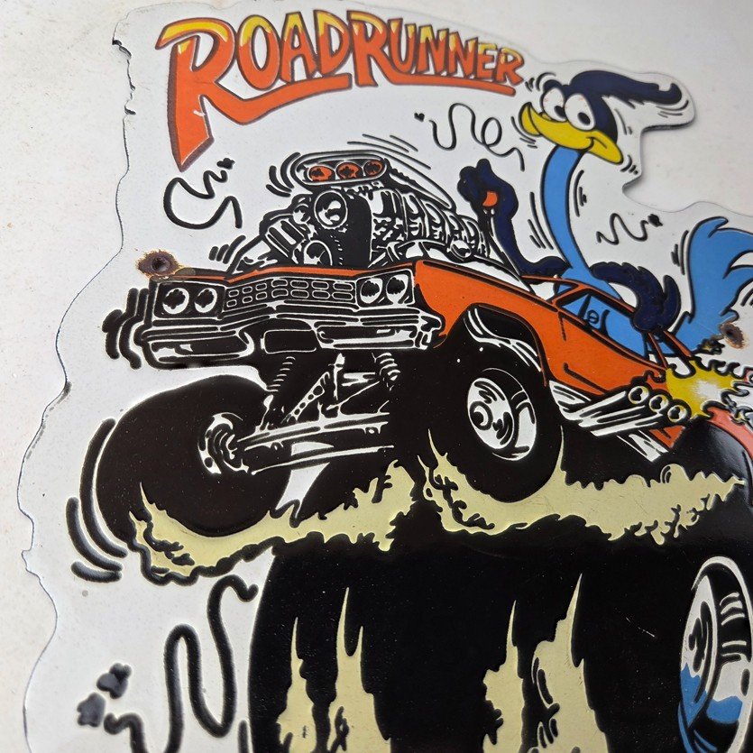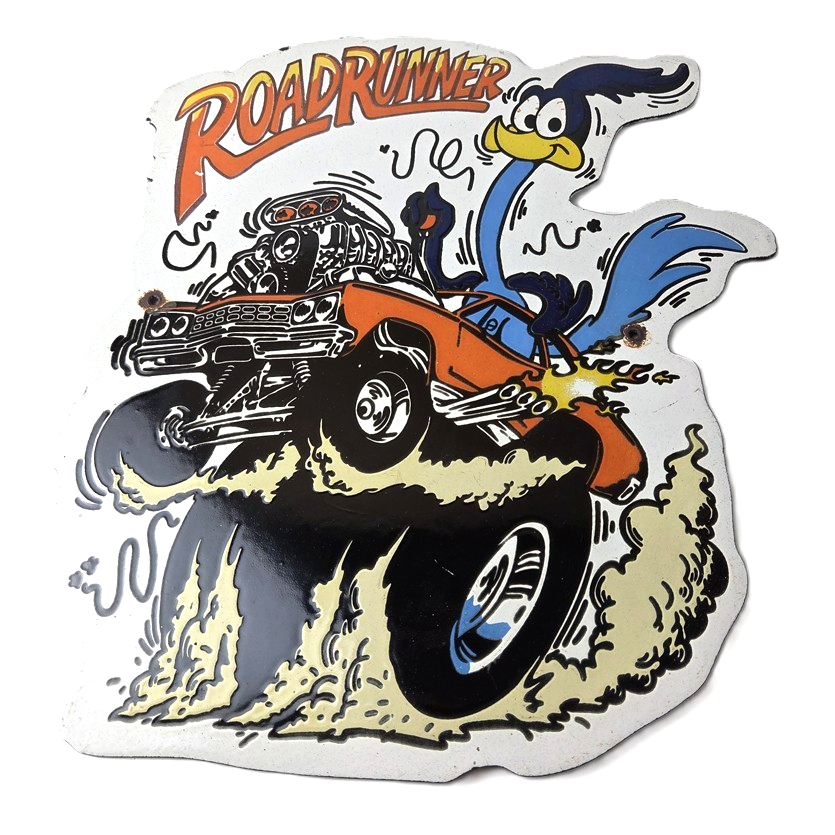 This vintage porcelain sign features the iconic Rat Fink character Road Runner. The sign is perfect for hot rod enthusiasts and collectors of gas and oil memorabilia. This pump plate wall sign showcases the Plymouth Road Runner edition. It is a unique piece of advertising that would make a great addition to any collection or display.