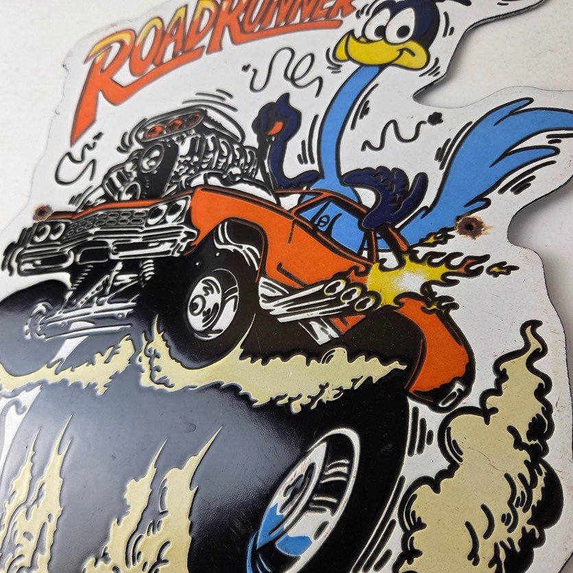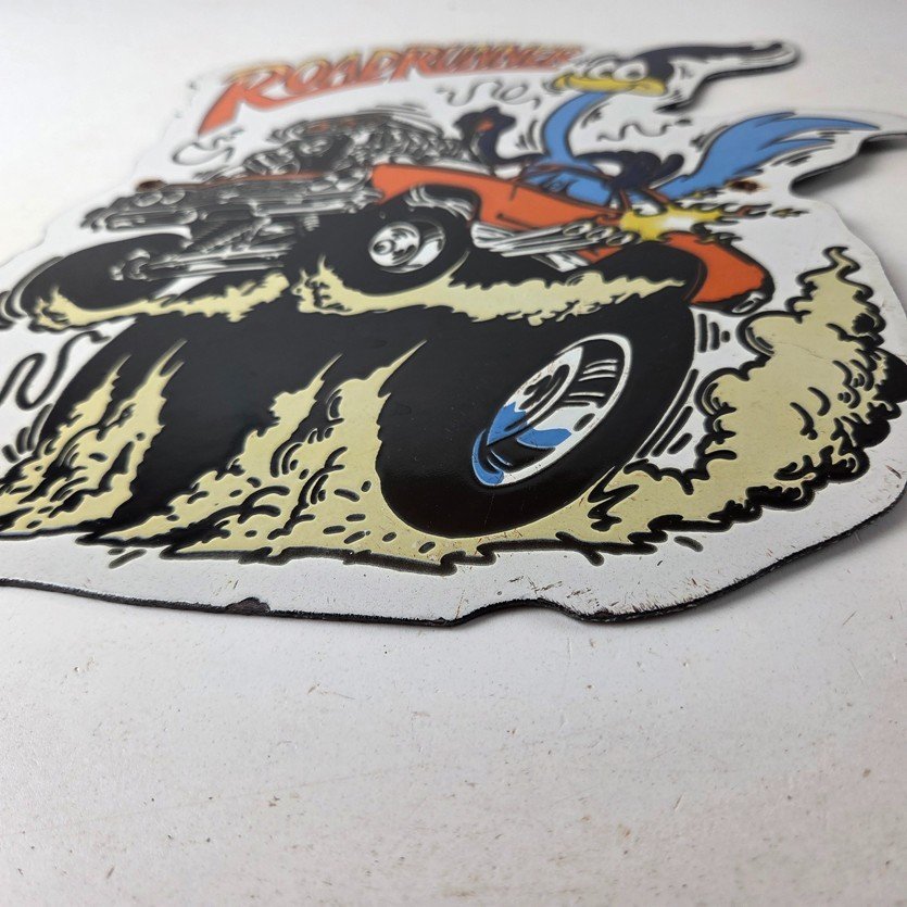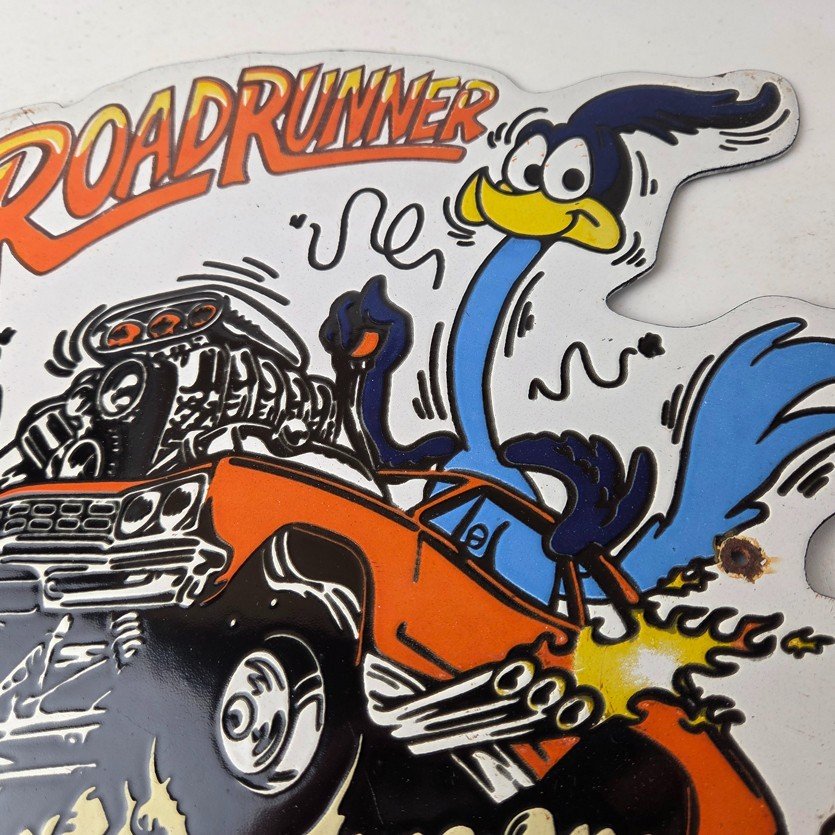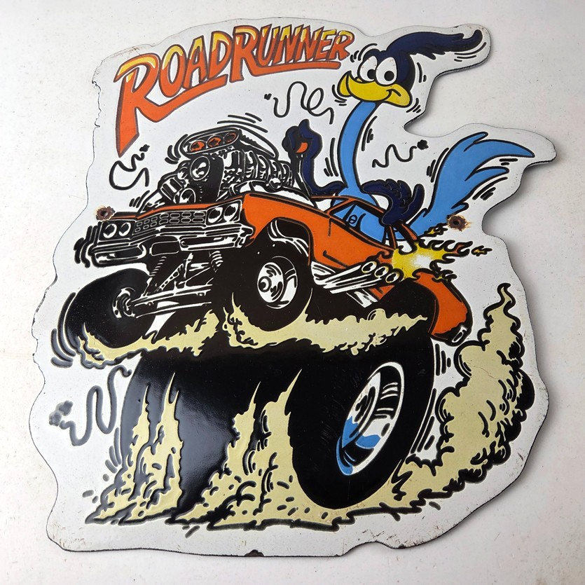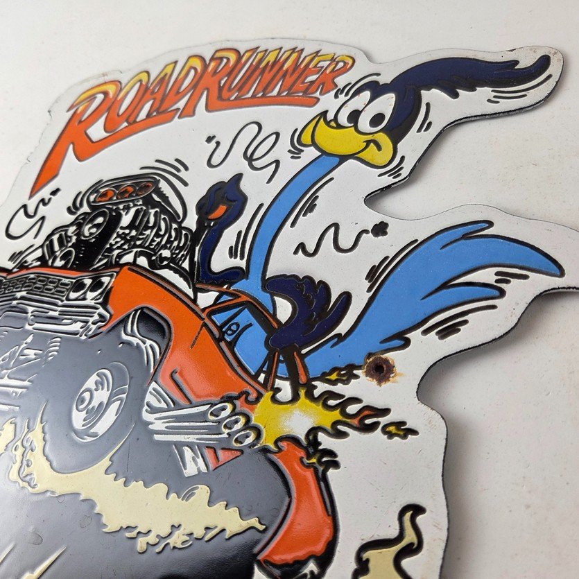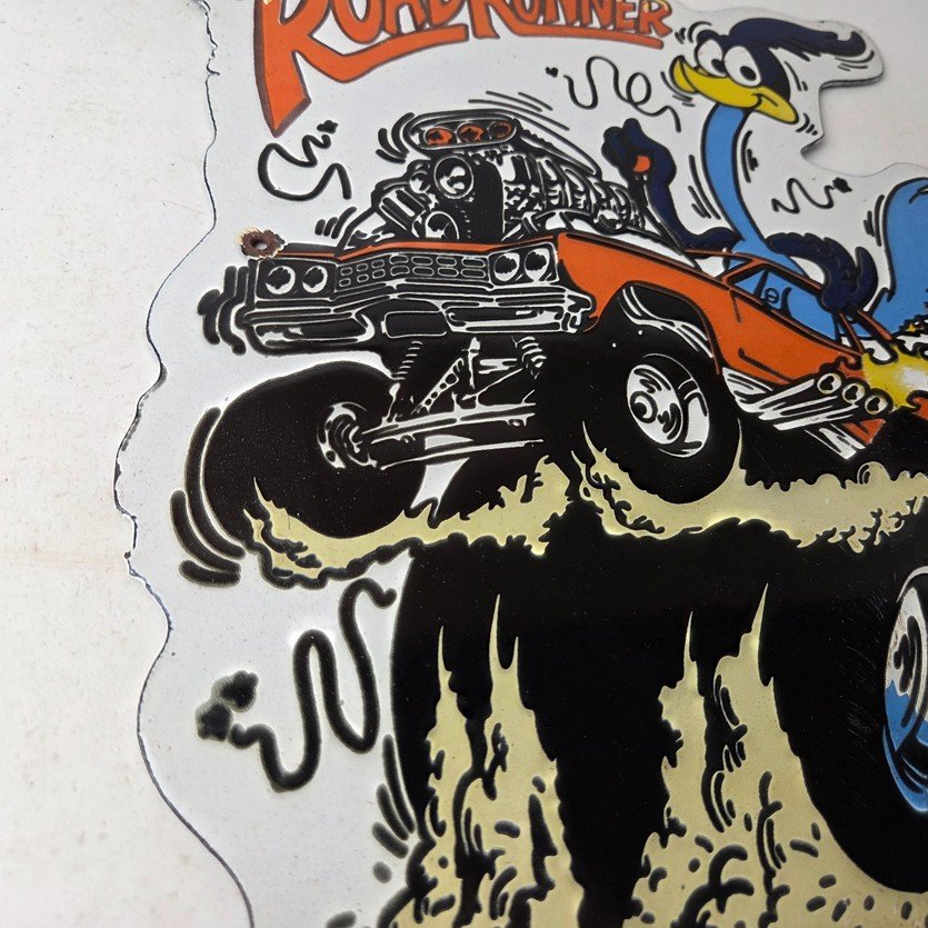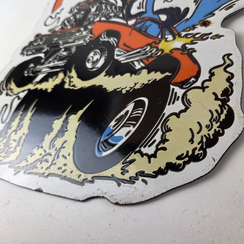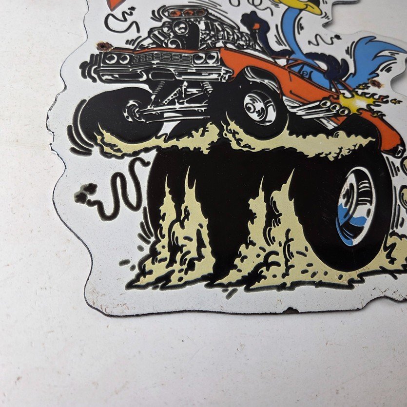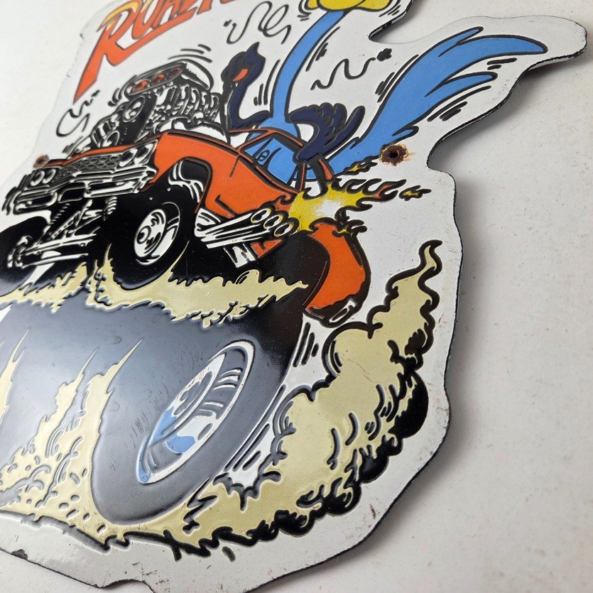 This vintage porcelain sign features the iconic Rat Fink character Road Runner. The sign is perfect for hot rod enthusiasts and collectors of gas and oil memorabilia. This pump plate wall sign showcases the Plymouth Road Runner edition. It is a unique piece of advertising that would make a great addition to any collection or display.