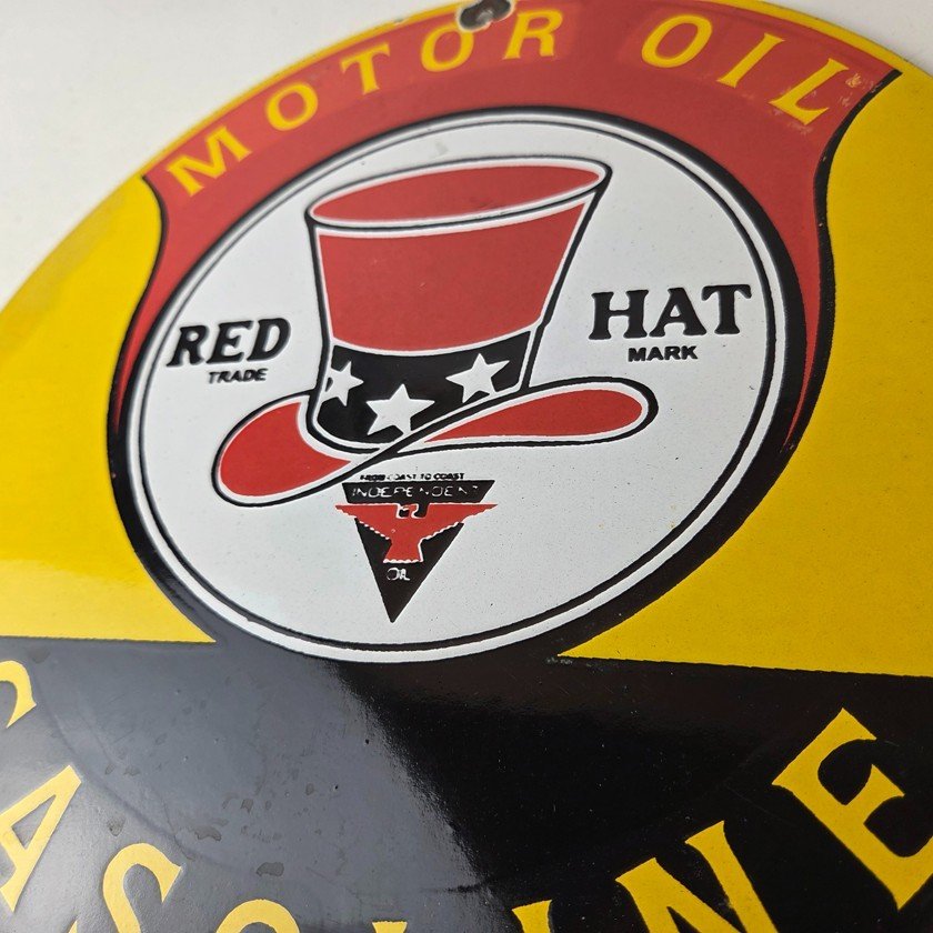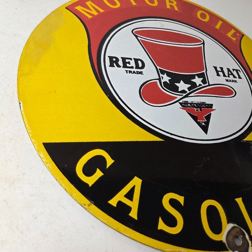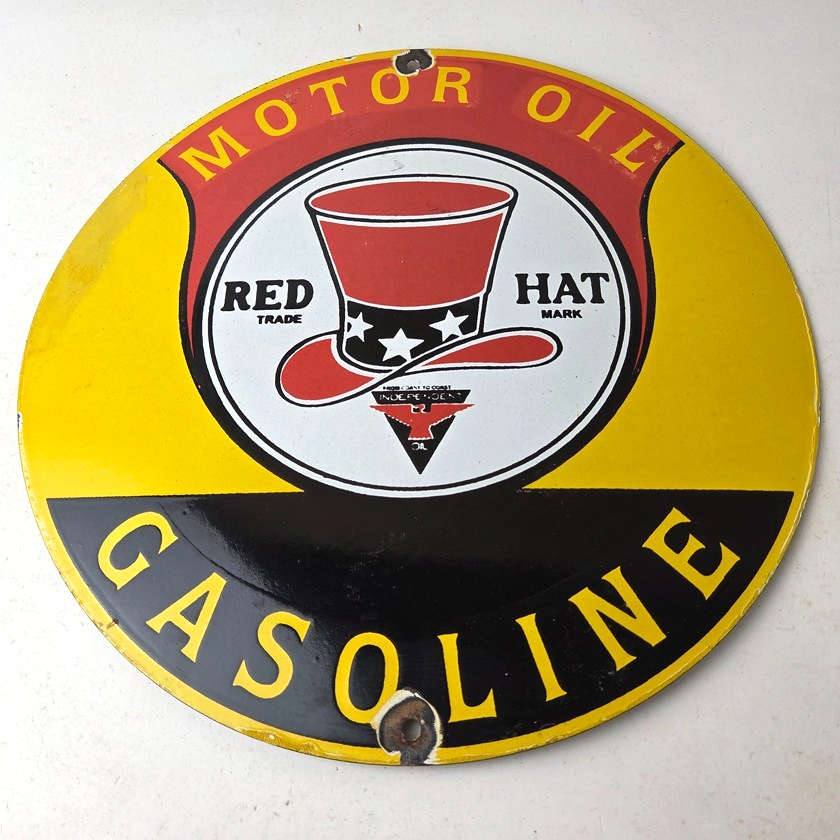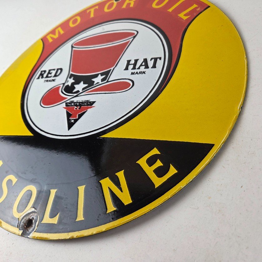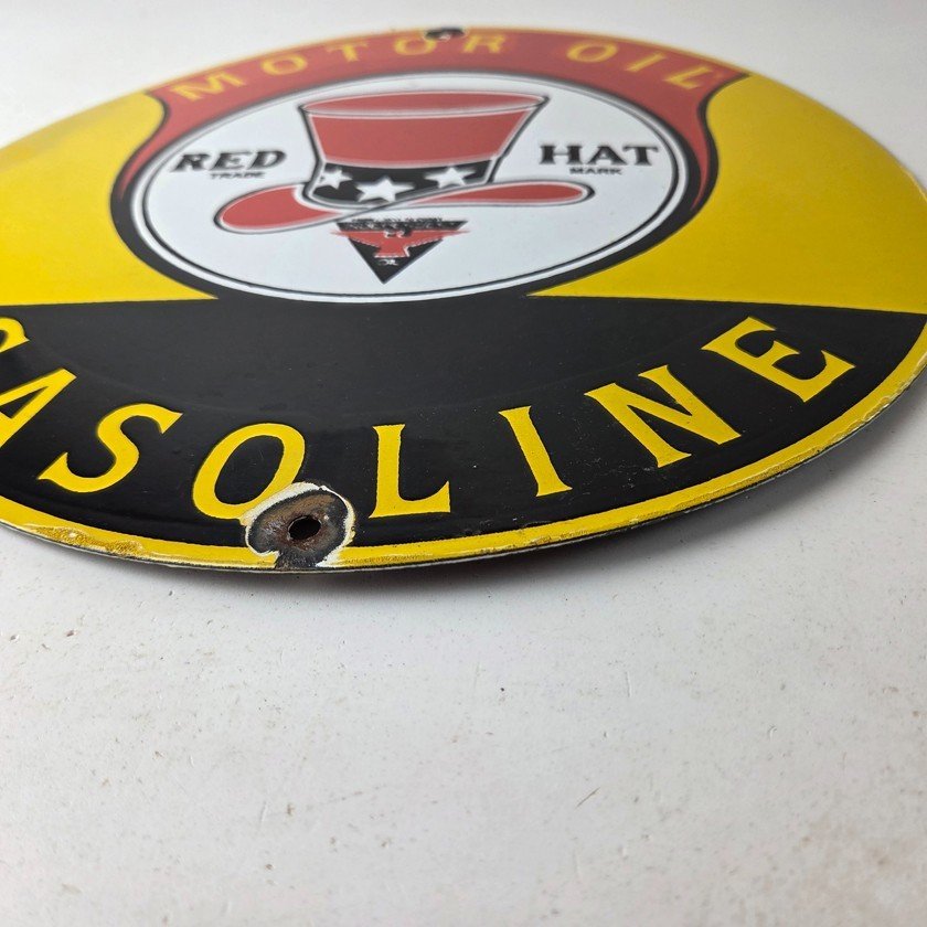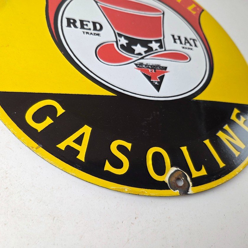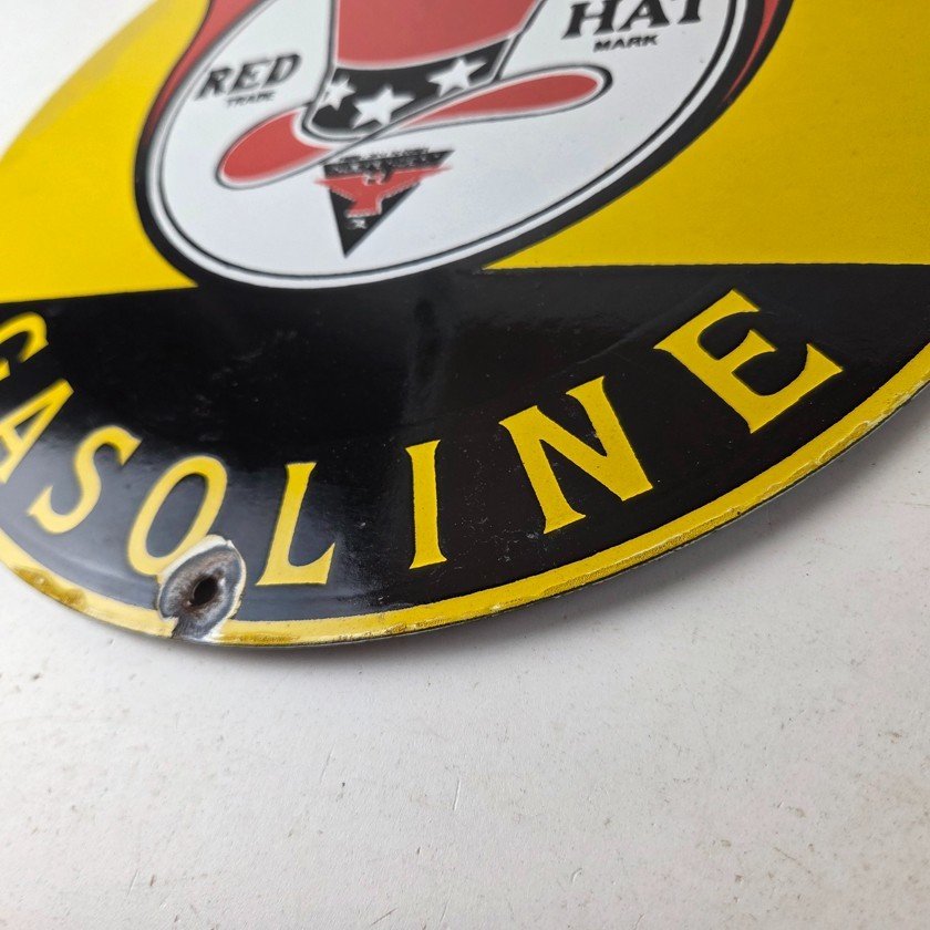 • Vintage Red Hat Gasoline porcelain sign.