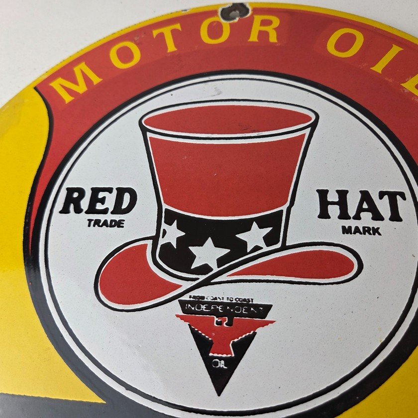 Vintage Red Hat Motor Oil Porcelain Sign – Gasoline Pump Plate Service Ad Sign