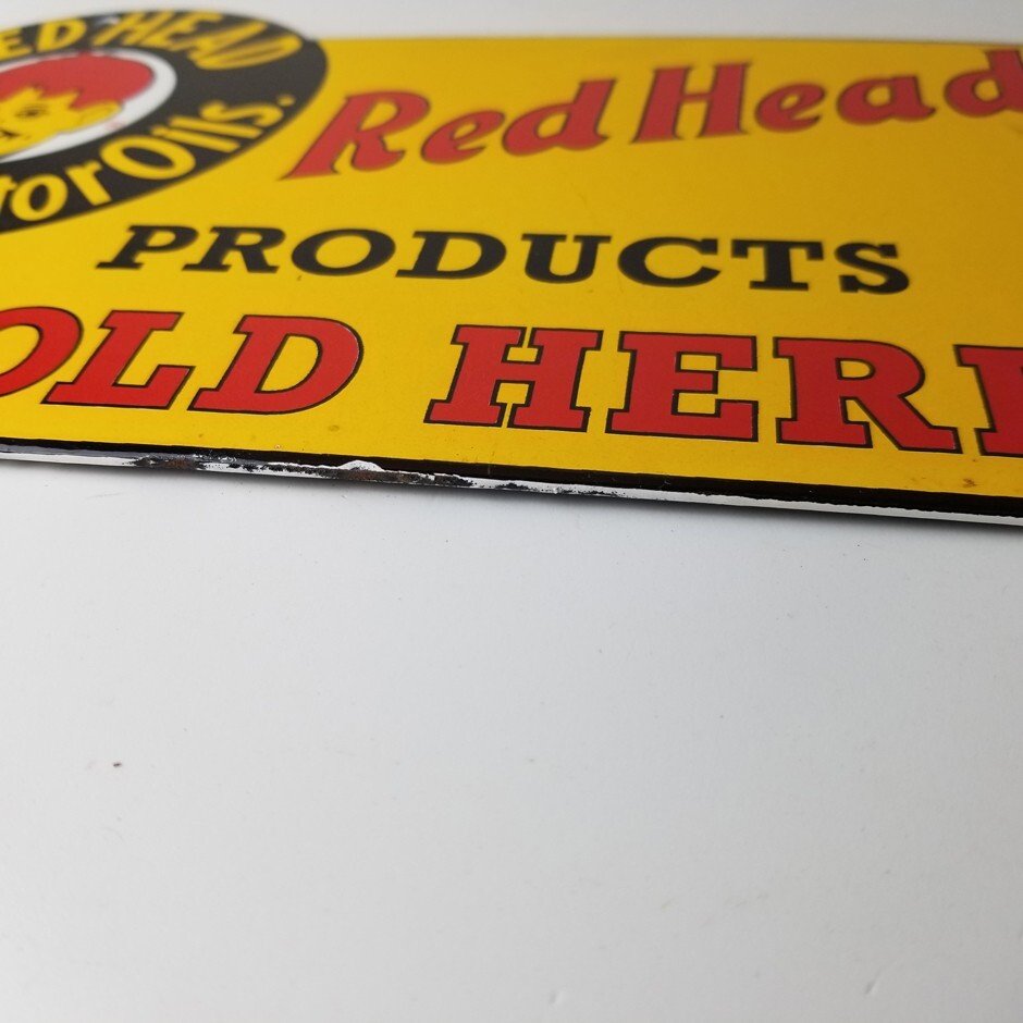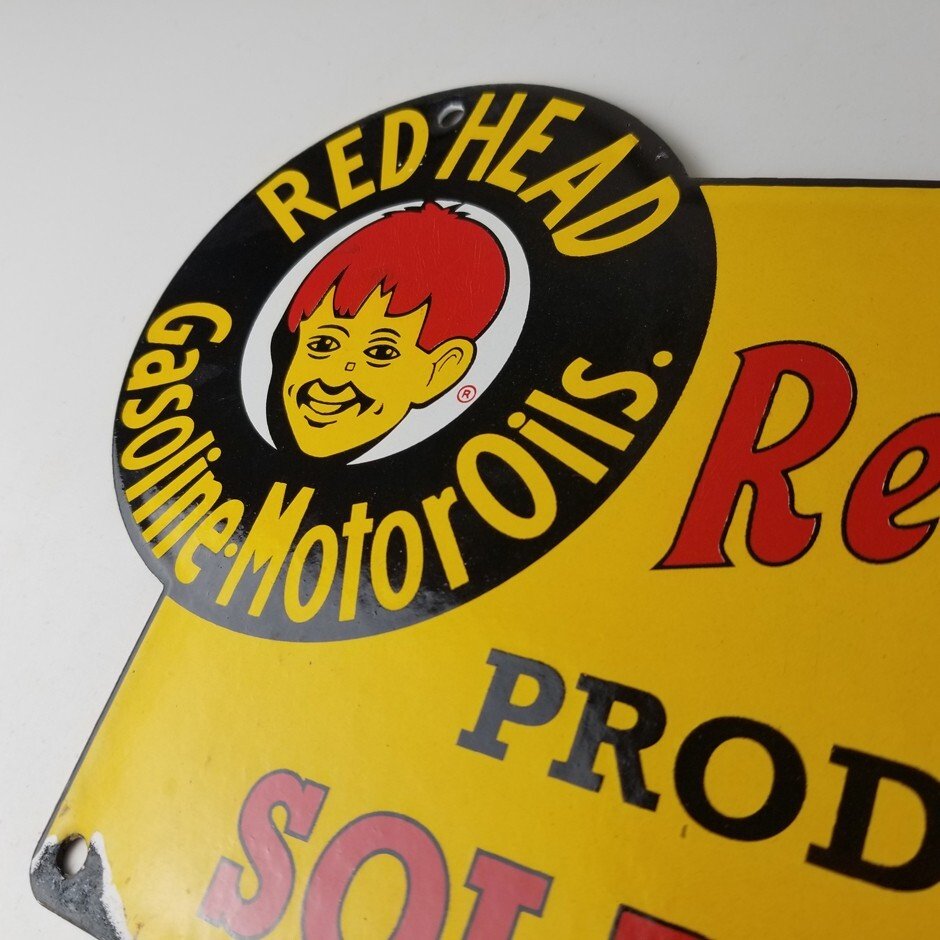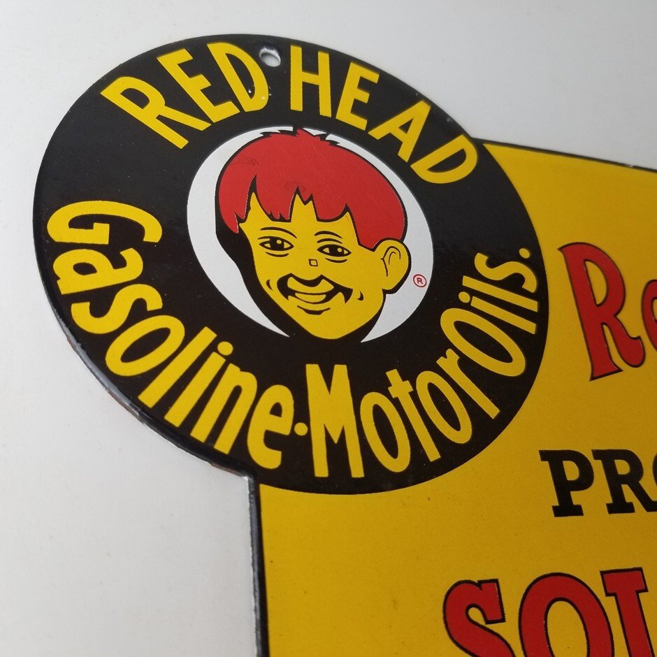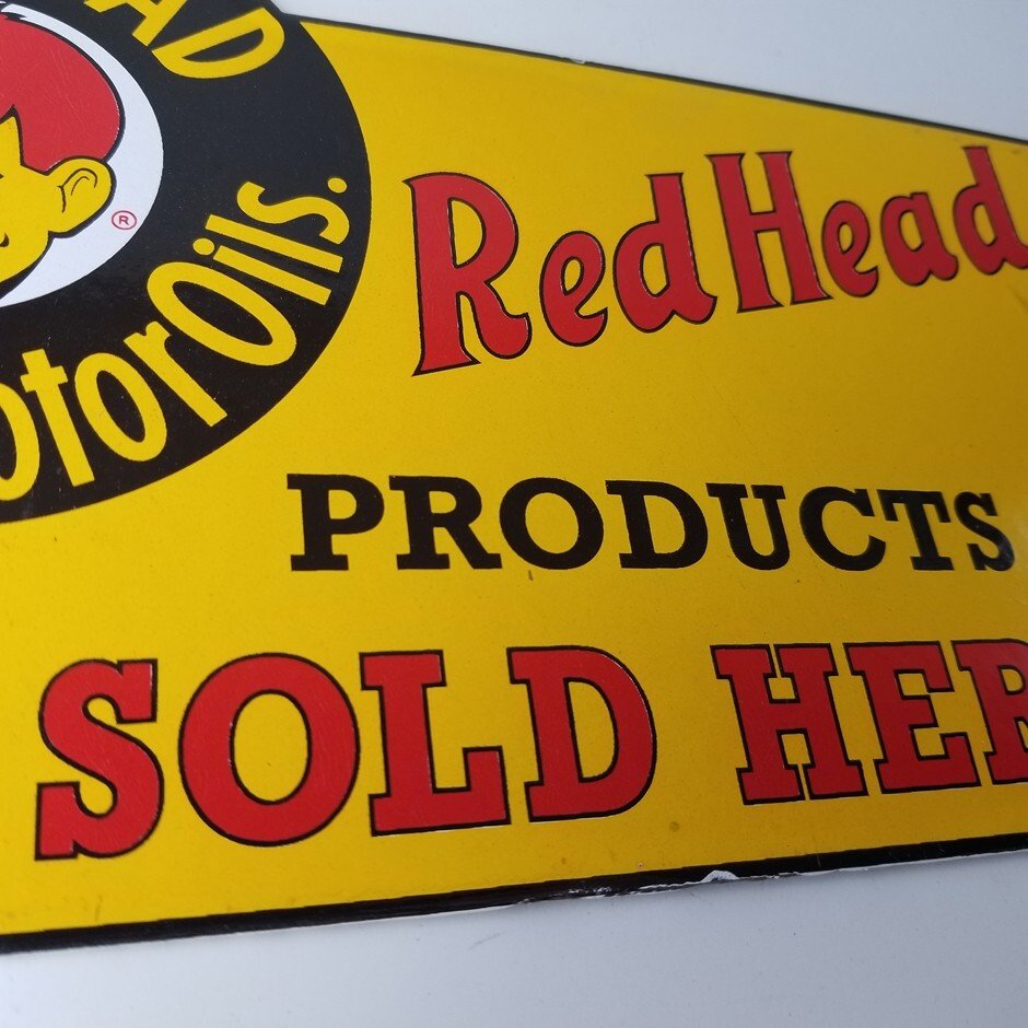 This vintage Red Head Motor Oil porcelain sign is a must-have for any collector of gas and oil memorabilia.