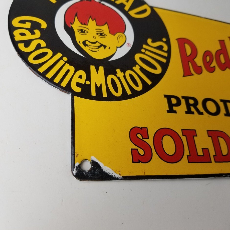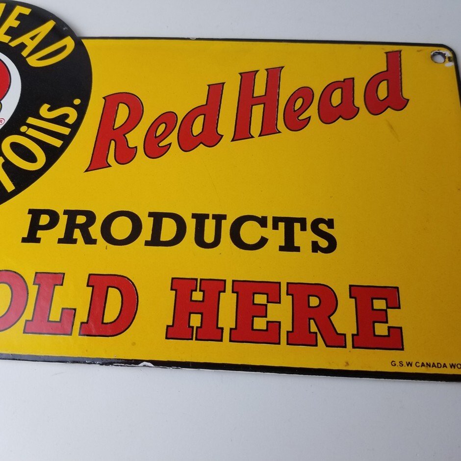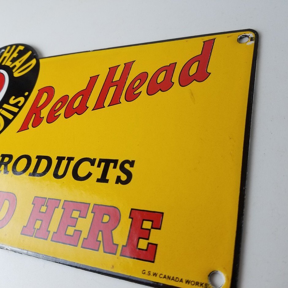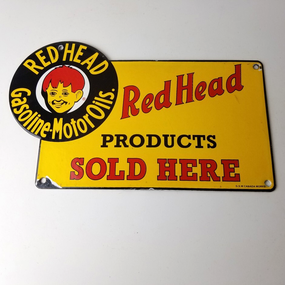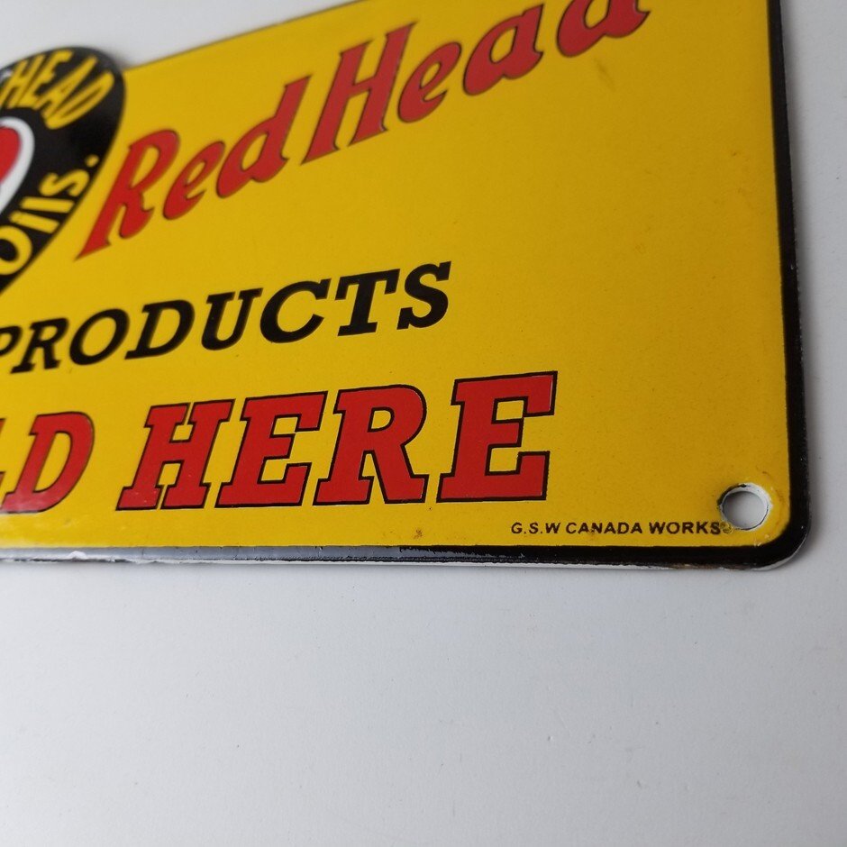 This vintage Red Head Motor Oil porcelain sign is a must-have for any collector of gas and oil memorabilia.