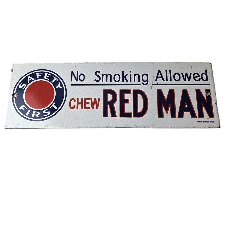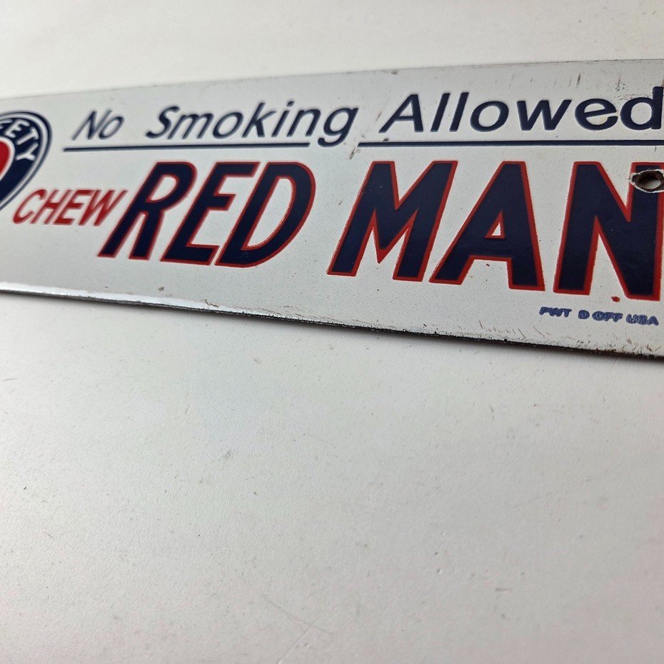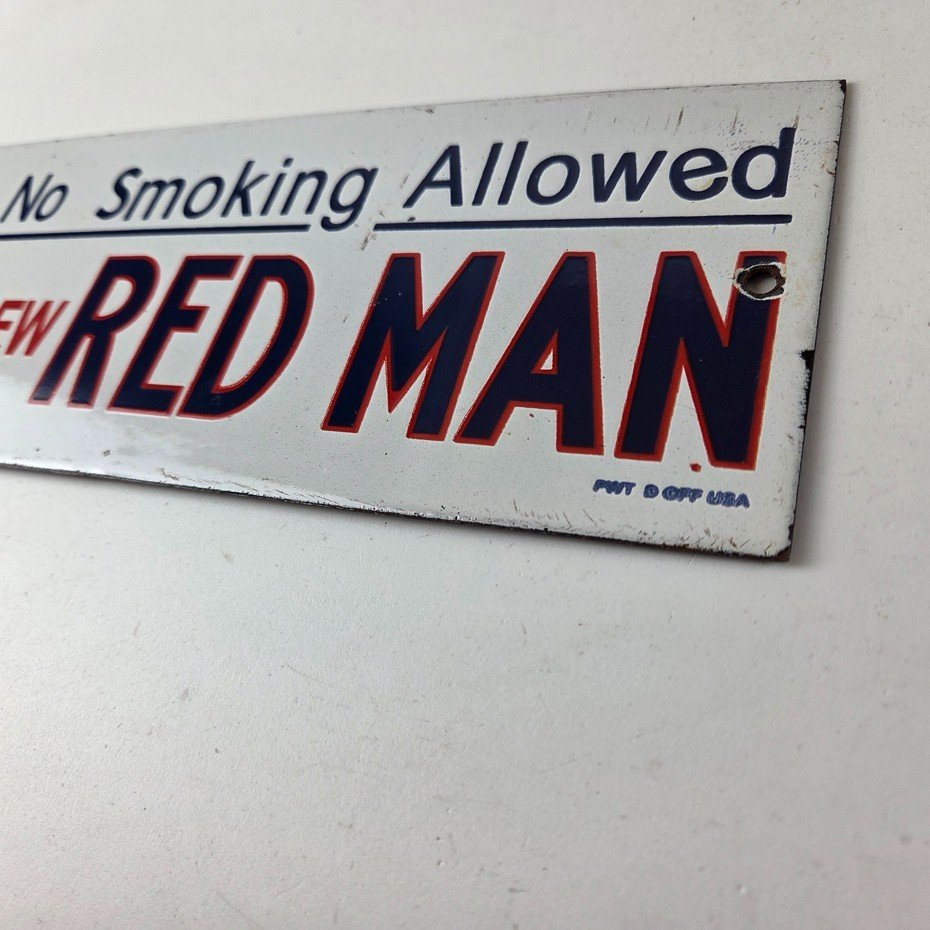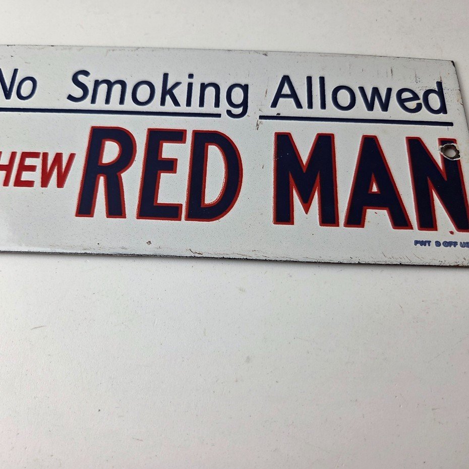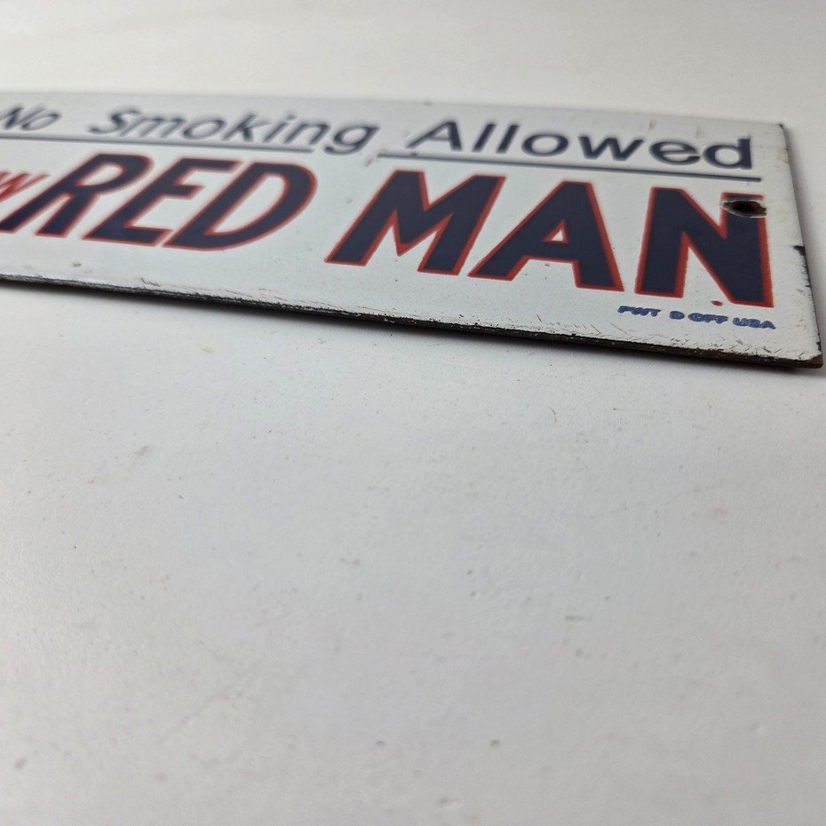 This vintage Red Man Chewing Tobacco porcelain sign features the large Red Man lettering and is sure to be a great addition to any collection. Measuring at 12 inches in size by 4 inches tall, it boasts a striking color scheme that catches the eye.