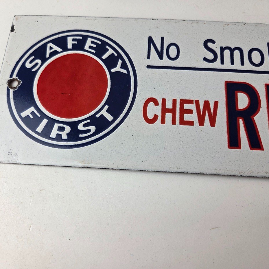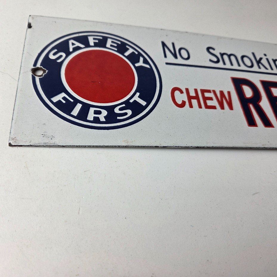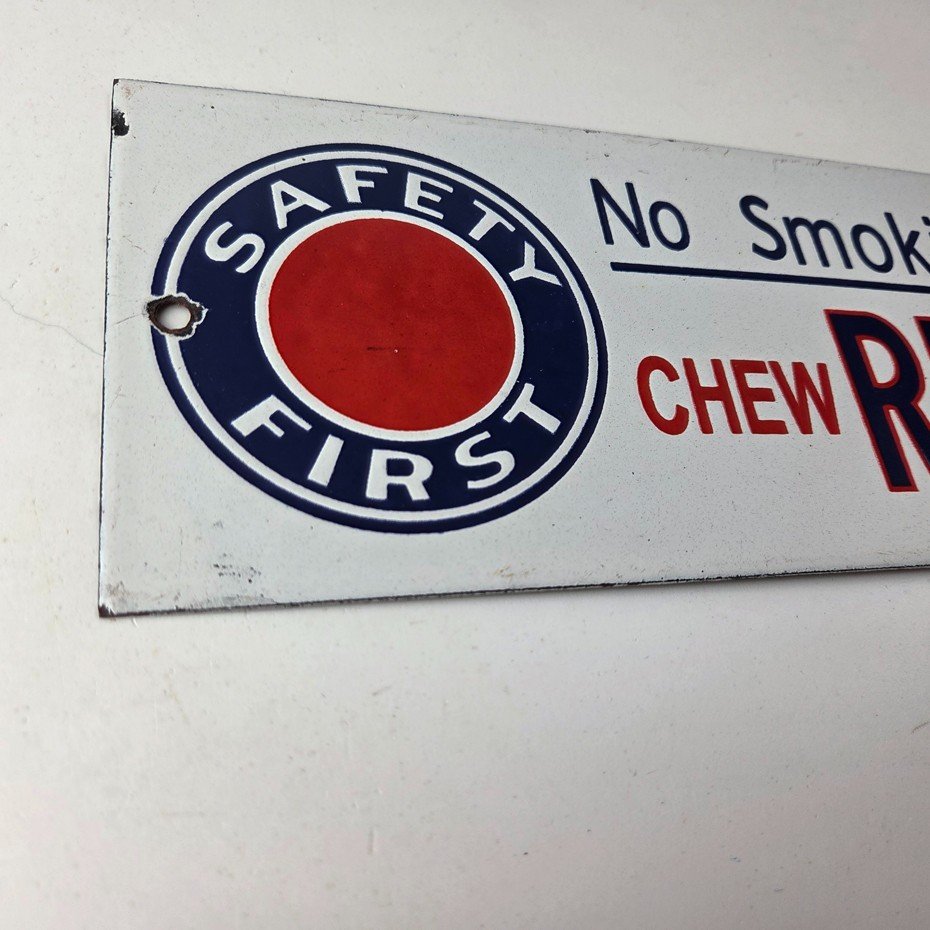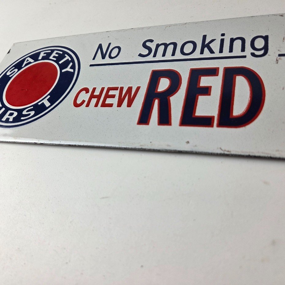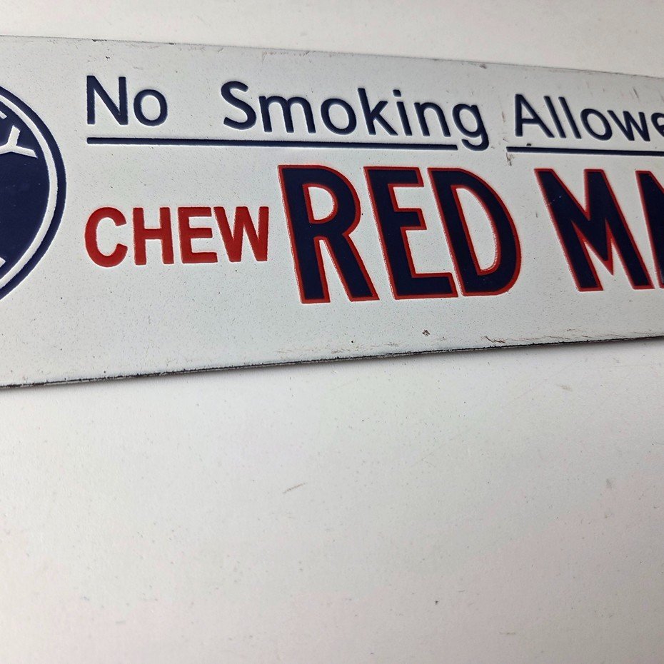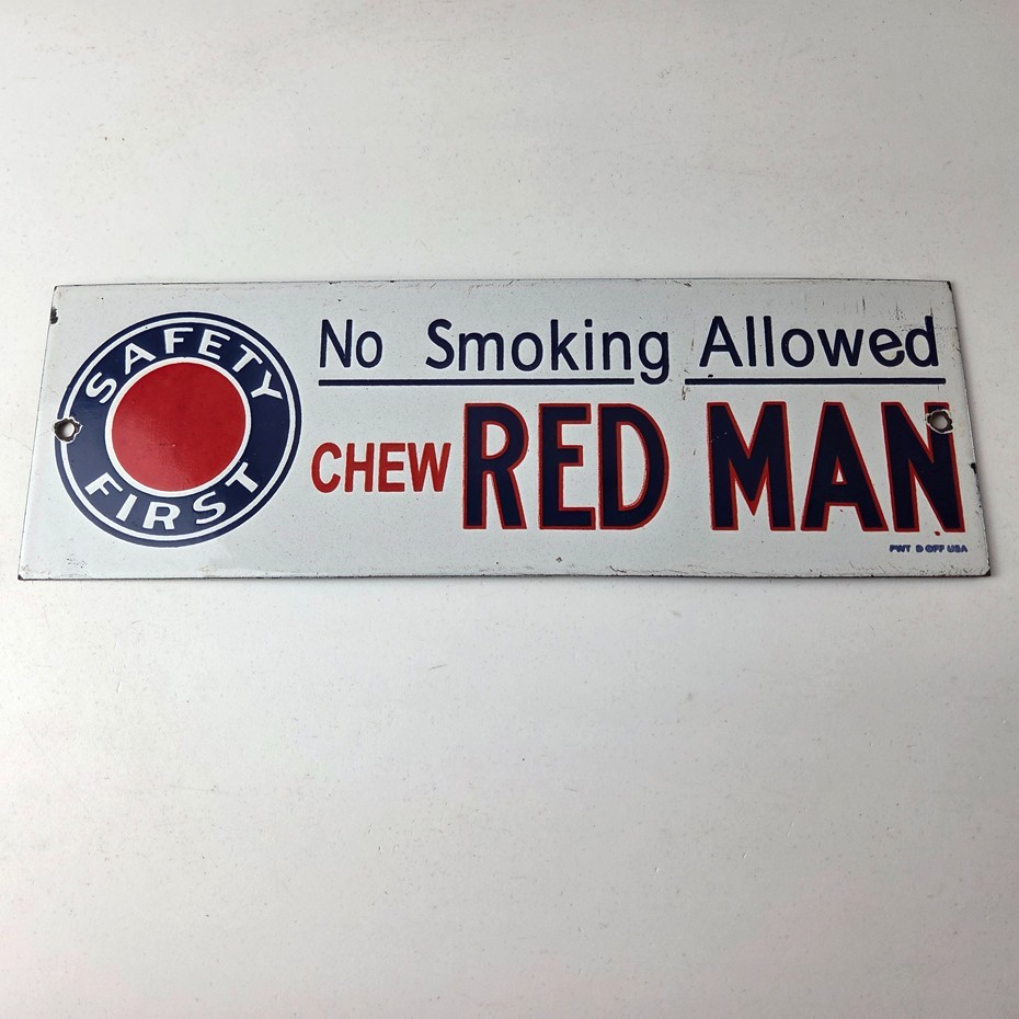 This vintage Red Man Chewing Tobacco porcelain sign features the large Red Man lettering and is sure to be a great addition to any collection. Measuring at 12 inches in size by 4 inches tall, it boasts a striking color scheme that catches the eye.