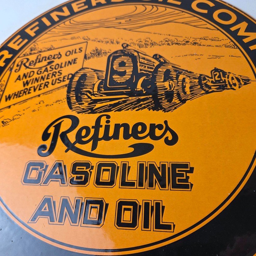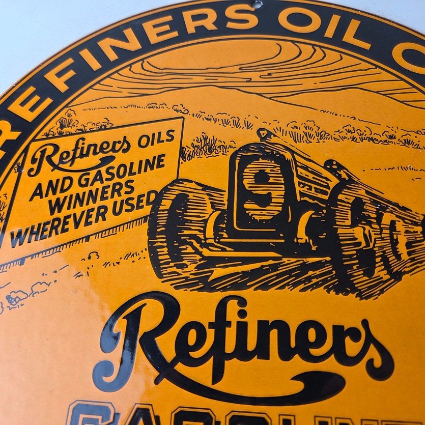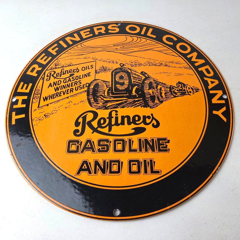 This vintage Refiners Motors Oil Porcelain sign features the iconic race cars with the gas & motor oil advertisement theme. The sign measured 11 3/4″ across and features the iconic Refiners logo and has excellent porcelain on both sides, ensuring it will last for years to come.