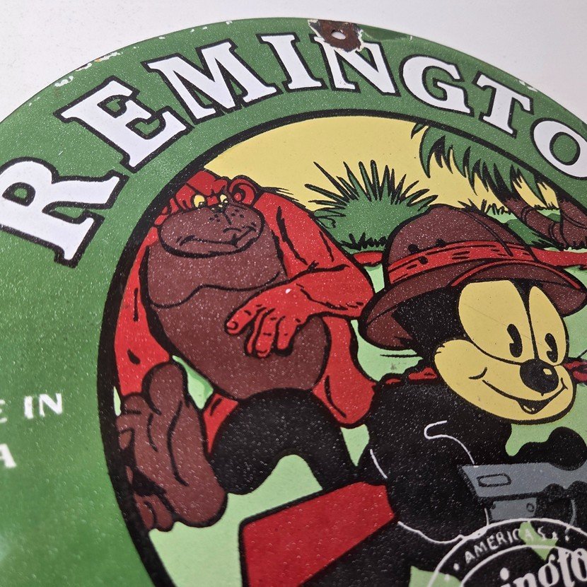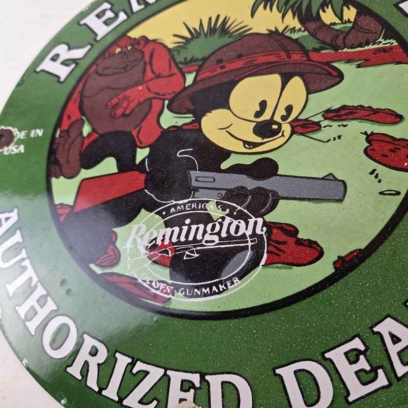 This vintage Remington porcelain sign features the iconic Remington firearm brand and is perfect for collectors of hunting and outdoor sports memorabilia. Measuring 12″ in diameter, this green sign is sure to catch the eye of any gas and oil enthusiast.