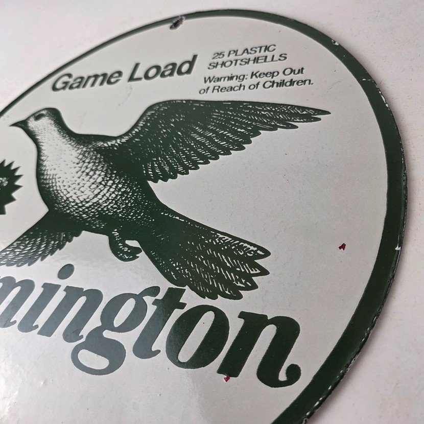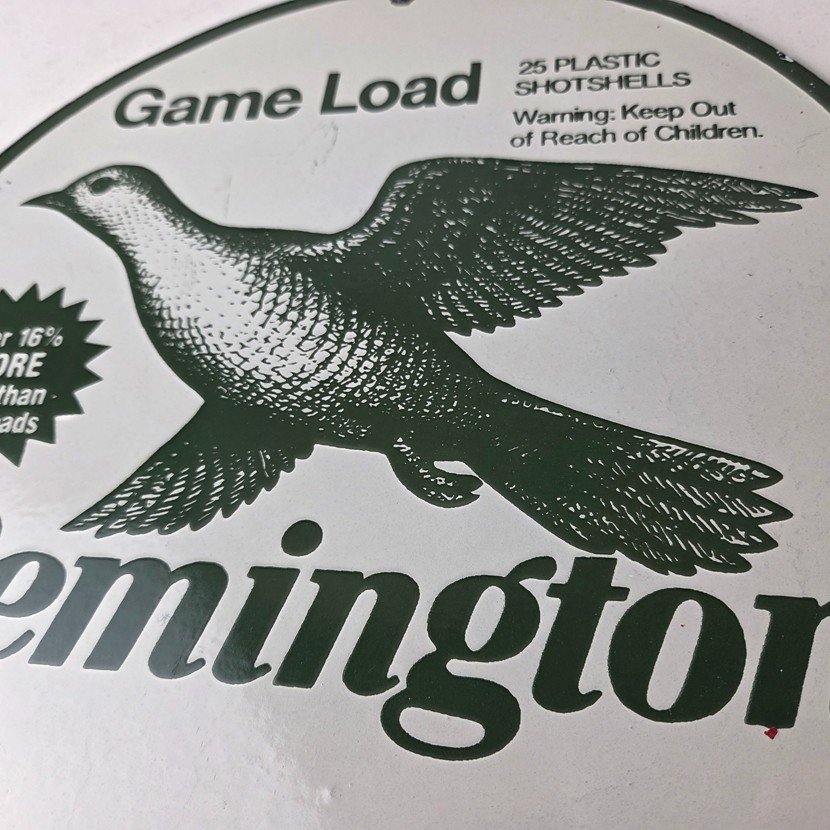 This vintage Remington Game Load bird sign makes a great addition to a garage, shop display, man cave, gun room, or any Remington memorabilia collection, vintage shotshell advertising collection, hunting/firearms sign collection, or outdoor sports memorabilia collection.