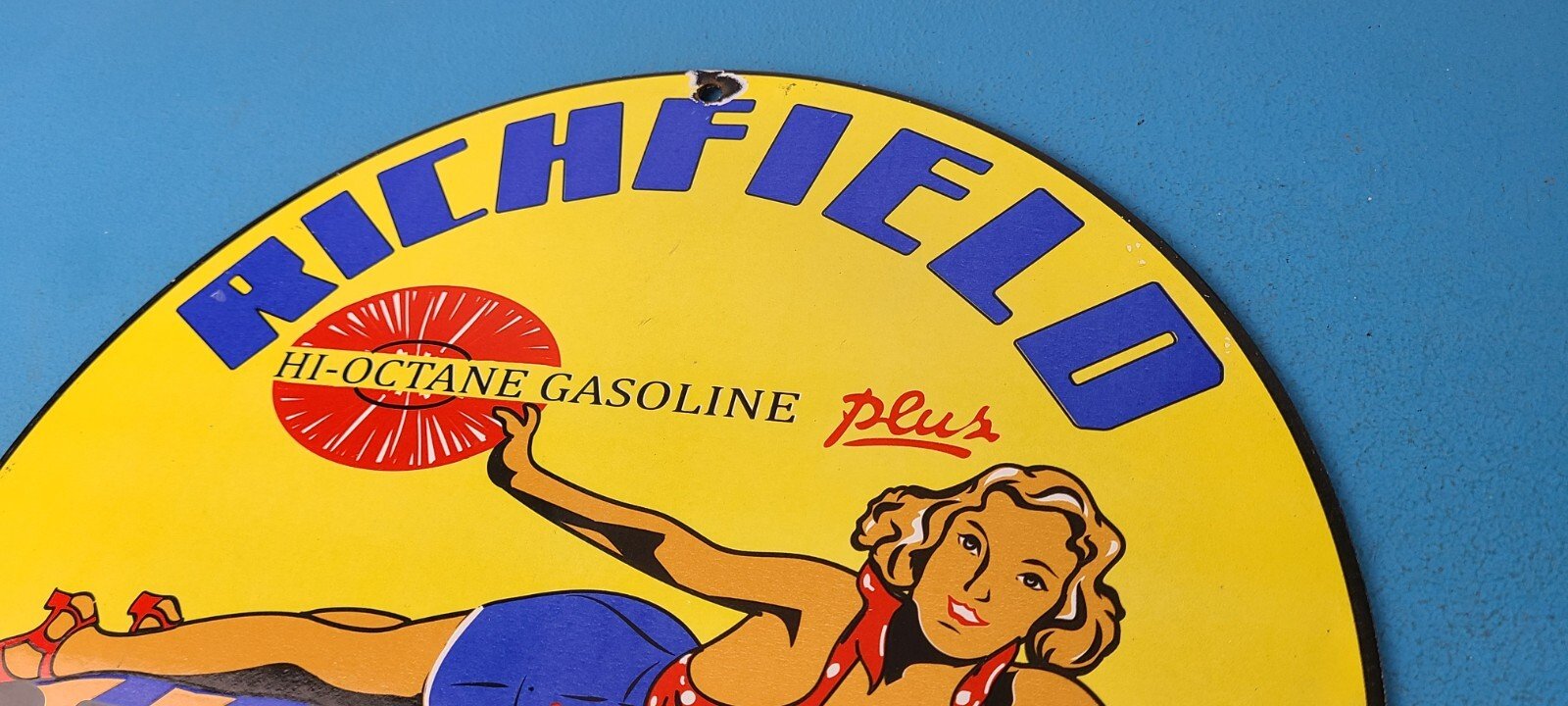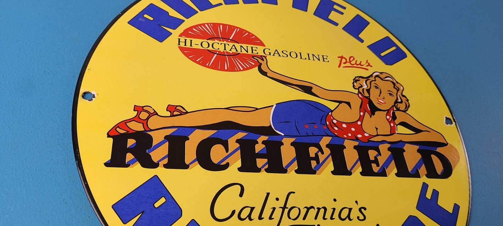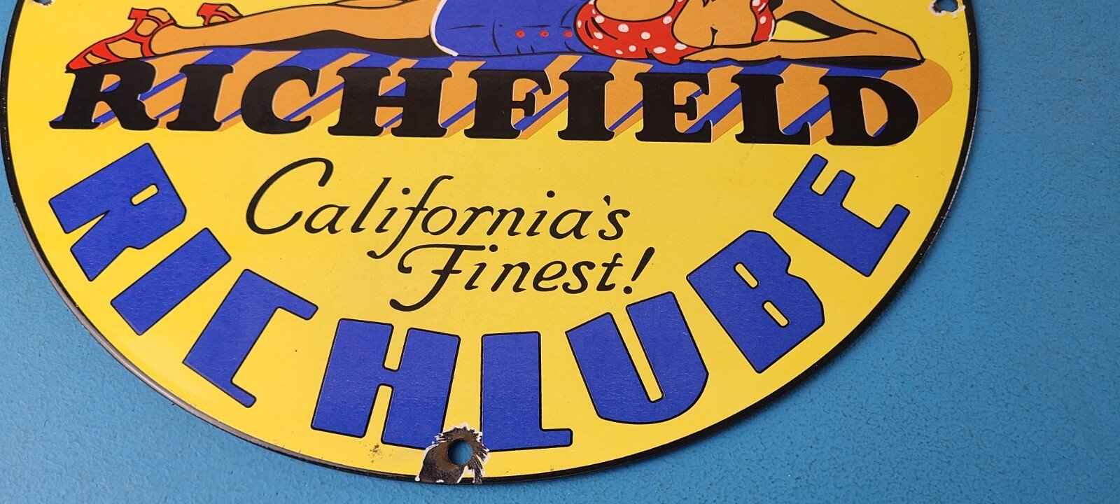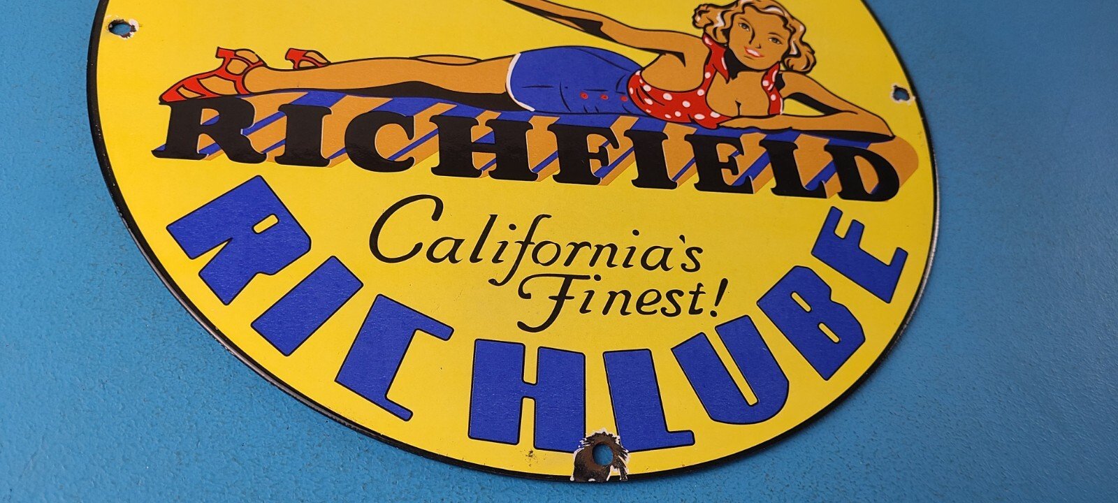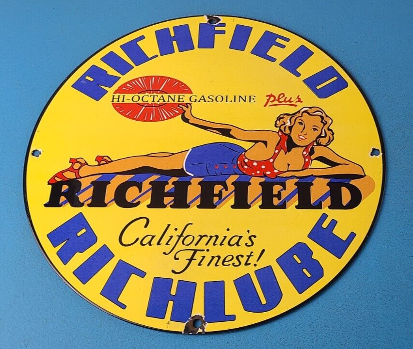 For sale is a vintage Richfield Gasoline porcelain Richlube, gas service station & motor oil sign. This sign has excellent colors and gloss. Sign measures 11 3/4″. Check out my other auctions, and feel free to ask questions. Perfect for gas collectors, automobile enthusiasts, sign collection, man cave, restaurant, bar, garage, displays anywhere. See my other gas & motor oil, aviation, automotive, soda & beverage signs. $10 for shipping anywhere in the U.S. with Priority Mail. Shipping will be $5.00 for each additional item! Thank you!