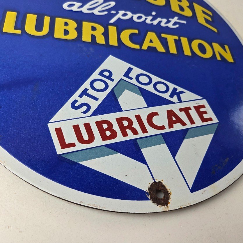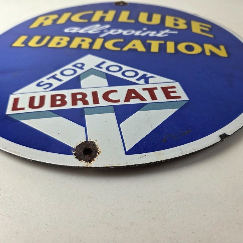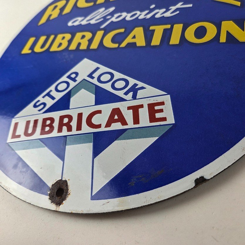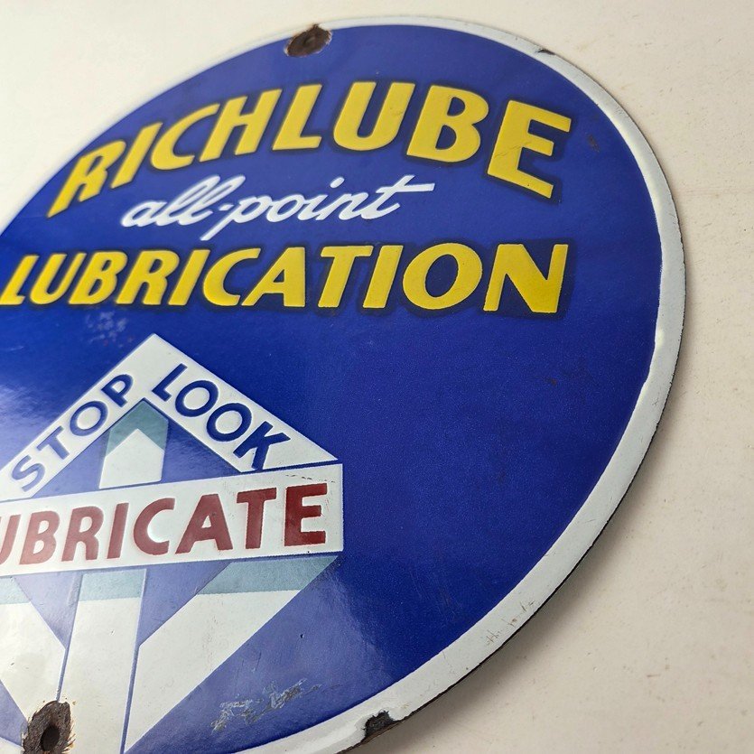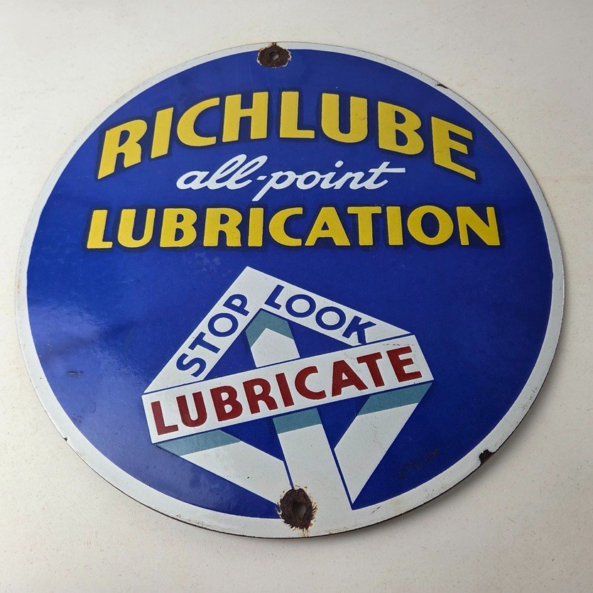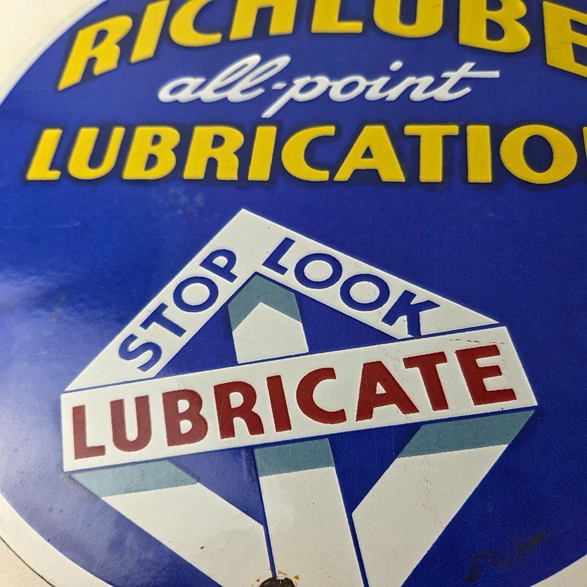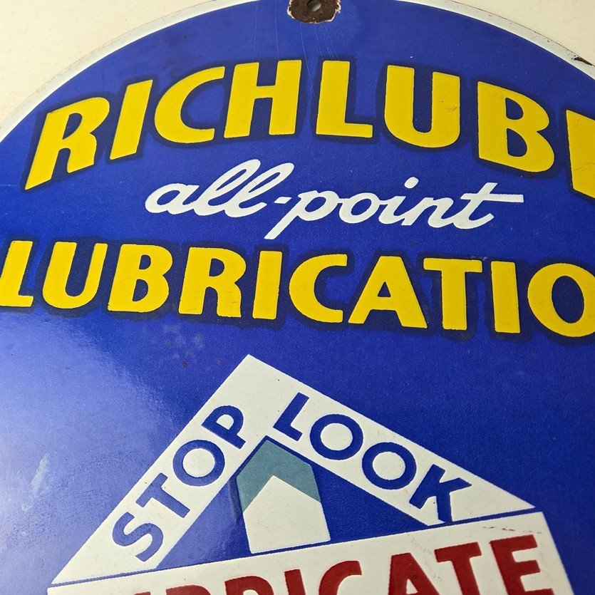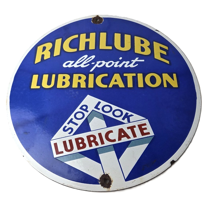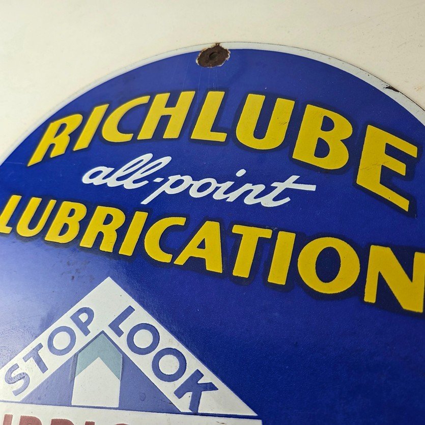 This vintage Richlube All-Point Lubrication porcelain sign features the large yellow lettering that Richfield is known for and is the perfect addition to any gas and oil or advertising collectibles collection. This sign has excellent colors and porcelain on both sides.