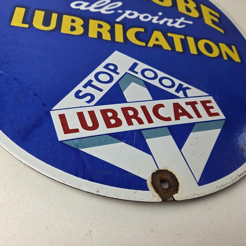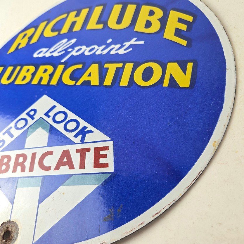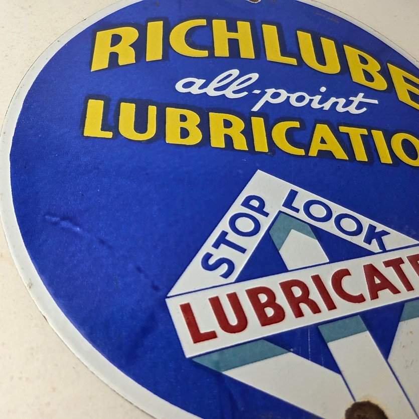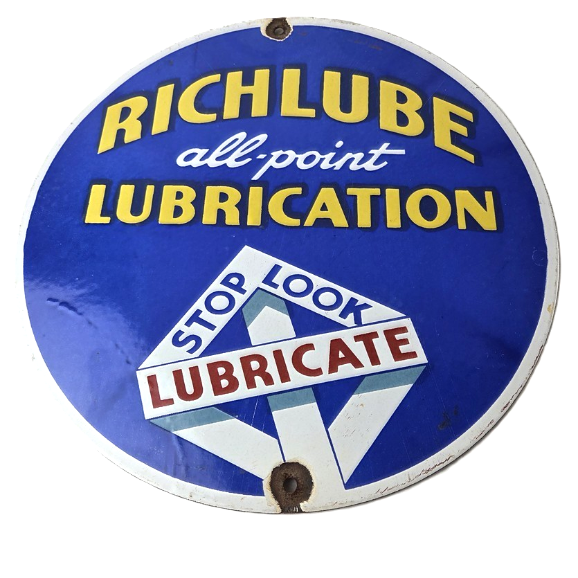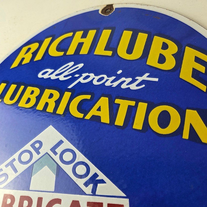 This vintage Richlube All-Point Lubrication porcelain sign features the large yellow lettering that Richfield is known for and is the perfect addition to any gas and oil or advertising collectibles collection. This sign has excellent colors and porcelain on both sides.