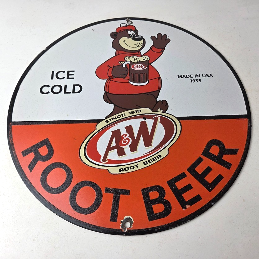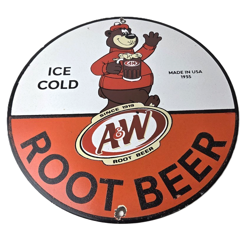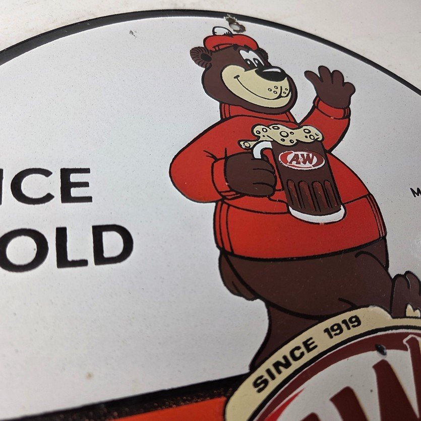 This vintage A&W Root Beer porcelain sign features the iconic bear with the A&W graphic soda theme. Add a vintage touch to your gas station or soda beverage collection with this A & W Root Beer sign. Measuring 12 inches in size, this sign has excellent colors and porcelain.