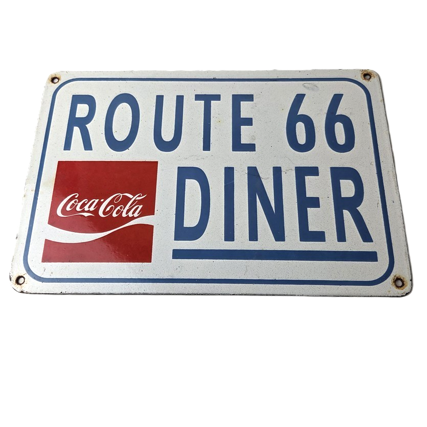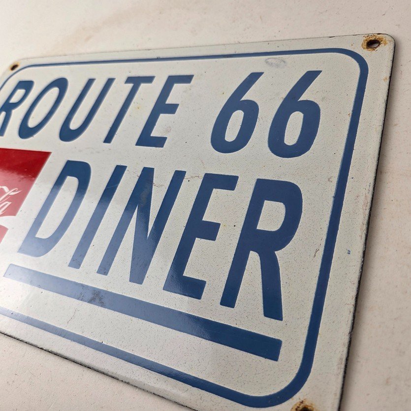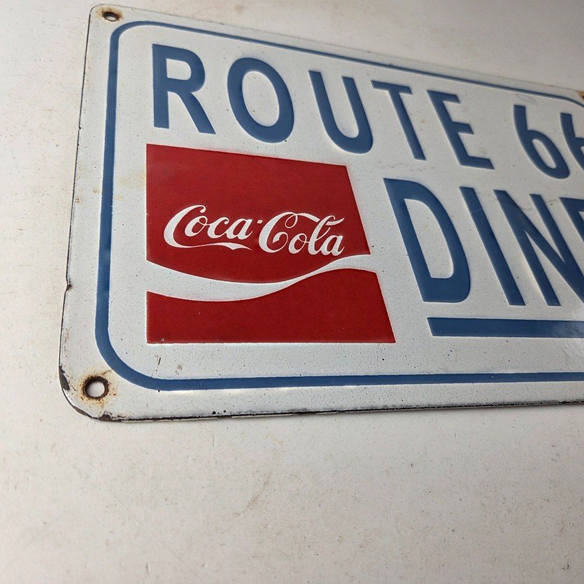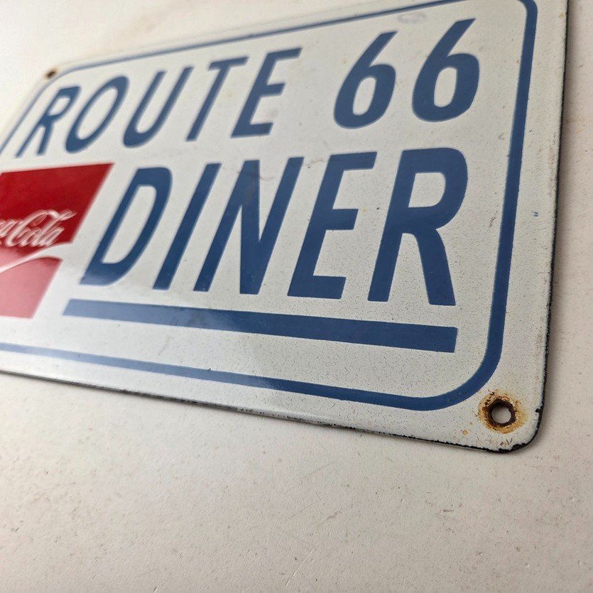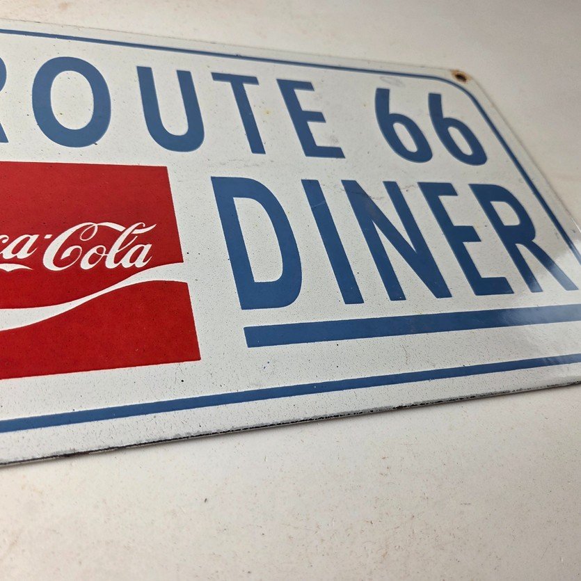This is a vintage Coca Cola porcelain sign featuring the iconic Route 66 Diner lettering. If you love retro gas and oil memorabilia, or the classic soda signs, you will appreciate this sign. It measures 12 inches by 8 inches tall and is in excellent condition. It has vivid colors and gloss and is in great condition.