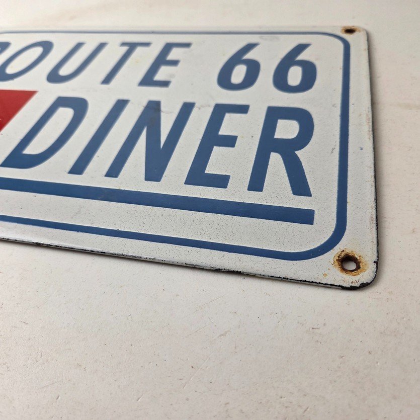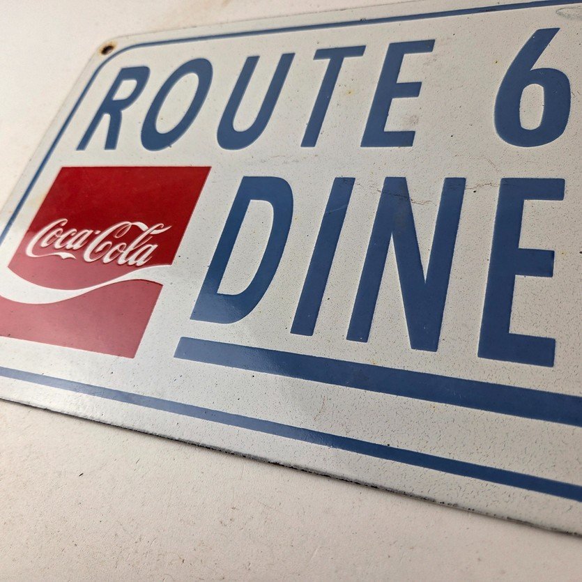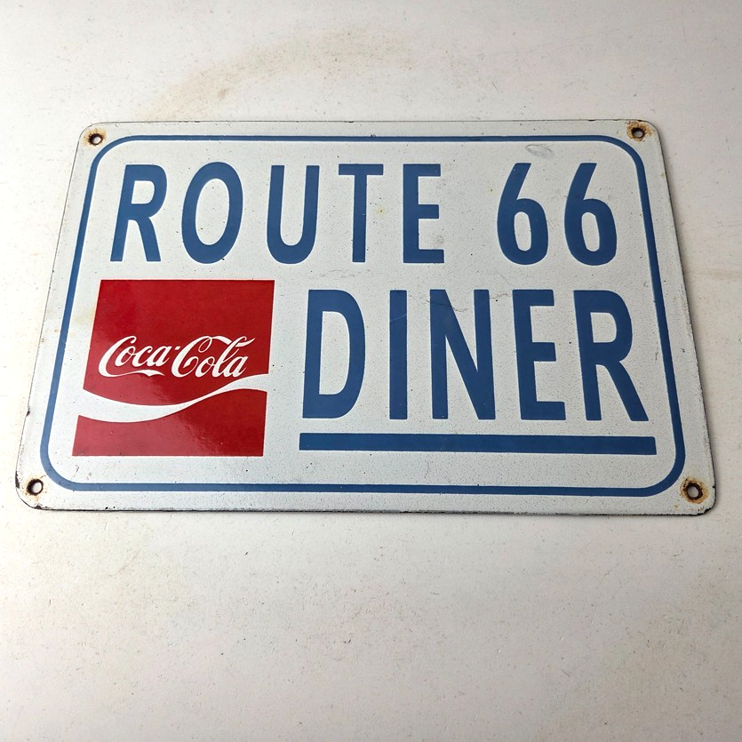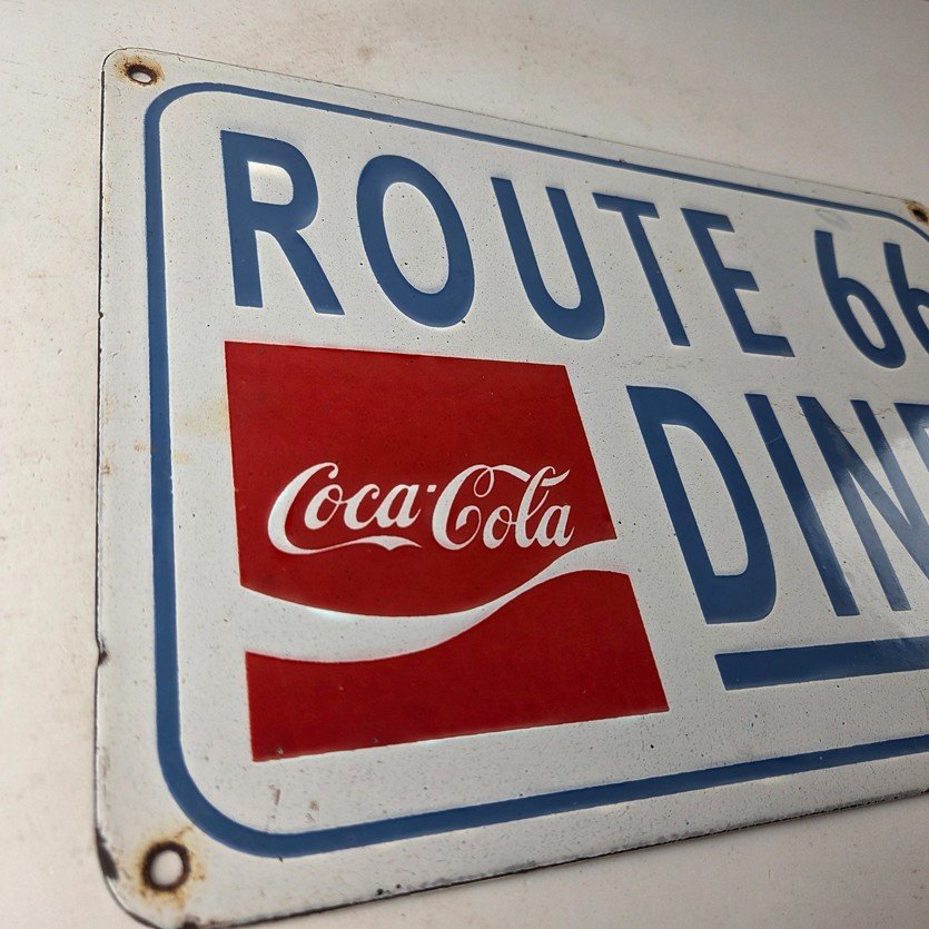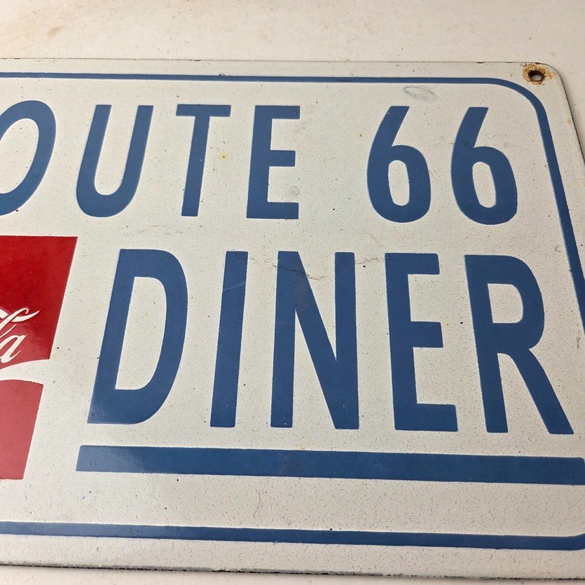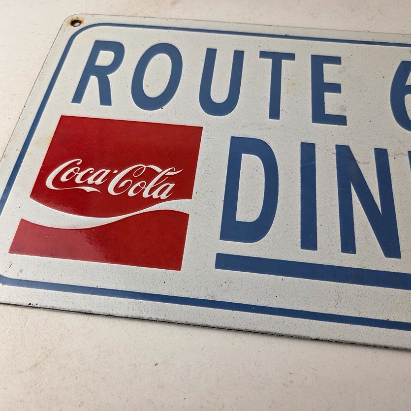This is a vintage Coca Cola porcelain sign featuring the iconic Route 66 Diner lettering. If you love retro gas and oil memorabilia, or the classic soda signs, you will appreciate this sign. It measures 12 inches by 8 inches tall and is in excellent condition. It has vivid colors and gloss and is in great condition.