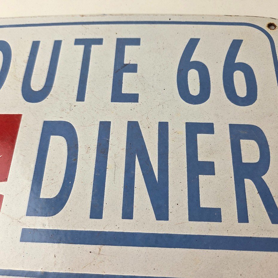 This is a vintage Coca Cola porcelain sign featuring the iconic Route 66 Diner lettering. If you love retro gas and oil memorabilia, or the classic soda signs, you will appreciate this sign. It measures 12 inches by 8 inches tall and is in excellent condition. It has vivid colors and gloss and is in great condition.